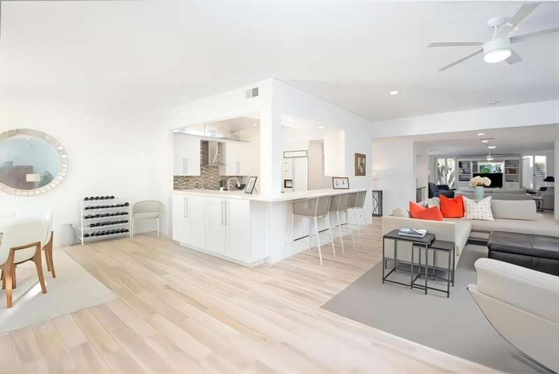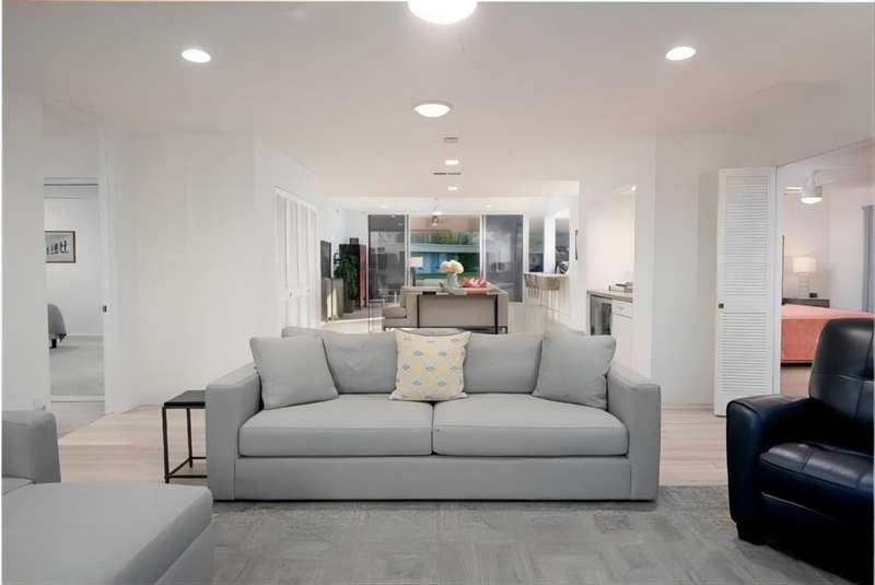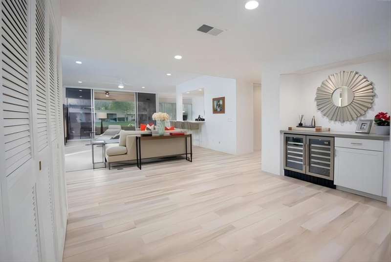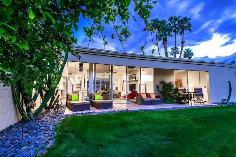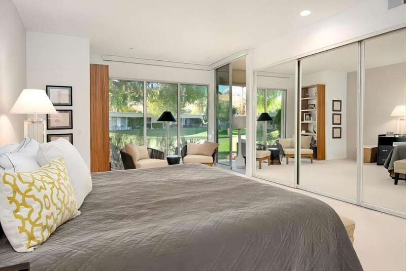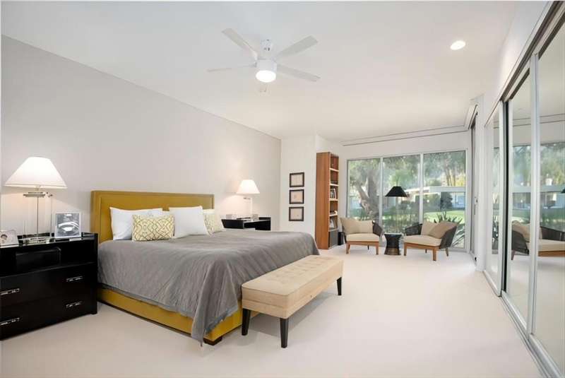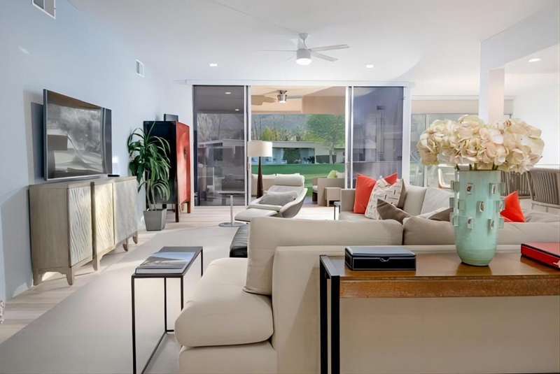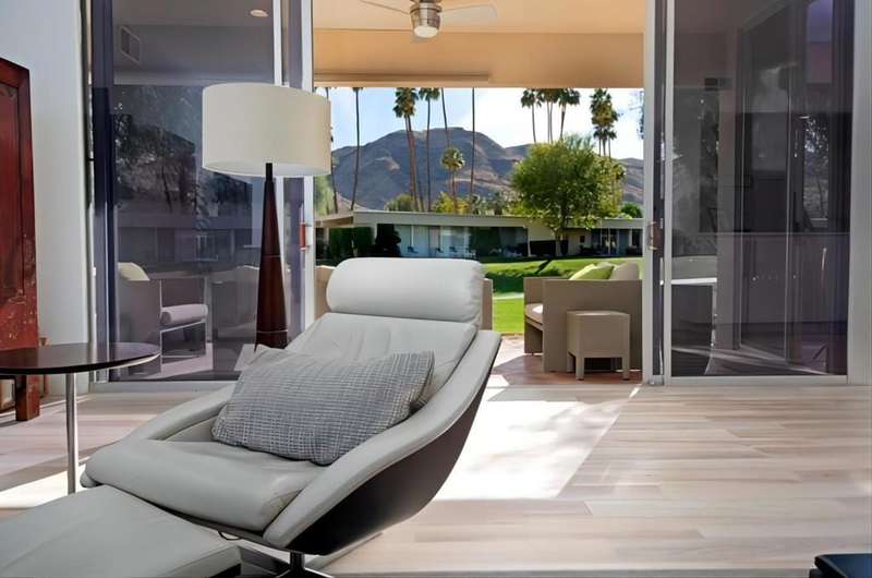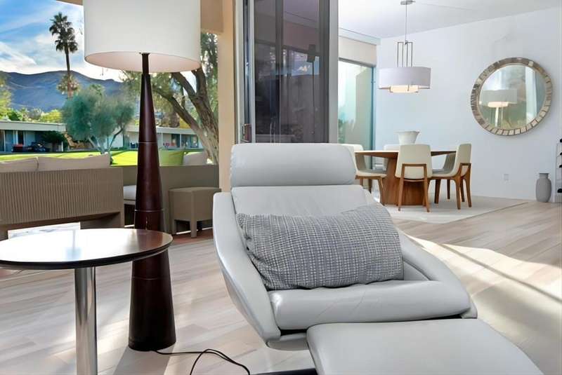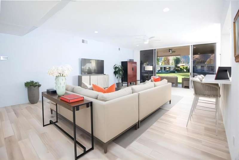 Vacation at the renowned SEVEN LAKES Golf Course and Country Club in this exquisite 3-bedroom, 3-bath mid-century modern home. It is a true masterpiece. In a prime location within the community, this free-standing property boasts 2,604 sq. ft. of meticulously renovated serenity, enhanced by beautiful southern views of the mountains and fairways. A low density community with expansive outdoor spaces. Ideal for unwinding or entertaining. Inside, very attractive high-end features include a private sauna, a chef's kitchen outfitted with premium finishes. Wine enthusiasts will appreciate the 68-bottle wine chiller, while those seeking productivity can work in the desk area of the second bedroom. In unit, full-size laundry. One private garage space. 15 Pools and outdoor spas, built in BBQ areas, a challenging Ted Robinson designed Par 58 golf course, where President Eisenhower hit his only hole-in-one on the course! On site club designed by William Cody. This fully turnkey-furnished home is available for a minimum one-month stay or longer. The only community in Palm Springs with 24 hr guard gated entry. Maximum occupancy, 4 adults. Not suitable for children. No Pets. No smoking. Nov-May: $8000/mo June-Oct: $5550/mo. Booked: through April 30, 2026. Next available date May 2026.