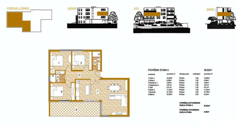 Apartment S-5 - 2nd floor - living area 85.82 m2 (3 bedrooms + 2 bathrooms) + covered balcony (18 m2 - south) + outdoor parking space 12.5 m2, total net area 97.95 m2 = 320,873 EUR