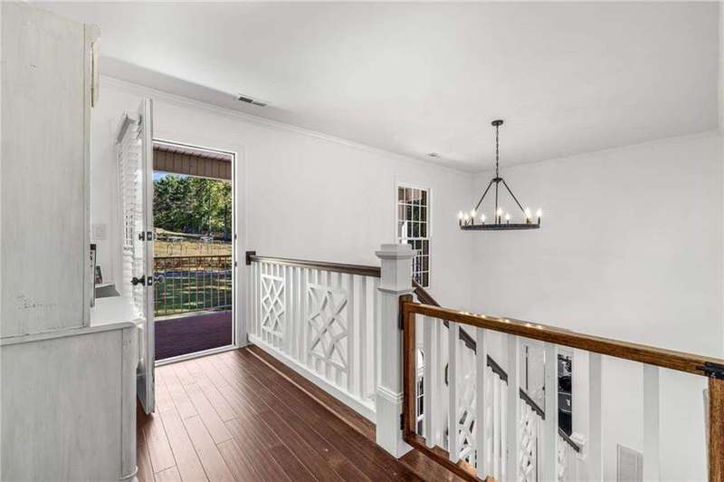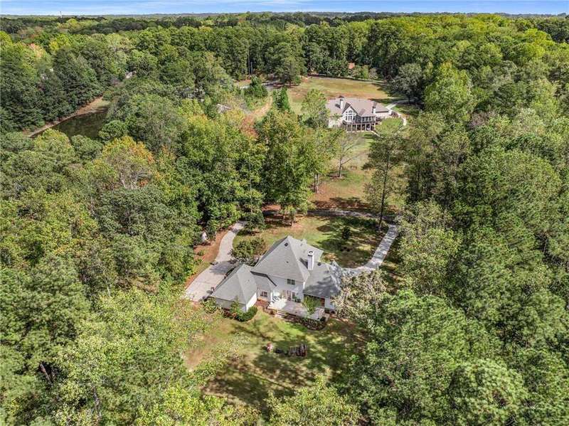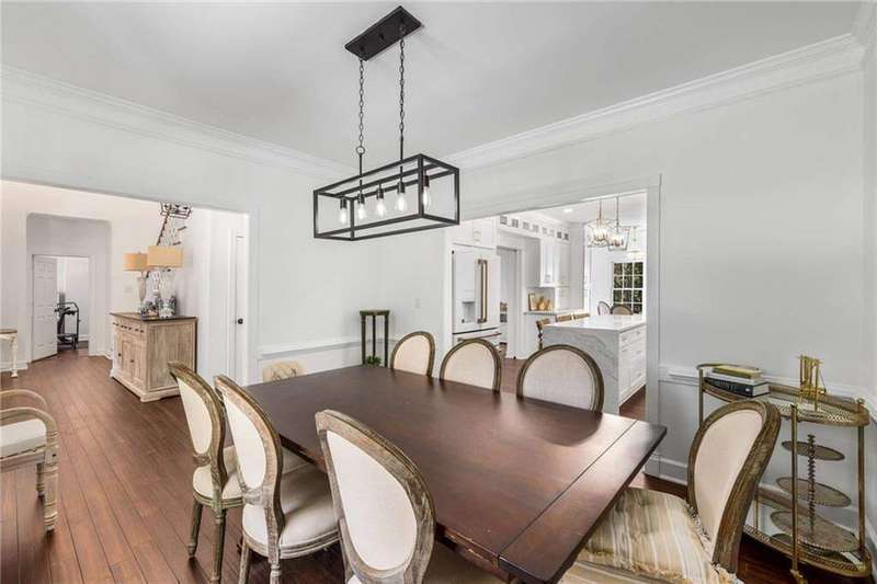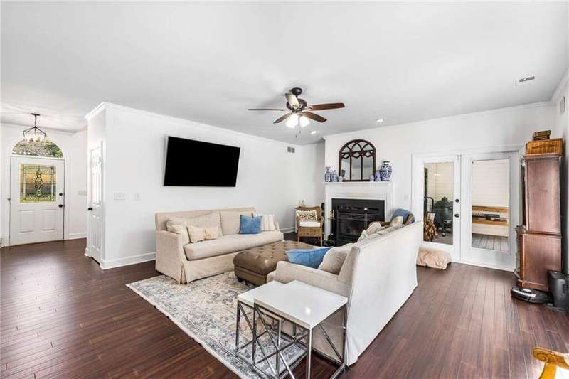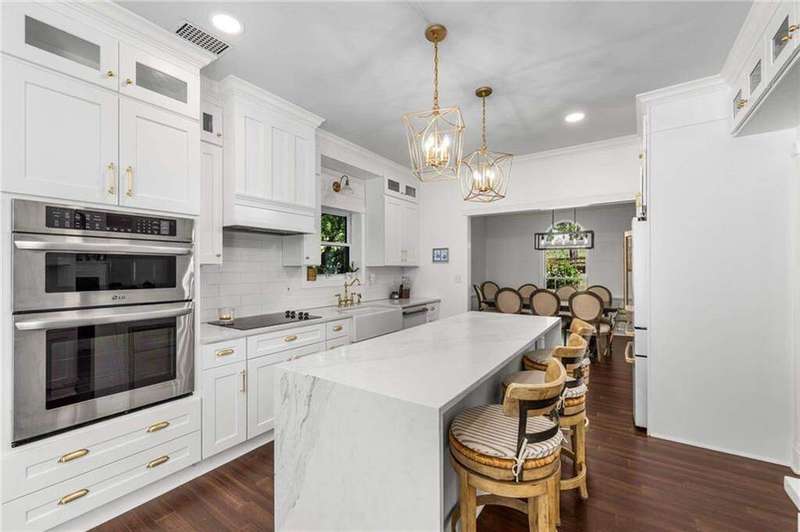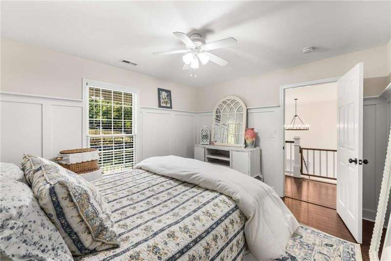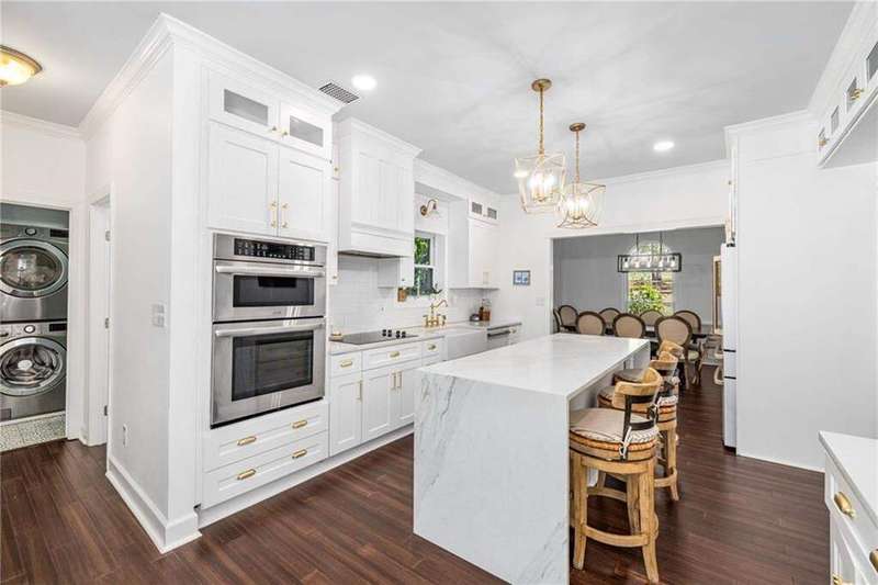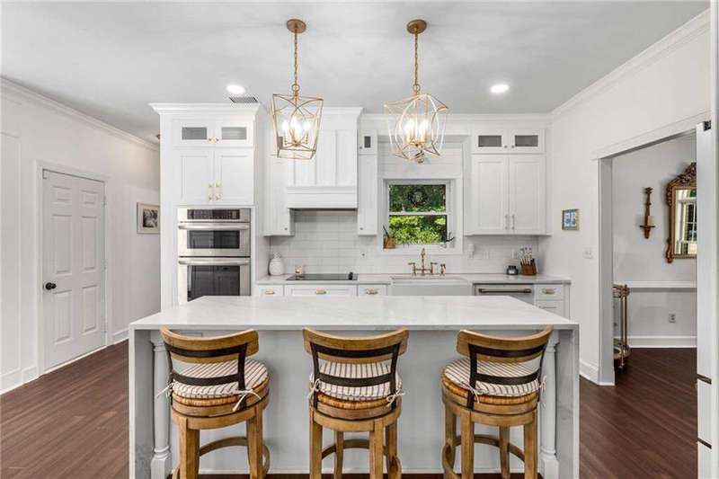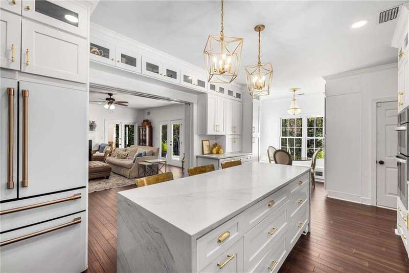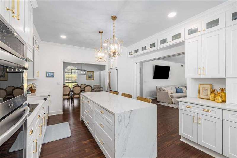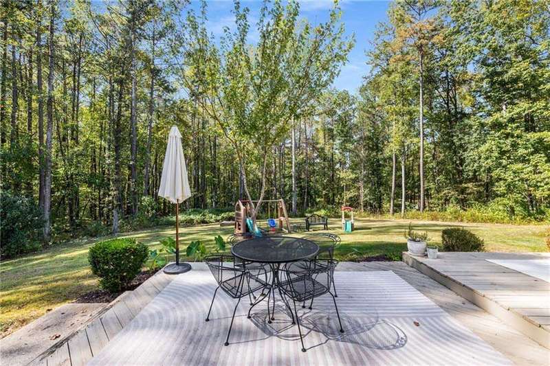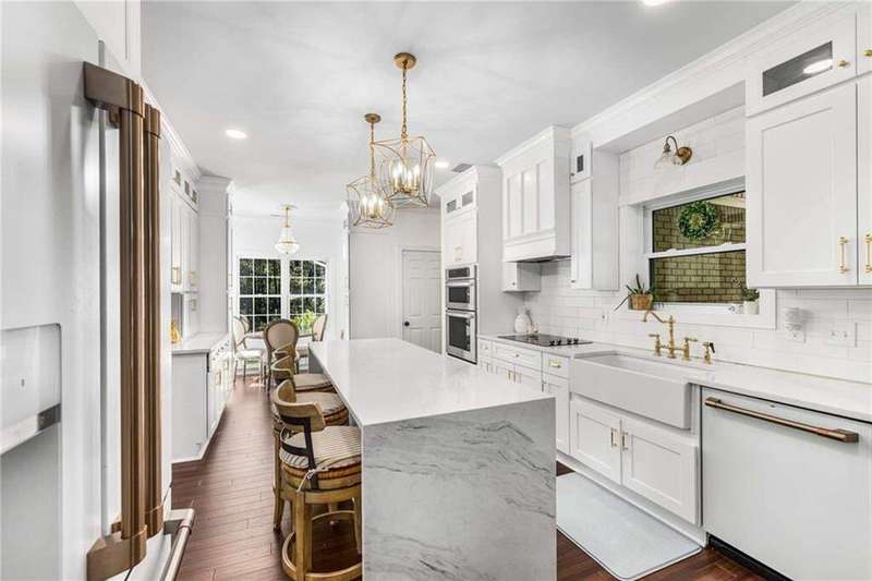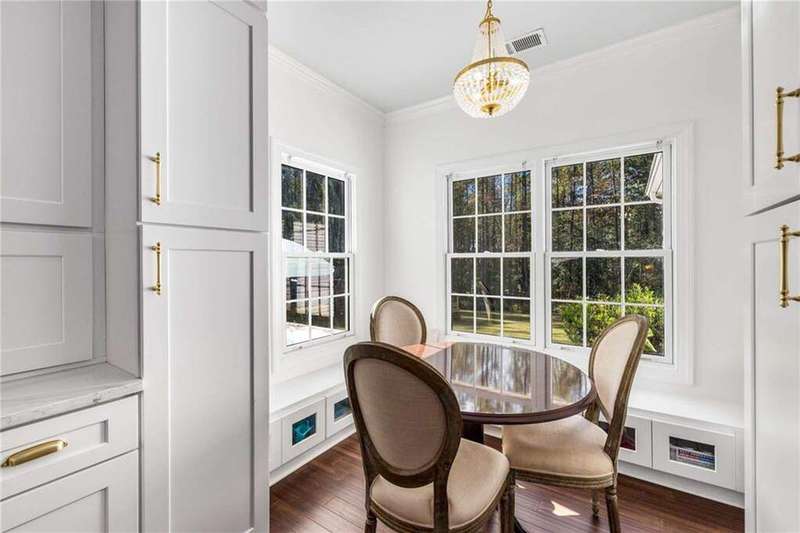 Privately tucked on 4.6 serene, wooded acres, this timeless three-sides brick Colonial blends privacy with polished sophistication and lives like a bespoke estate. A top-to-bottom refresh delivers a truly move-in-ready experience: dark bamboo wood flooring throughout the entire home sets a warm, contemporary tone; a custom-designed staircase railing anchors the entry; and every space has been thoughtfully elevated for daily comfort and effortless entertaining. The completely reimagined kitchen showcases an improved layout with widened openings to the dining and living rooms, including pocket doors for flexible flow. Culinary details impress, cooktop relocated to the back wall with exterior venting, custom cabinetry topped with quartz counters, tile backsplash, and a larger waterfall-edge island with seating. A farmhouse sink with Kingston Brass faucet and a charming breakfast nook with built-in bench complete this magazine-worthy space. Just off the main living areas, the renovated laundry room is both chic and practical-new tile, custom cabinets, quartz countertops with single-slab quartz backsplash, a stainless utility sink, deep enough for dog baths, new faucet, and a built-in dog kennel neatly tucked beneath the cabinetry. The primary suite on the main remains a serene retreat with beautifully refinished cabinetry, granite countertops, soaking tub, dual vanities, and two walk-in closets. Upstairs, smart planning created two full baths where there was once one: a new hall bath with shower/tub combo, fresh tile floors and walls, decorative trim, new vanity and fixtures; and a new private en-suite for the bedroom suite, featuring a stand-up shower, coordinated tile, decorative millwork, vanity, fixtures, and toilet. Secondary bedrooms are generous, and a custom built-in bunk, Twin over Queen, with bookshelf adds function and fun for guests or kids. French doors from the fireside family room open to a large, beautiful deck overlooking a sun-splashed, more open backyard. With coveted zoning for Dowell ES, Smitha MS, and Osborne HS, this residence pairs rare acreage and a quiet setting with curated finishes and modern systems-a luxury escape in the heart of Marietta.