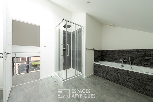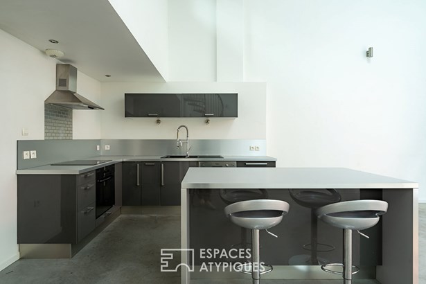 Located in Lomme, in the sought-after Sud-Marais district, this 125 sqm loft (Carrez law) is the result of the renovation of a former paint factory. Nestled in the peace and quiet of a secure courtyard, it seduces with its spectacular volume, its 6-meter high ceilings, and its raw ambiance with industrial tones.