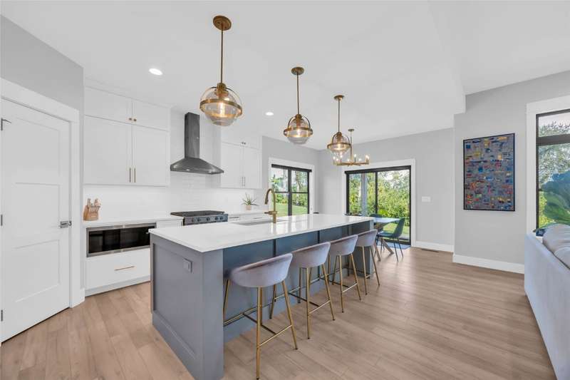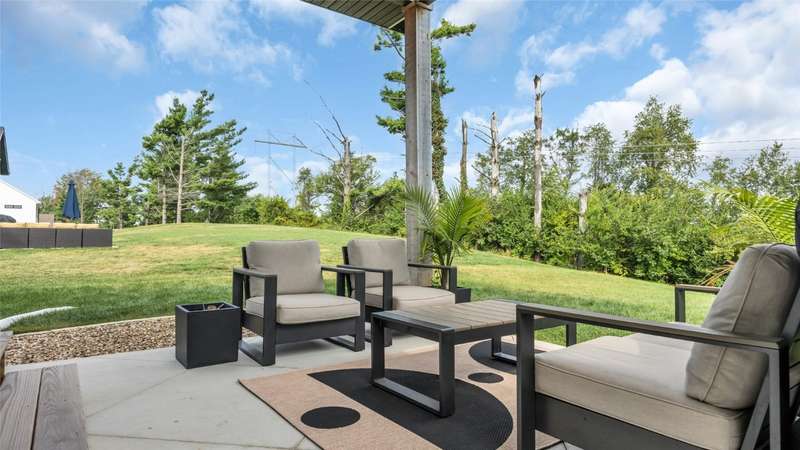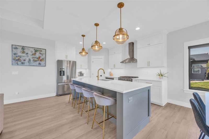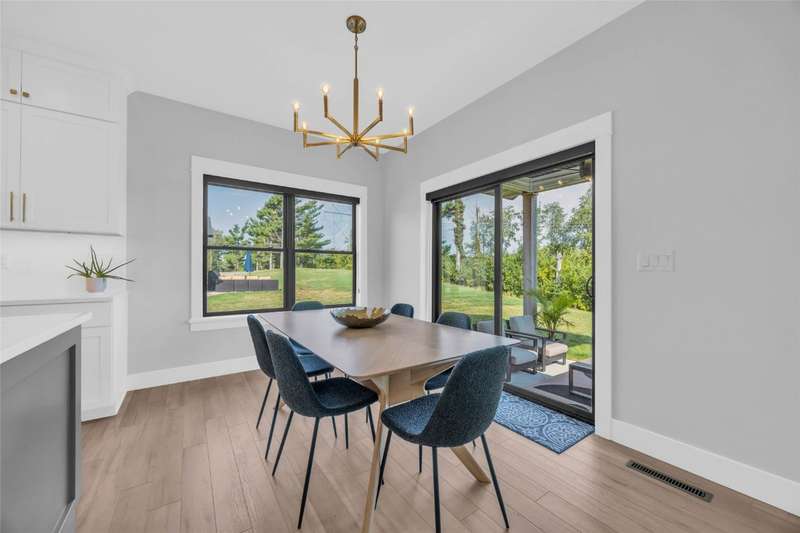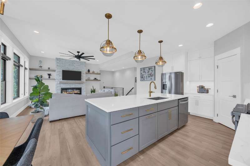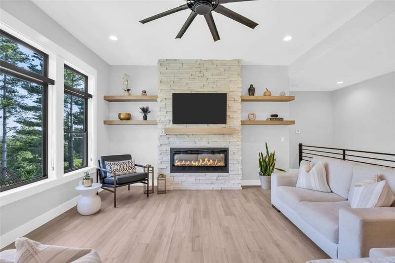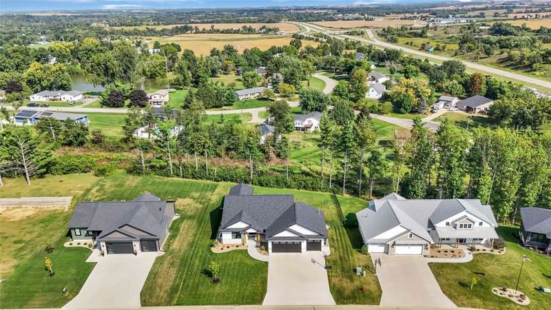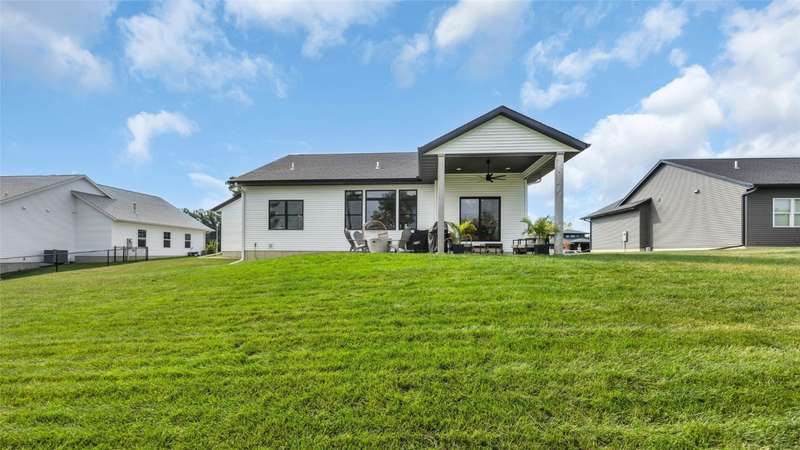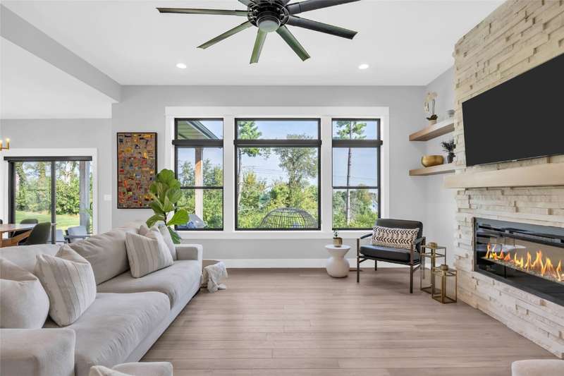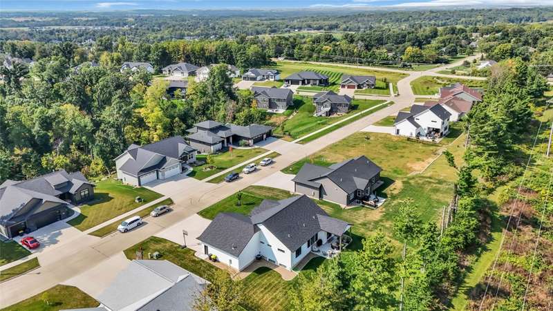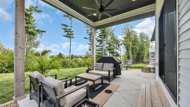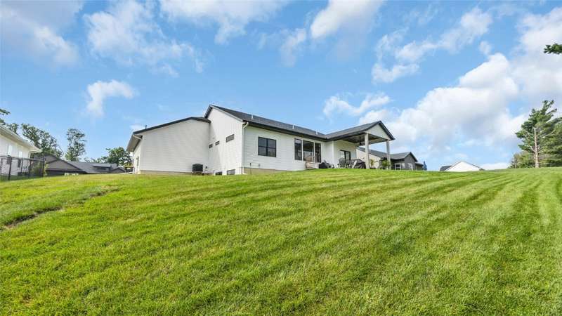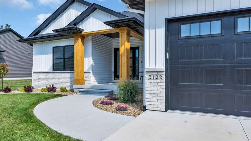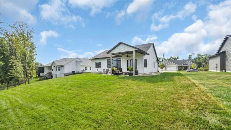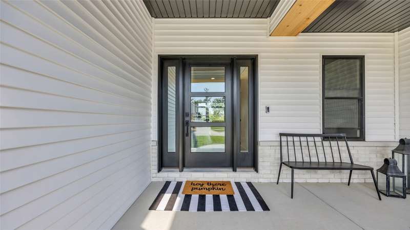 Step into luxury with this 2022 custom-built home in the sought-after Dell Ridge Estates. Welcomed by a charming front covered porch, you’ll find a great modern floor plan with white oak natural flooring, vaulted ceilings in the primary suite, and convenient access from the primary bedroom to the laundry. The chef’s kitchen showcases Calcutta gold quartz countertops, stainless steel Whirlpool appliances, and a walk-in pantry, opening to a spacious living area anchored by a striking floor-to-ceiling stone fireplace. Tons of upgrades throughout include Marvin black windows, wood-encased trim, and a 3-stall garage with flat driveway, floor drains, and pre-stubbed heat. Outdoor living is equally impressive with a covered back patio backing to mature trees—perfect for relaxing evenings or entertaining guests. The finished lower level expands your living space with a large rec room ideal for a theater room, a wet bar, plus two additional bedrooms and a full bath—perfect for family or guests. Located with easy access to Highway 380, Dell Ridge Estates also features a stocked neighborhood pond for fishing and peaceful weekends. This home blends elegance, comfort, and function in every detail.