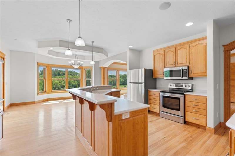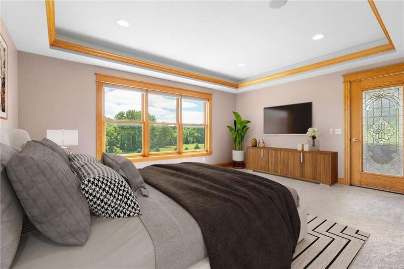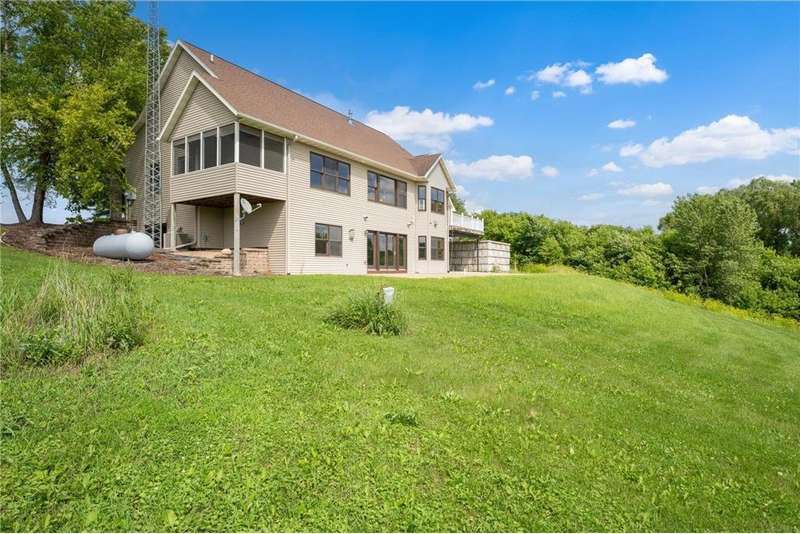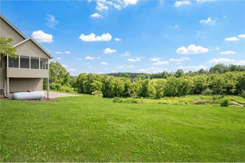 Experience country living at its finest in this stunning 5-bedroom, 4-bath walkout ranch set on over 4 peaceful acres with a private pond and breathtaking views. This home offers true main-floor living with solid hardwood floors, a spacious open layout, and a dedicated laundry/mudroom just off the garage. The private primary suite features a walk-in tile shower, soaking tub, and generous closet space for your retreat-style comfort. Enjoy in-floor heat with 4-zone controls throughout for year-round efficiency and comfort. The oversized attached garage includes a prestressed garage below, perfect for extra storage, a workshop, or your hobby space. Step outside to a massive deck and patio ideal for entertaining or soaking in the scenery. Whether you’re hosting gatherings or enjoying a quiet evening by the pond, this property offers the perfect blend of space, functionality, and tranquility.