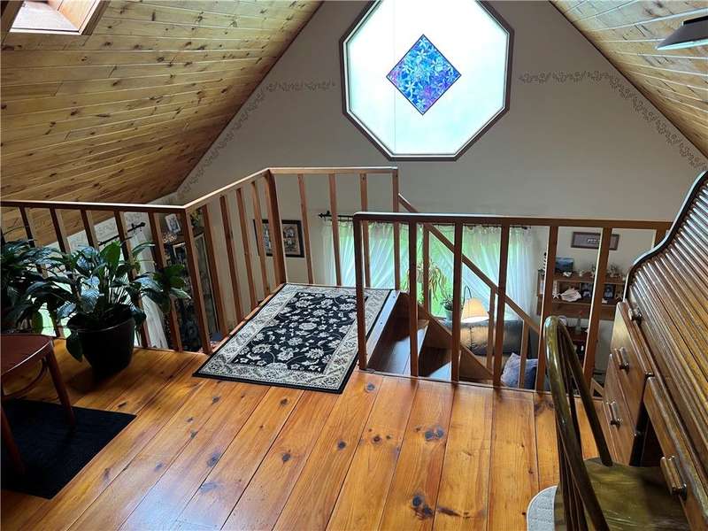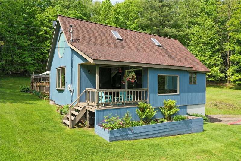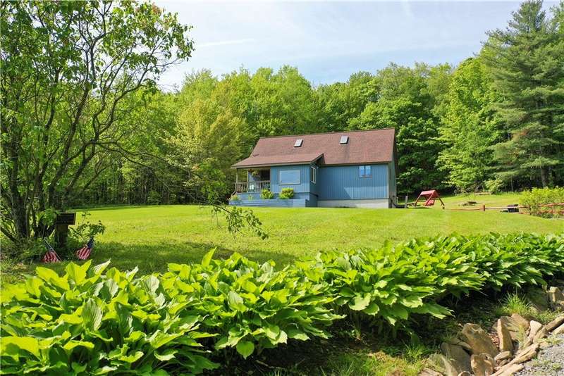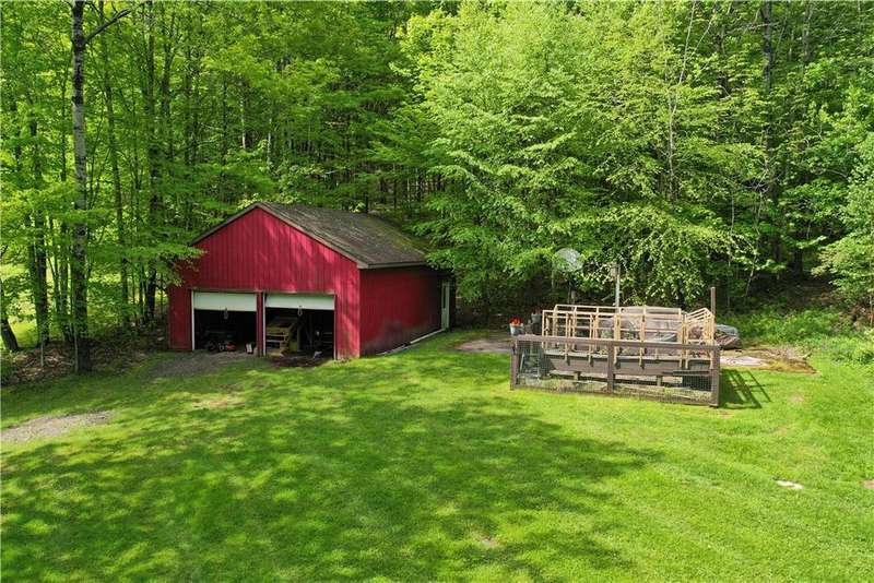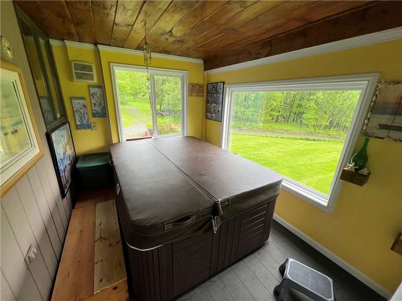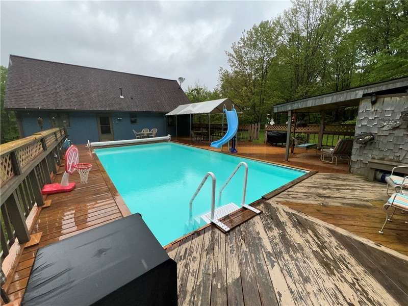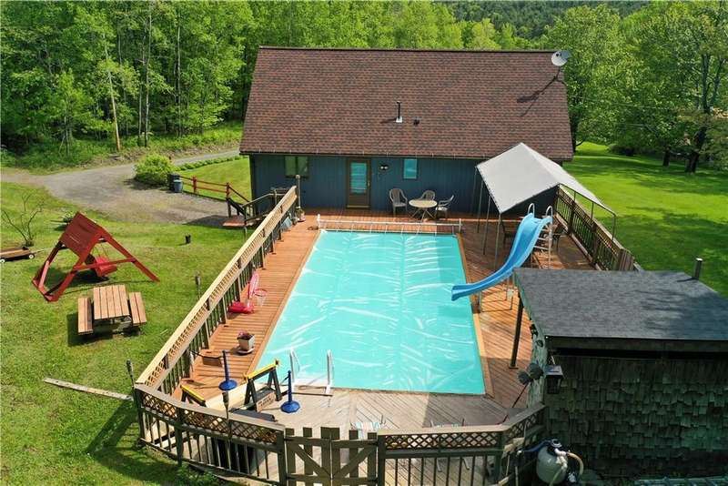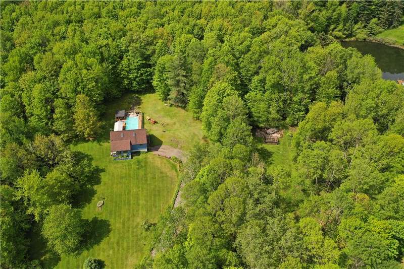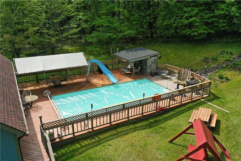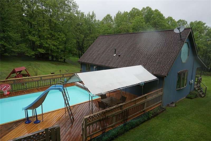 Private, secluded, serene contemporary home on 8-acre lot among rolling hills quickly brings you back to nature. Open floor plan with living and dining rooms with kitchen under a sweeping knotty pine cathedral ceiling. Primary bedroom above in large, skylighted 250+ SF loft space, two carpeted bedrooms on first floor with renovated, radiant floor-heated full bath. Relax while watching deer and wildlife on the sweeping front lawn on your covered front porch or three-person window-enclosed hot tub room. Summer barbecues are even sweeter after cooling off after taking a dip in the pristine 32'x16' in-ground pool and deck surround with pool house as a frog looks over a nearby water feature. Walkout basement with second bath, stacked laundry, workshop and two finished rooms for office, exercise or guest room spaces. Back-up generator. Detached two-car garage and raised-bed gardens are a few steps away. A short drive to Walton, Delhi and I-88.