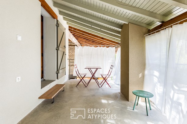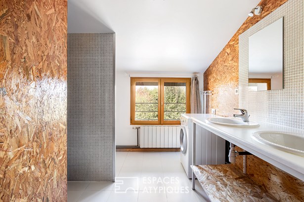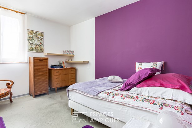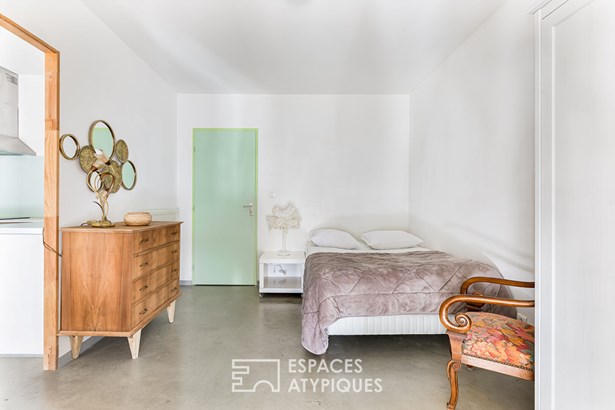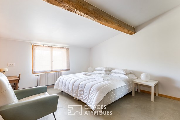 A bedroom with a private bathroom completes the ground floor, while the upper floor accommodates four bedrooms and two bathrooms, designed for everyday comfort. The existing chimney flue suggests the possibility of installing a fireplace, further reinforcing the warm atmosphere of the place. Attached to the house, the four one-bedroom apartments each offer a unique setting. Some feature raw OSB finishes and a touch of workshop flair, while others benefit from a private terrace or unobstructed views of the three-hundred-year-old tree that guards the property's entrance. All feature a functional layout and a high level of comfort, allowing for immediate use or adaptation as needed. Outside, the charm is instantly felt. The meticulously maintained grounds offer rare privacy thanks to their dense vegetation and protective hedges.