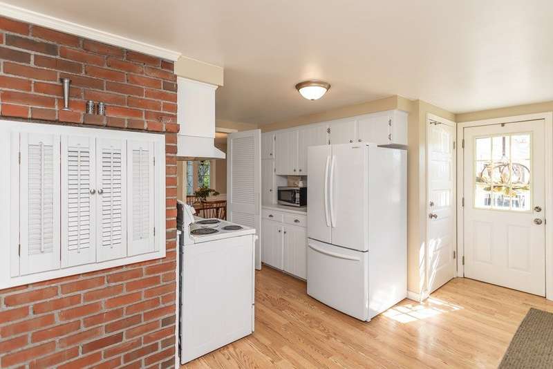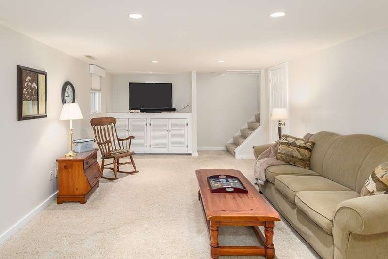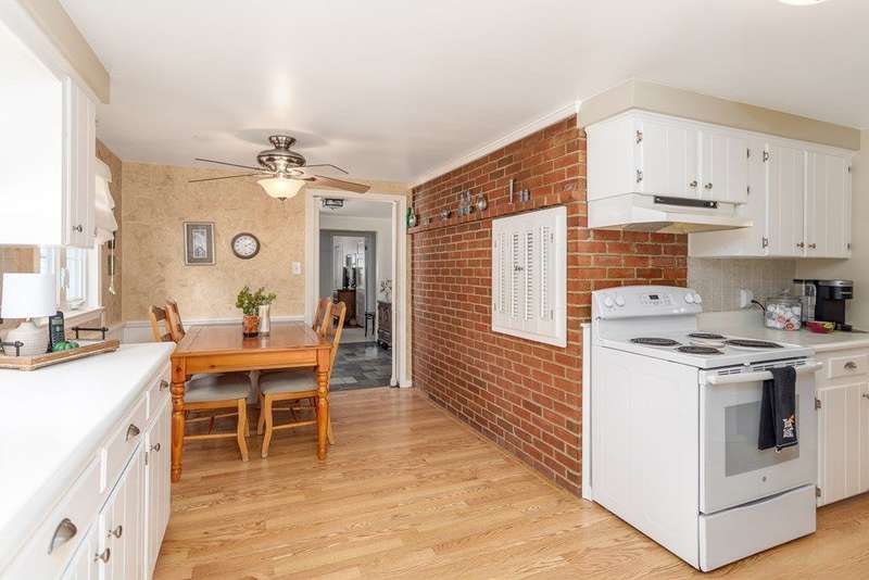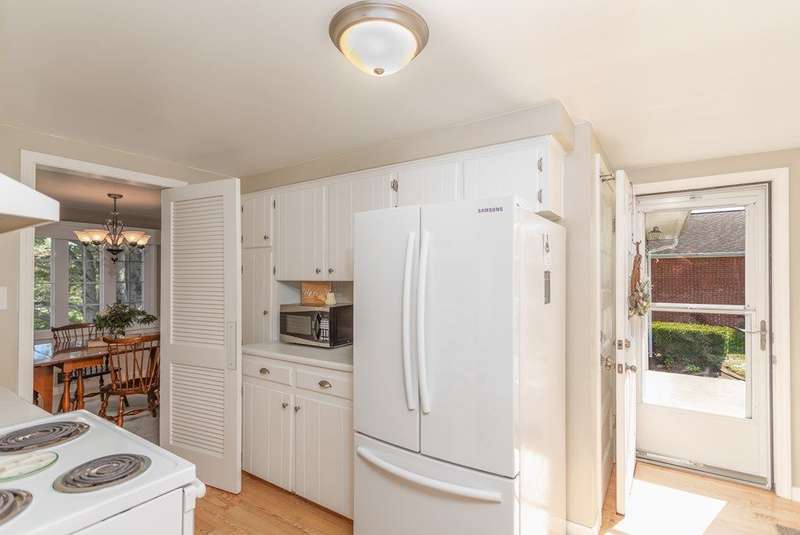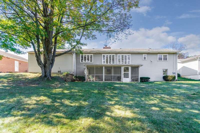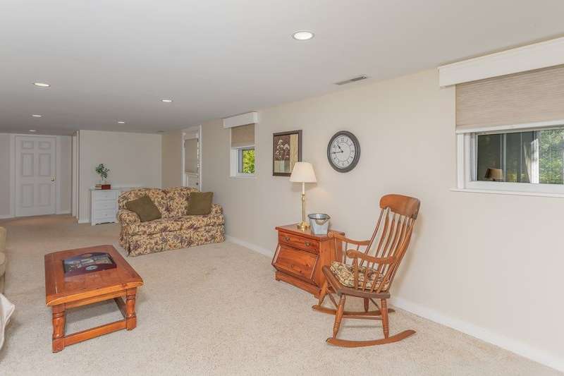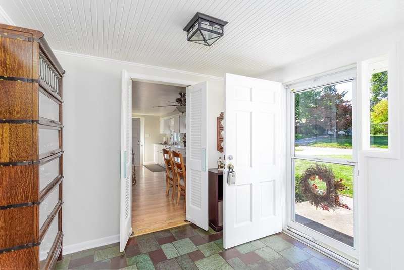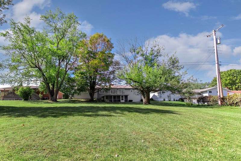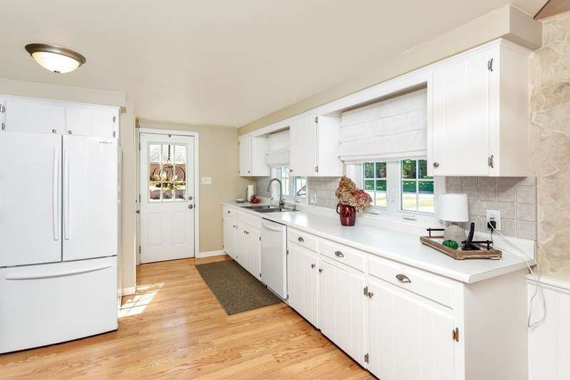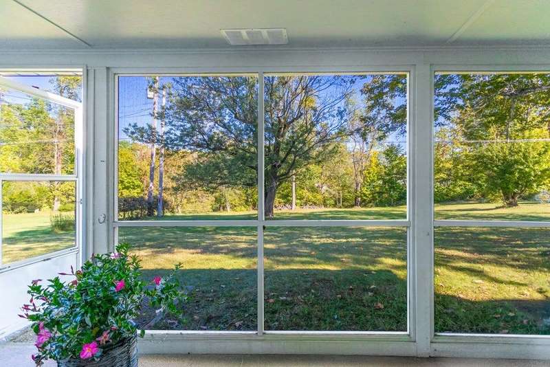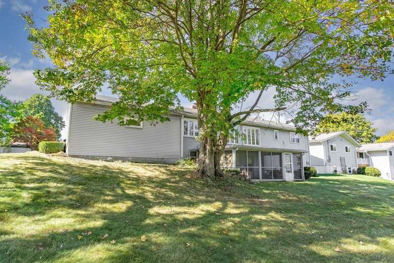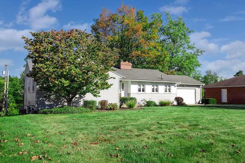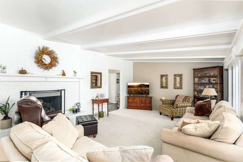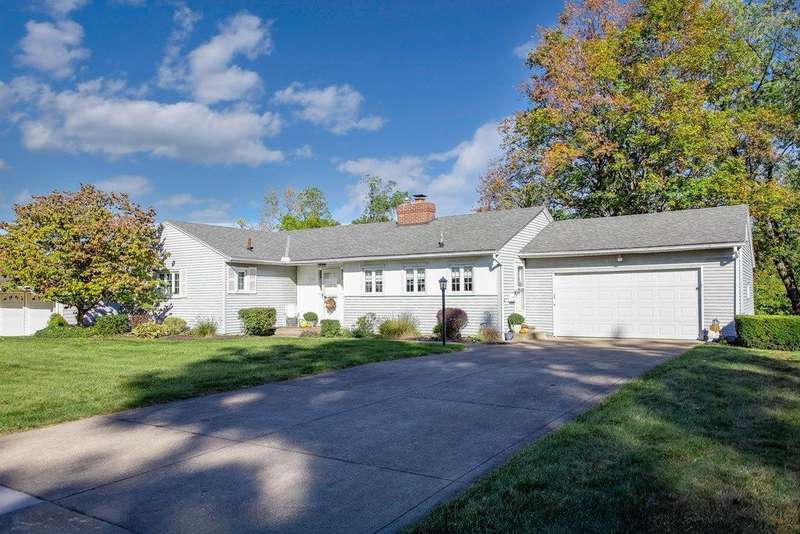 Over 1400 sq ft of main floor living and another 900 sq ft in the finished lower level. This quality-built ranch offers exceptional square footage and a prime location. The living and dining rooms impress with vaulted beamed ceilings, a gas log fireplace, and a wall of windows trimmed in crisp white, showcasing views of the private lot. The main floor features a spacious primary suite, select hardwood floors, and a fully applianced kitchen with sunny eating nook, plus laundry on both levels. The walkout basement adds a family room, half bath, screened porch with brand new roof, large workshop, and abundant storage. An oversized 2.5-car garage with newly finished Nature Stone flooring completes this outstanding home.