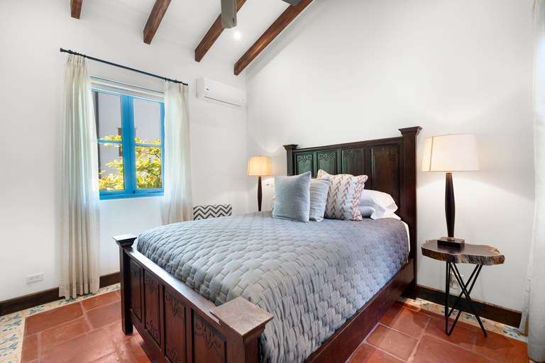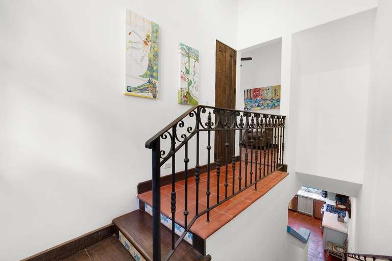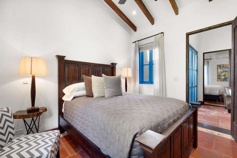 Upstairs, a cozy sitting area connects two spacious bedrooms, each with an en-suite bathroom. The primary suite features a private balcony overlooking the lush surroundings and peaceful streets of Calle Cartagena.