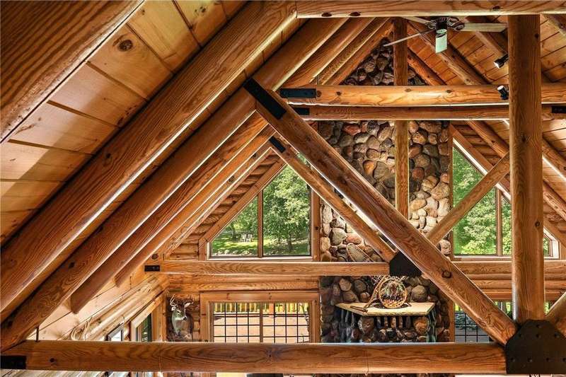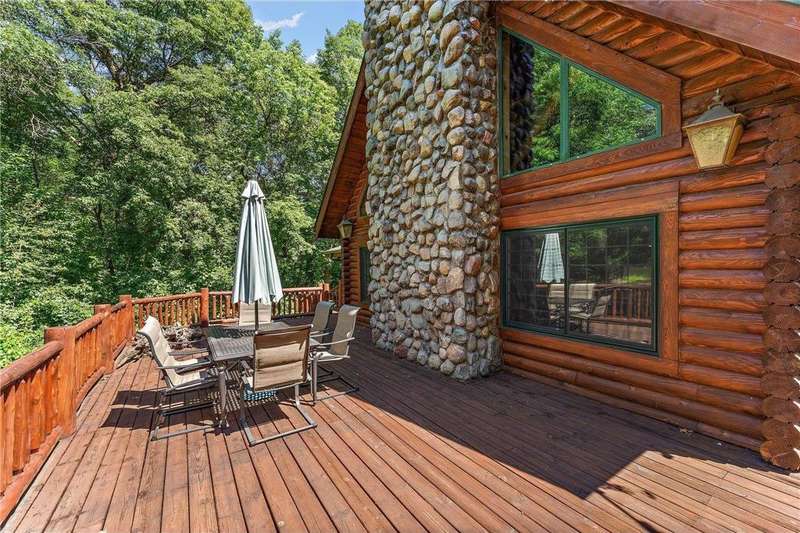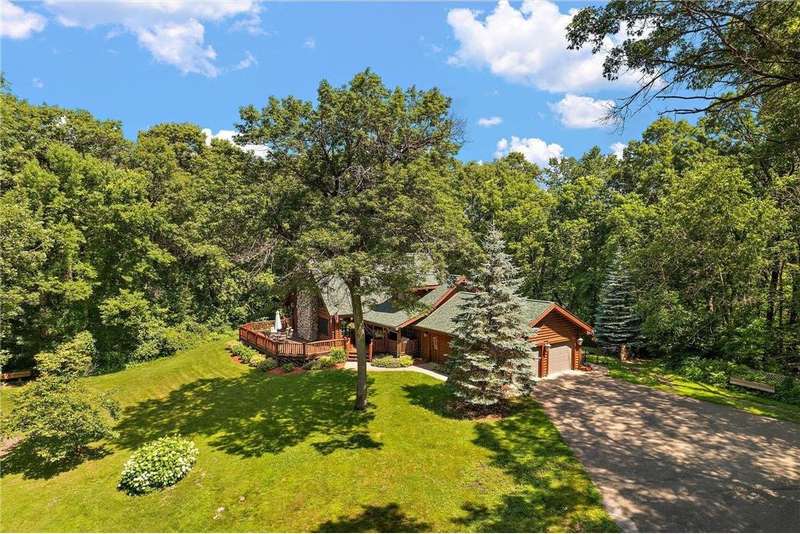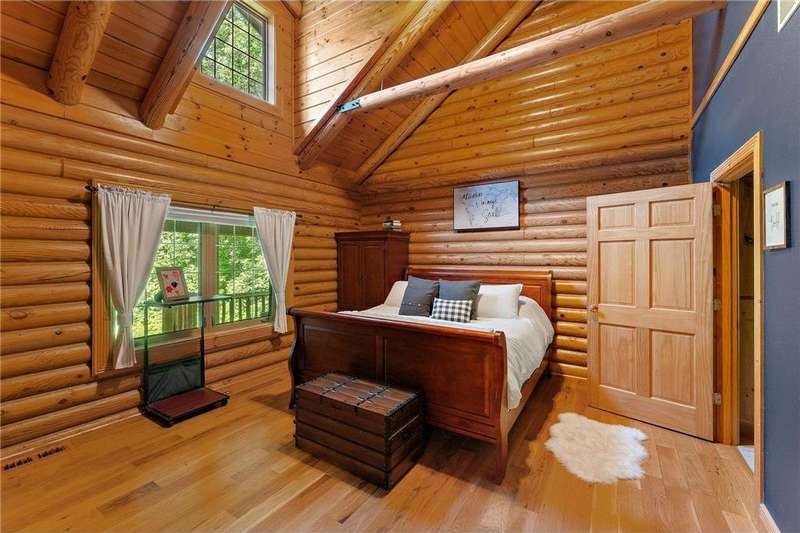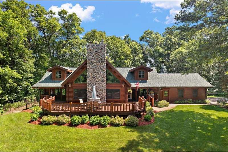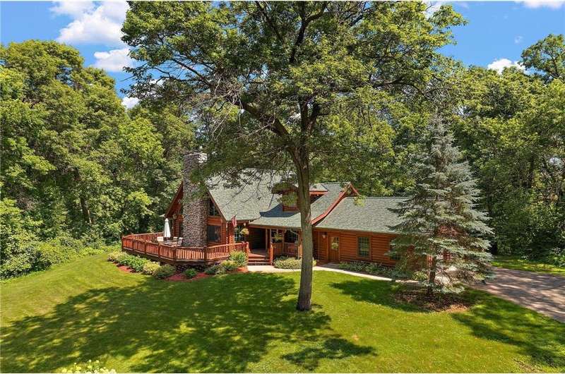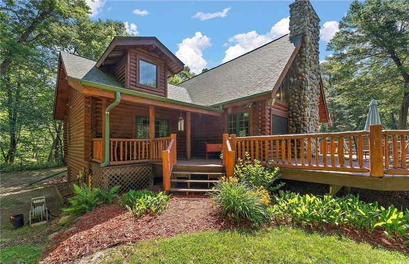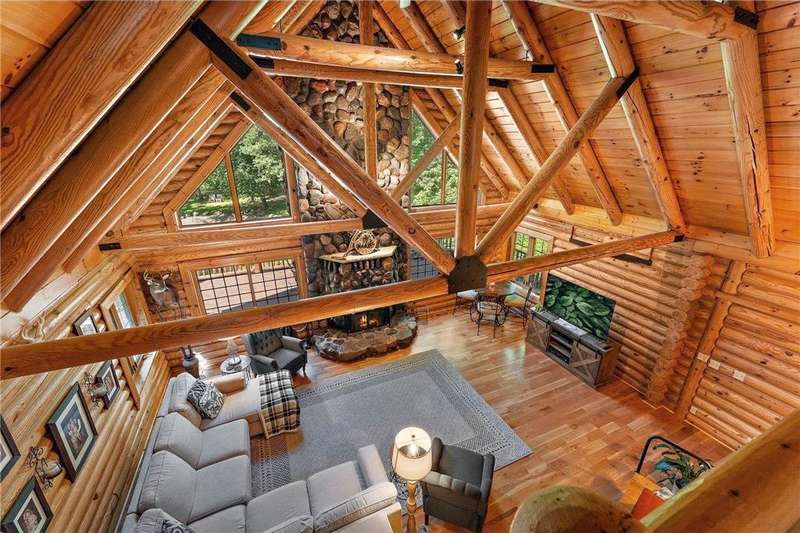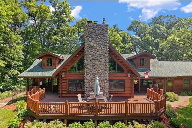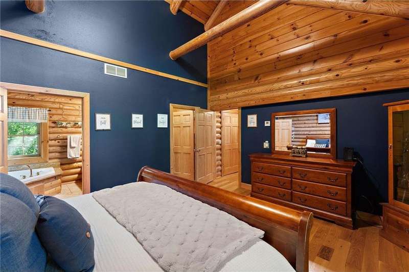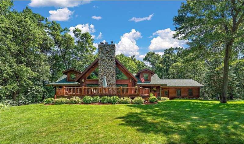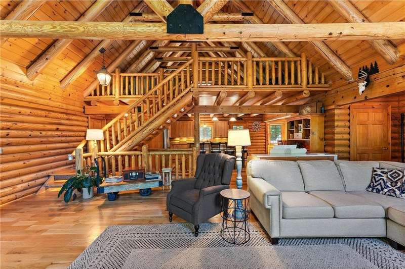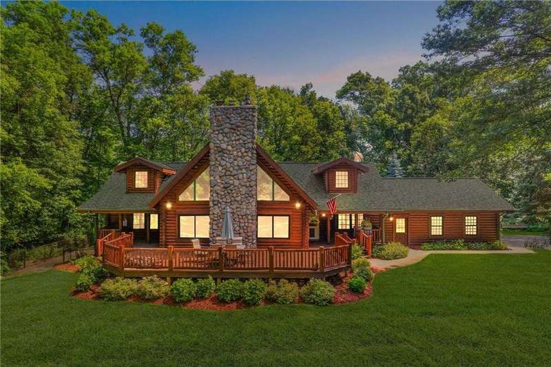 Extraordinary opportunity to own this beautiful log home, nestled on 8.93 acres! The winding driveway draws you into the tree-lined road as the log home suddenly appears in the open park-like clearing, complete with a massive front deck, hand-built stone fireplace and gorgeous windows. The two-story Great Room draws your eyes upwards as you note the beauty of the timbers, logs and cross-beams, the room height, the tall windows, and the two-story hand-built stone fireplace. As you look up, you will note the upper level loft which opens to the Great room - perfect for movie time or for your home office. Spacious kitchen has hickory cabinets, new SS appliances, granite counters, pantry, and kitchen window that overlooks the backyard. Plenty of space for food prep on the center island and two ovens to prepare for any hosted event! Convenient access to the back deck for your BBQ or morning coffee. The separate dining room has a bay area which overlooks the backyard, and includes a glassed built-in hutch with so much storage and drawer space. Beautiful Primary bedroom includes impressive vaulted ceiling with window, private three-quarter bath with jetted tub, double sinks, windows overlooking the treed yard, and a large walk-in closet complete with shelving. Main floor laundry room and storage is just off the main hallway. A separate bedroom on main is on the opposite side with vaulted ceiling, tall windows, spacious closet, situated across from the three-quarter bathroom. The finished lower level opens to a huge family room complete with a second gas fireplace and built-in shelving. The game room is ready for you to add your foosball or game table. A separate space is perfect for your home office or playroom. Two more bedrooms and a third three-quarter bathroom offer great space. Storage space is neatly tucked behind doors in the game room, additional wood shelving space in the utility room. This home has been meticulously maintained and includes a newer roof, refinished hardwood flooring, new washer and dryer, new garage doors, replaced windows, re-stained railings, newer furnace, new water softener, chain-link fenced area in the backyard, and more! Great yard, shed, and acreage to explore, or enjoy your hammock, or sit and watch nature. Welcome to your beautiful new home!