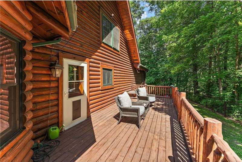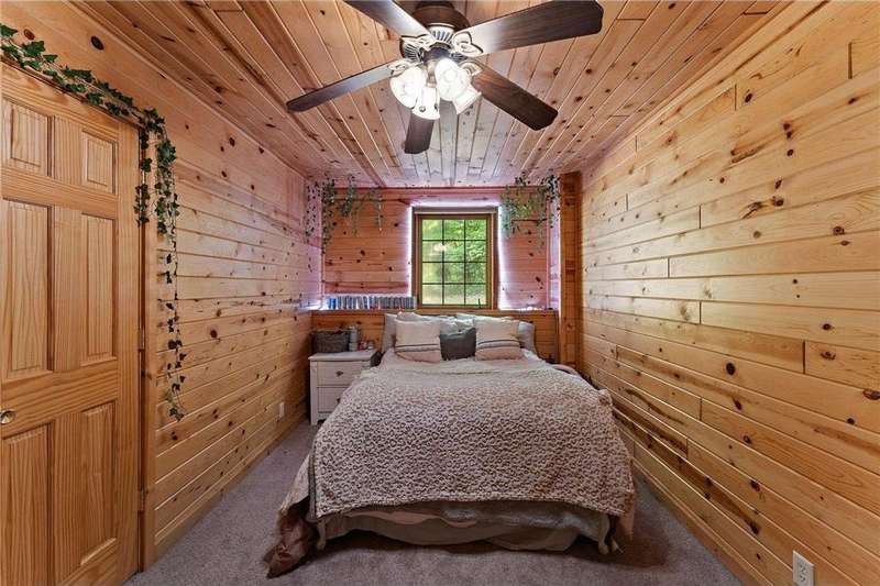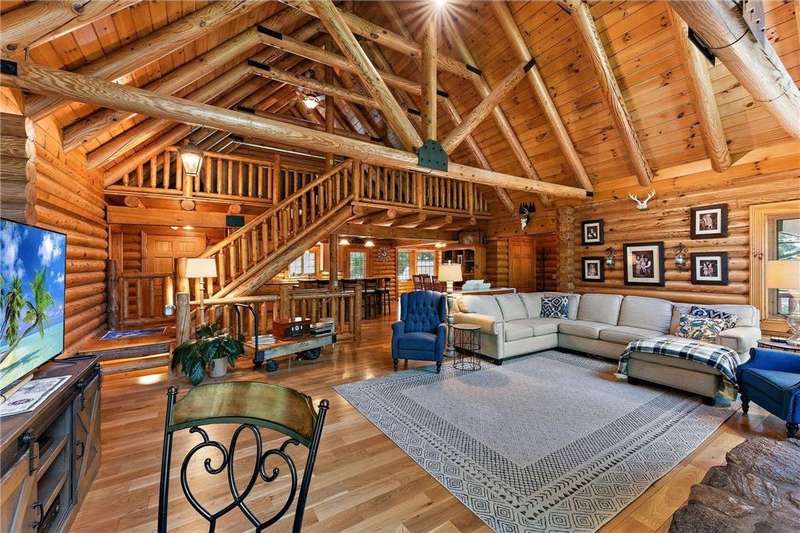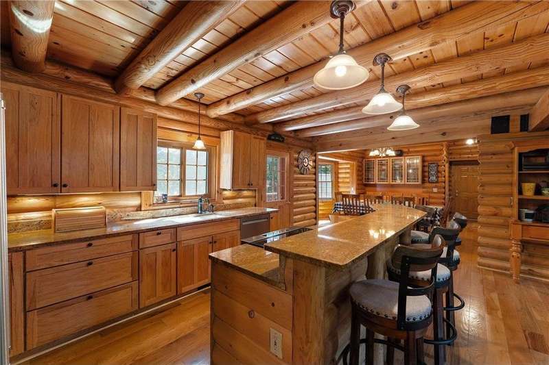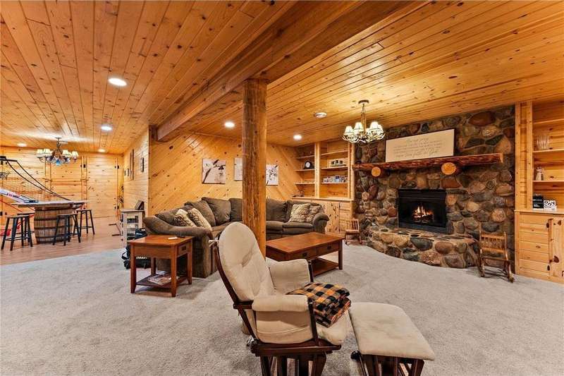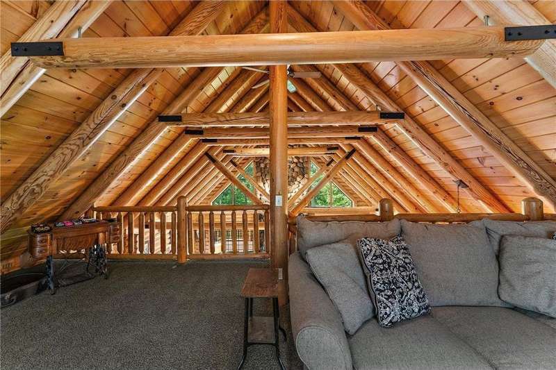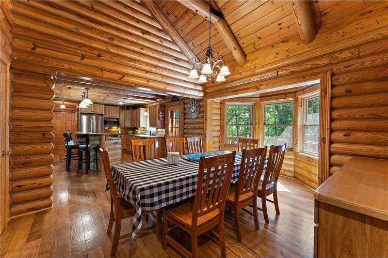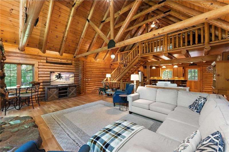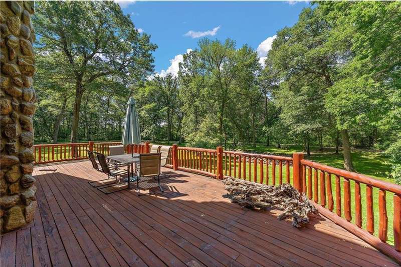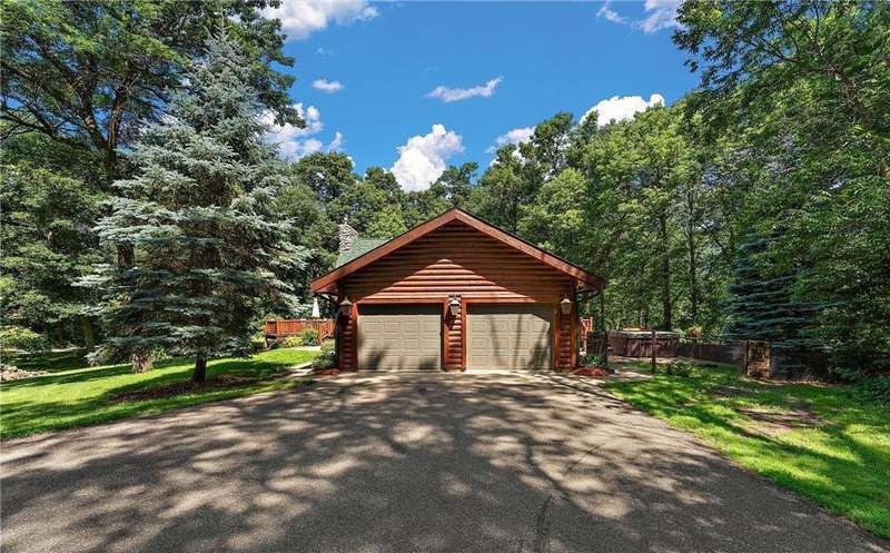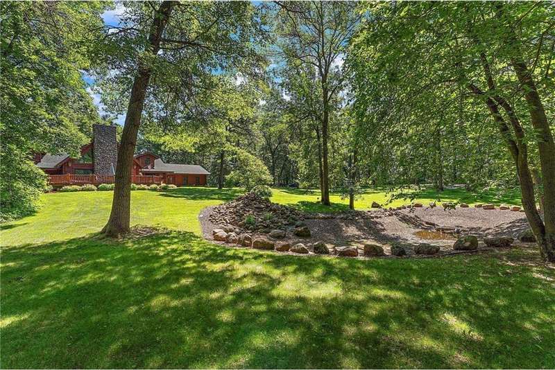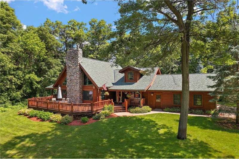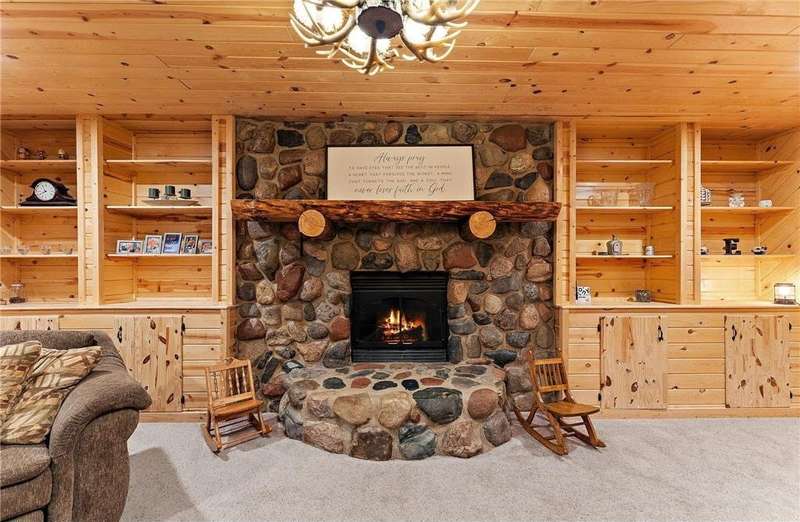 Extraordinary opportunity to own this beautiful log home, nestled on 8.93 acres! The winding driveway draws you into the tree-lined road as the log home suddenly appears in the open park-like clearing, complete with a massive front deck, hand-built stone fireplace and gorgeous windows. The two-story Great Room draws your eyes upwards as you note the beauty of the timbers, logs and cross-beams, the room height, the tall windows, and the two-story hand-built stone fireplace. As you look up, you will note the upper level loft which opens to the Great room - perfect for movie time or for your home office. Spacious kitchen has hickory cabinets, new SS appliances, granite counters, pantry, and kitchen window that overlooks the backyard. Plenty of space for food prep on the center island and two ovens to prepare for any hosted event! Convenient access to the back deck for your BBQ or morning coffee. The separate dining room has a bay area which overlooks the backyard, and includes a glassed built-in hutch with so much storage and drawer space. Beautiful Primary bedroom includes impressive vaulted ceiling with window, private three-quarter bath with jetted tub, double sinks, windows overlooking the treed yard, and a large walk-in closet complete with shelving. Main floor laundry room and storage is just off the main hallway. A separate bedroom on main is on the opposite side with vaulted ceiling, tall windows, spacious closet, situated across from the three-quarter bathroom. The finished lower level opens to a huge family room complete with a second gas fireplace and built-in shelving. The game room is ready for you to add your foosball or game table. A separate space is perfect for your home office or playroom. Two more bedrooms and a third three-quarter bathroom offer great space. Storage space is neatly tucked behind doors in the game room, additional wood shelving space in the utility room. This home has been meticulously maintained and includes a newer roof, refinished hardwood flooring, new washer and dryer, new garage doors, replaced windows, re-stained railings, newer furnace, new water softener, chain-link fenced area in the backyard, and more! Great yard, shed, and acreage to explore, or enjoy your hammock, or sit and watch nature. Welcome to your beautiful new home!