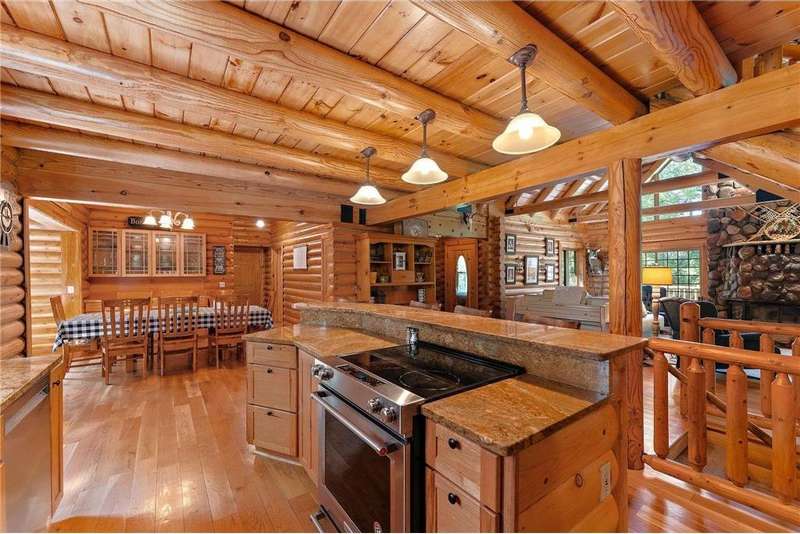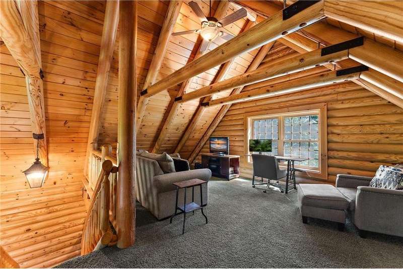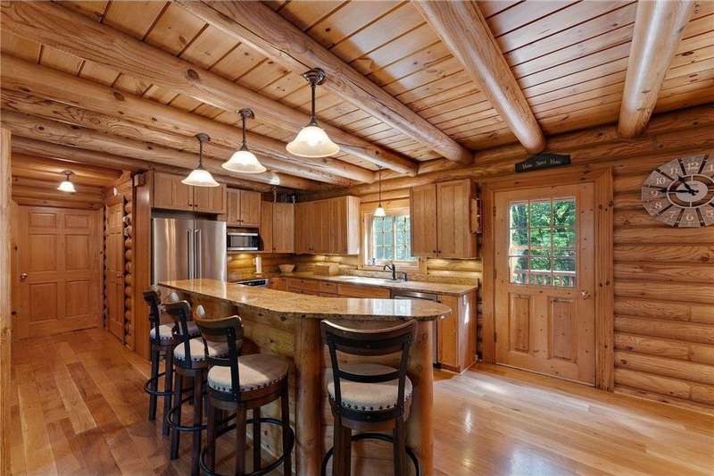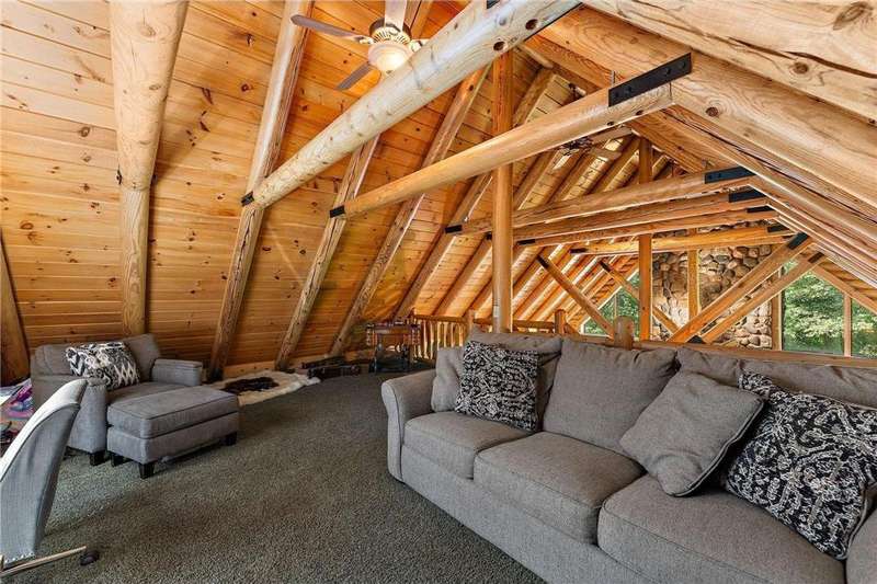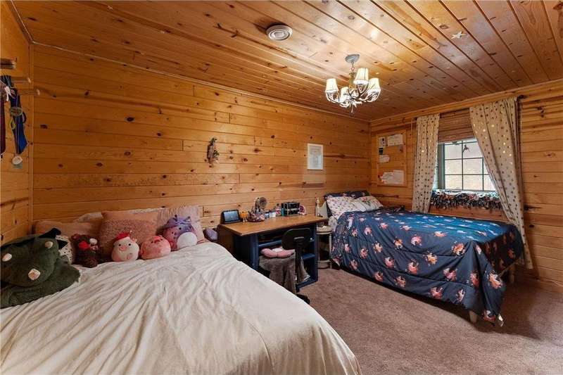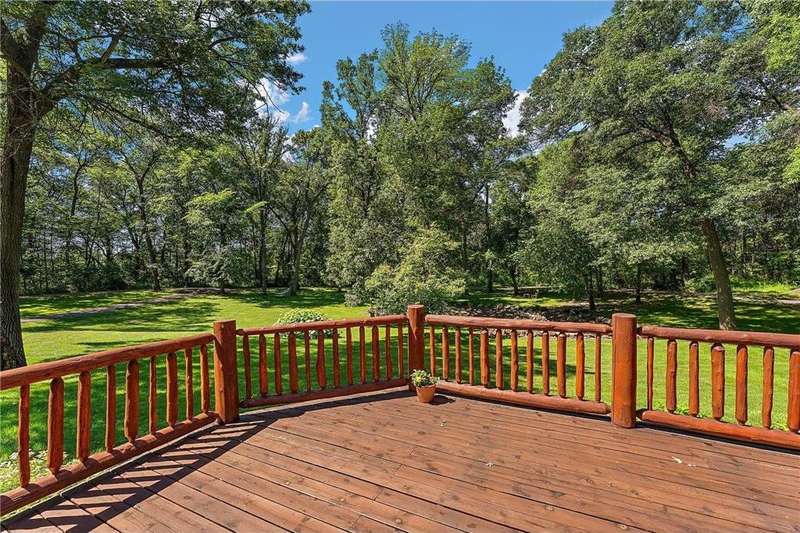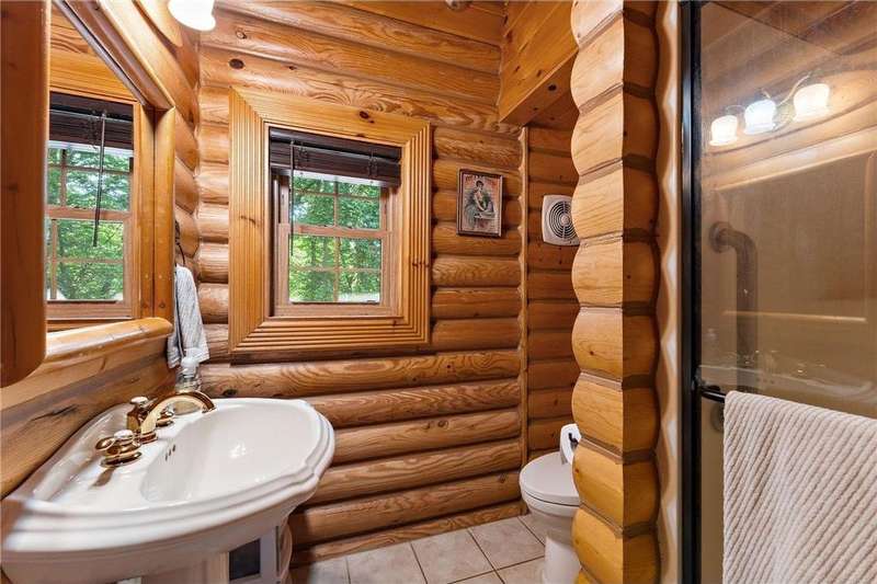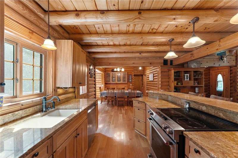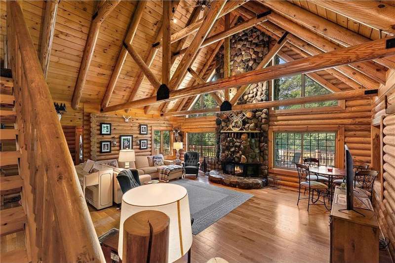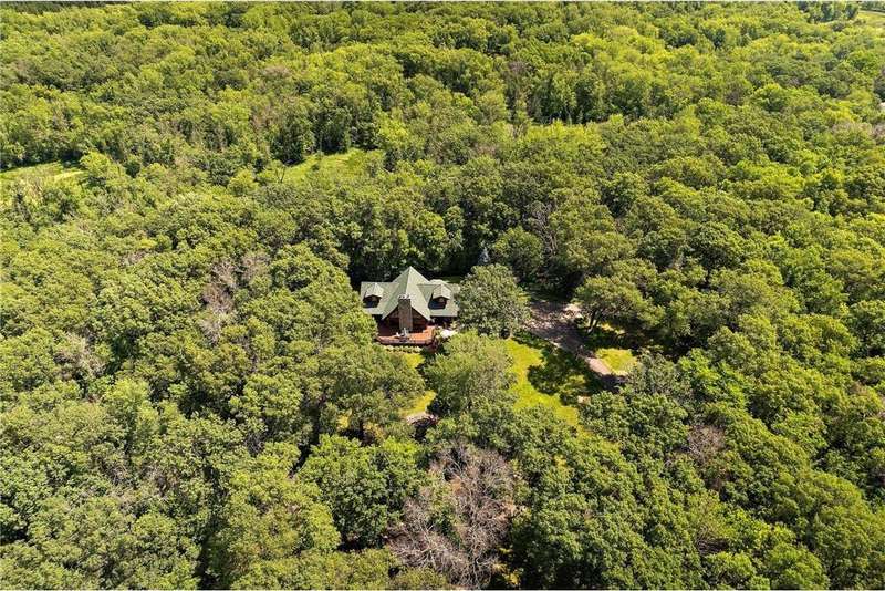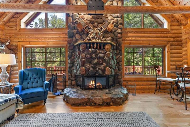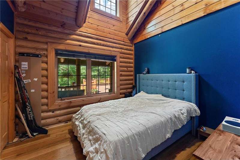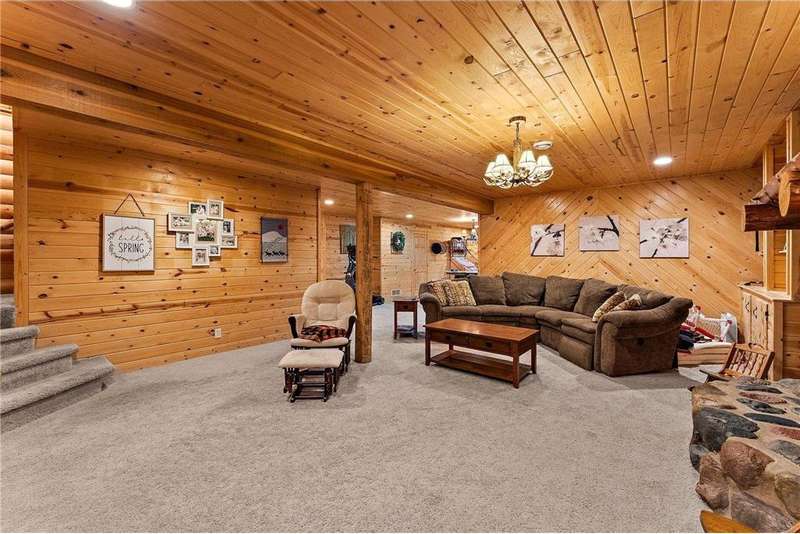 Extraordinary opportunity to own this beautiful log home, nestled on 8.93 acres! The winding driveway draws you into the tree-lined road as the log home suddenly appears in the open park-like clearing, complete with a massive front deck, hand-built stone fireplace and gorgeous windows. The two-story Great Room draws your eyes upwards as you note the beauty of the timbers, logs and cross-beams, the room height, the tall windows, and the two-story hand-built stone fireplace. As you look up, you will note the upper level loft which opens to the Great room - perfect for movie time or for your home office. Spacious kitchen has hickory cabinets, new SS appliances, granite counters, pantry, and kitchen window that overlooks the backyard. Plenty of space for food prep on the center island and two ovens to prepare for any hosted event! Convenient access to the back deck for your BBQ or morning coffee. The separate dining room has a bay area which overlooks the backyard, and includes a glassed built-in hutch with so much storage and drawer space. Beautiful Primary bedroom includes impressive vaulted ceiling with window, private three-quarter bath with jetted tub, double sinks, windows overlooking the treed yard, and a large walk-in closet complete with shelving. Main floor laundry room and storage is just off the main hallway. A separate bedroom on main is on the opposite side with vaulted ceiling, tall windows, spacious closet, situated across from the three-quarter bathroom. The finished lower level opens to a huge family room complete with a second gas fireplace and built-in shelving. The game room is ready for you to add your foosball or game table. A separate space is perfect for your home office or playroom. Two more bedrooms and a third three-quarter bathroom offer great space. Storage space is neatly tucked behind doors in the game room, additional wood shelving space in the utility room. This home has been meticulously maintained and includes a newer roof, refinished hardwood flooring, new washer and dryer, new garage doors, replaced windows, re-stained railings, newer furnace, new water softener, chain-link fenced area in the backyard, and more! Great yard, shed, and acreage to explore, or enjoy your hammock, or sit and watch nature. Welcome to your beautiful new home!
