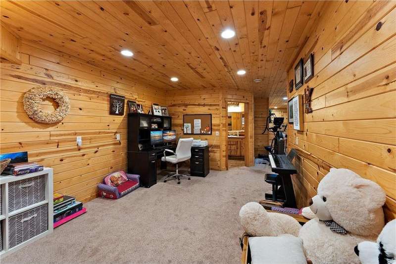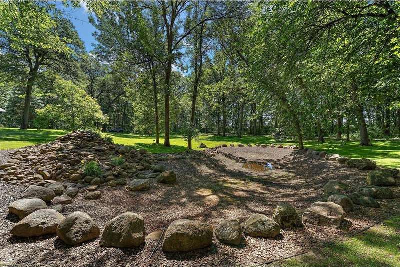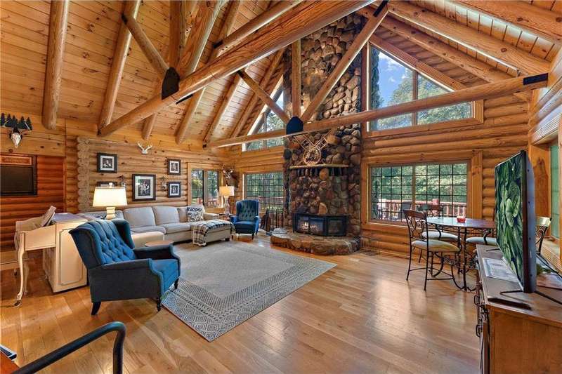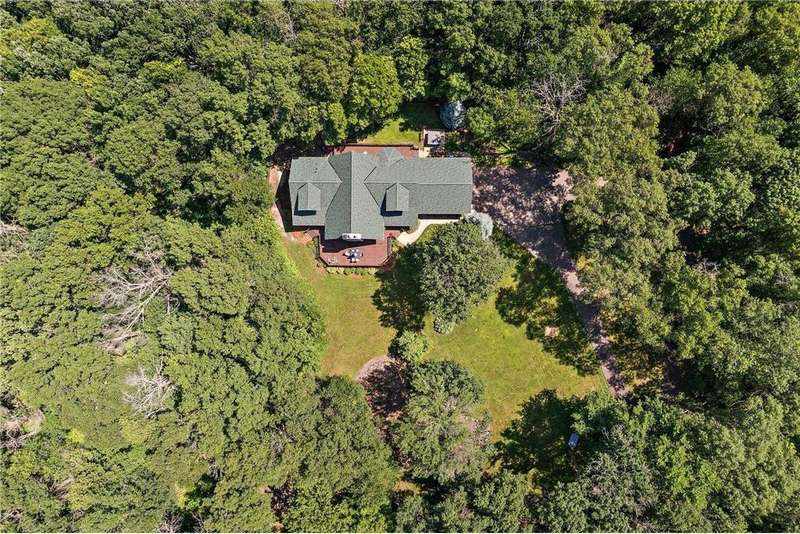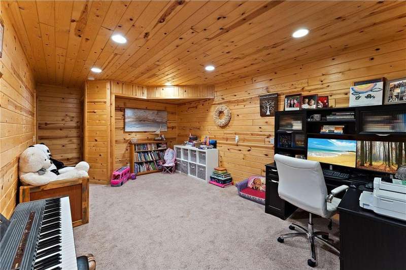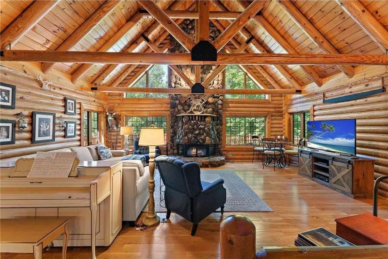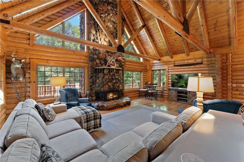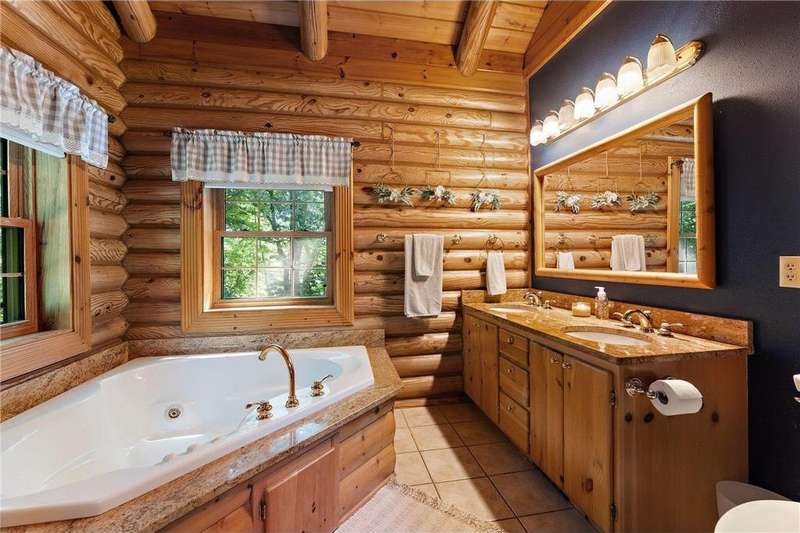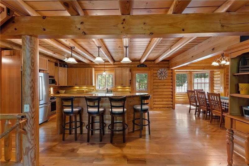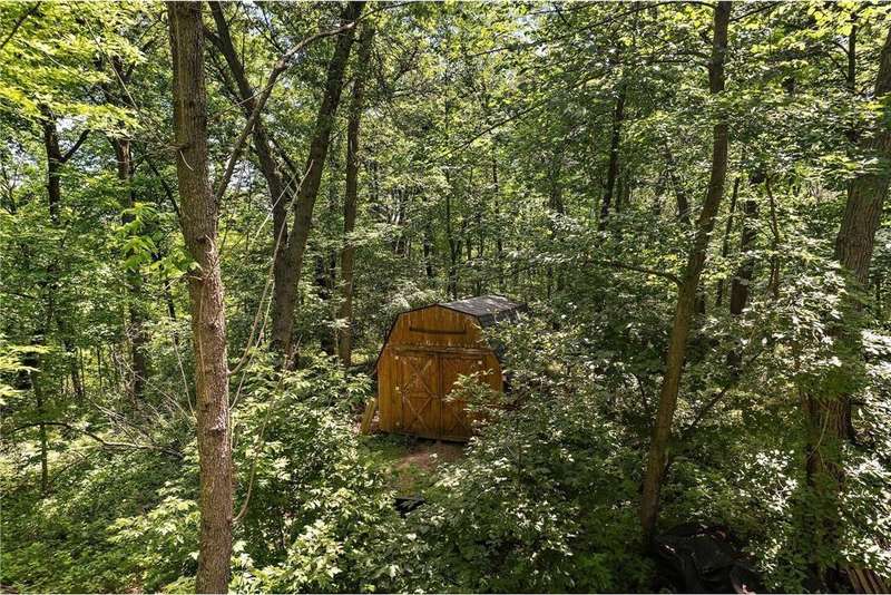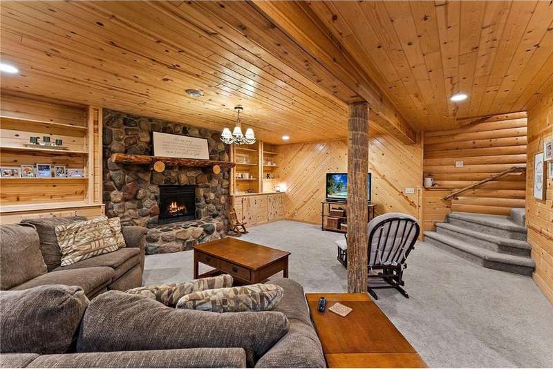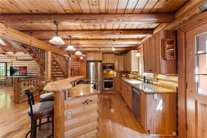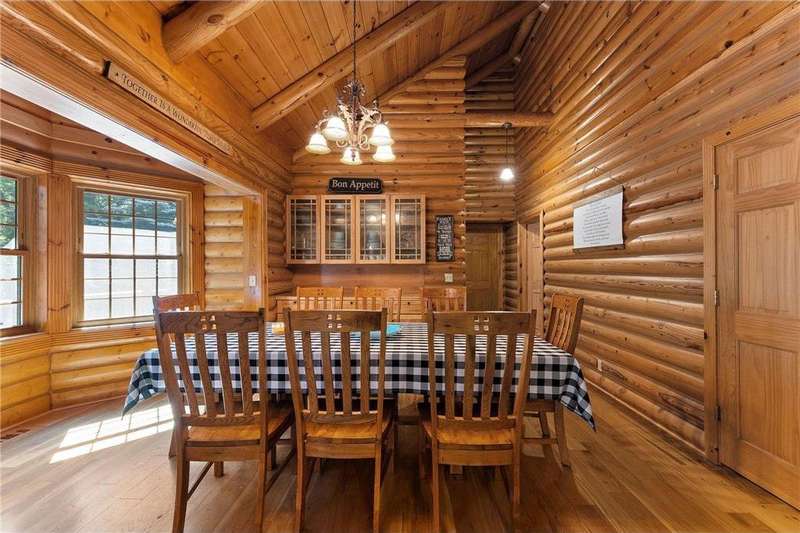 Extraordinary opportunity to own this beautiful log home, nestled on 8.93 acres! The winding driveway draws you into the tree-lined road as the log home suddenly appears in the open park-like clearing, complete with a massive front deck, hand-built stone fireplace and gorgeous windows. The two-story Great Room draws your eyes upwards as you note the beauty of the timbers, logs and cross-beams, the room height, the tall windows, and the two-story hand-built stone fireplace. As you look up, you will note the upper level loft which opens to the Great room - perfect for movie time or for your home office. Spacious kitchen has hickory cabinets, new SS appliances, granite counters, pantry, and kitchen window that overlooks the backyard. Plenty of space for food prep on the center island and two ovens to prepare for any hosted event! Convenient access to the back deck for your BBQ or morning coffee. The separate dining room has a bay area which overlooks the backyard, and includes a glassed built-in hutch with so much storage and drawer space. Beautiful Primary bedroom includes impressive vaulted ceiling with window, private three-quarter bath with jetted tub, double sinks, windows overlooking the treed yard, and a large walk-in closet complete with shelving. Main floor laundry room and storage is just off the main hallway. A separate bedroom on main is on the opposite side with vaulted ceiling, tall windows, spacious closet, situated across from the three-quarter bathroom. The finished lower level opens to a huge family room complete with a second gas fireplace and built-in shelving. The game room is ready for you to add your foosball or game table. A separate space is perfect for your home office or playroom. Two more bedrooms and a third three-quarter bathroom offer great space. Storage space is neatly tucked behind doors in the game room, additional wood shelving space in the utility room. This home has been meticulously maintained and includes a newer roof, refinished hardwood flooring, new washer and dryer, new garage doors, replaced windows, re-stained railings, newer furnace, new water softener, chain-link fenced area in the backyard, and more! Great yard, shed, and acreage to explore, or enjoy your hammock, or sit and watch nature. Welcome to your beautiful new home!