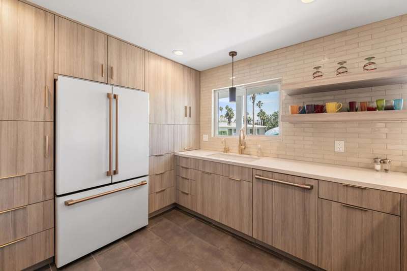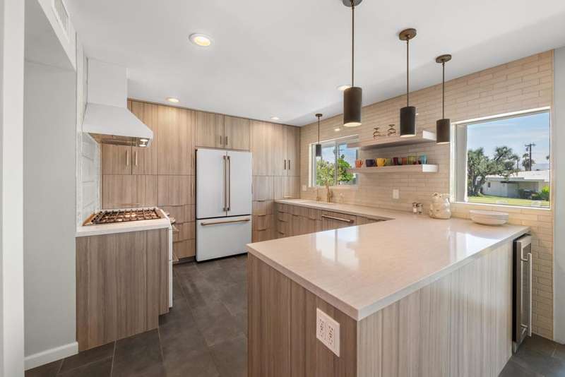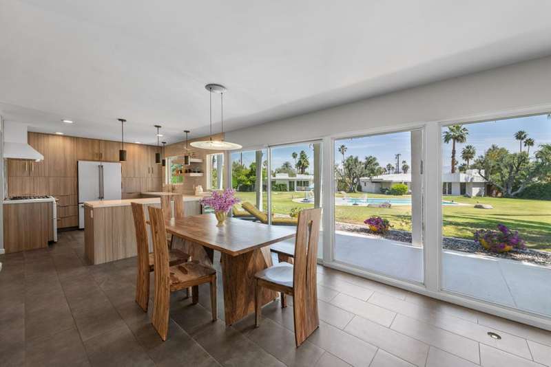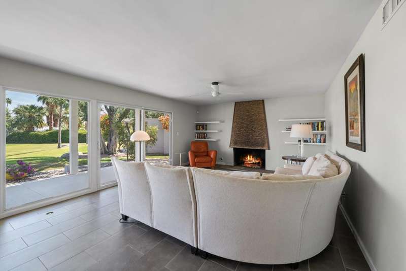 Classic 1960's Mid Century Gem in desirable South Palm Desert. A welcoming courtyard opens to a double door foyer with original Terrazzo. Views of lush, beautifully maintained grounds and a sparkling pool are captured through floor-to-ceiling sliding glass patio doors. A modern kitchen features sleek cabinetry, Quartz Countertops, Newport Brass fixtures and GE Cafe Appliances. Simplicity is Key. An open living area features a fireplace and dining area with built-in buffet cabinet and Vintage dry bar. The Primary BR opens to an enclosed patio. Sleek porcelain tile throughout. Updated bathrooms feature Quartz countertops and tiled showers. This is one of four residences sharing calm serenity within a private enclave. Offered Turnkey Furnished and ready for full-time or seasonal enjoyment.