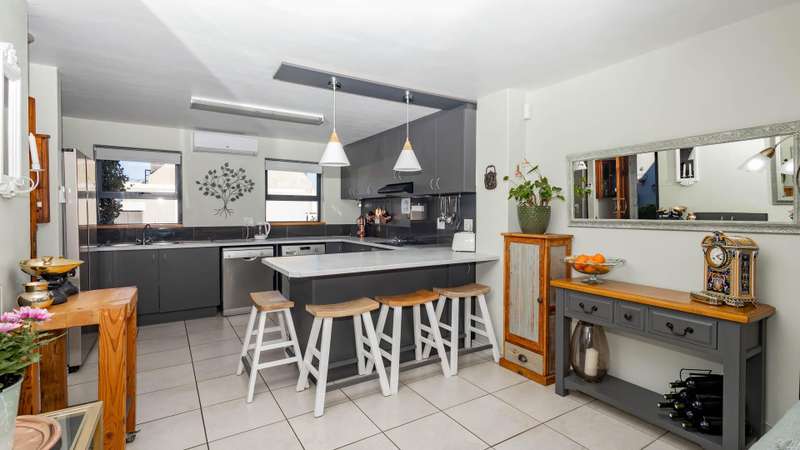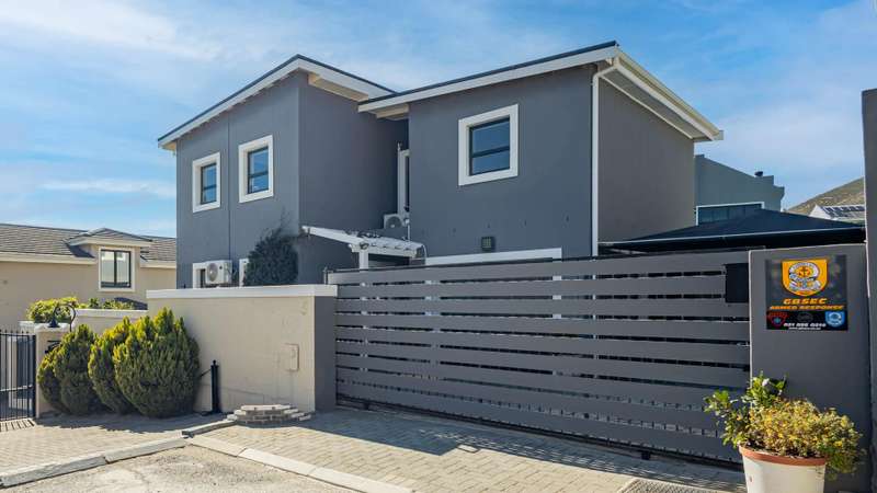 This modern, architect-designed double-storey residence is set in a quiet and peaceful part of Gordon?ÇÖs Bay. Designed to take full advantage of its elevated position, the home offers breathtaking, uninterrupted views of the Helderberg mountains and Cape Town in the distance?Çöan ideal retreat for those who value peace, privacy, and natural beauty. Stand-out Property Features: Accommodation - 3 spacious bedrooms, a private study, and 2.5 elegant bathrooms. Living Areas - Stylish open-plan kitchen and dining area with seamless flow to the lounge, which opens to an enclosed braai room and elevated deck, perfect for year-round entertaining. Comfort & Climate - Air conditioning in living areas ensures all-season comfort. High-end bespoke window blinds are included for a refined finish. Outdoor Living - Beautifully manicured and landscaped garden featuring ambient feature lighting, a sheltered garden room, and inviting outdoor lounging areas ideal for relaxing or entertaining while enjoying the spectacular views. Garaging & Security - Large single garage with rear workshop Additional covered carport. Fully walled property with automated gate access. Comprehensive in-home security system with indoor and outdoor beams, alarm system, and electric fencing.