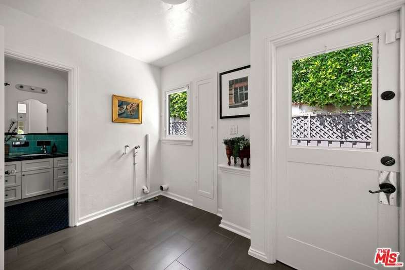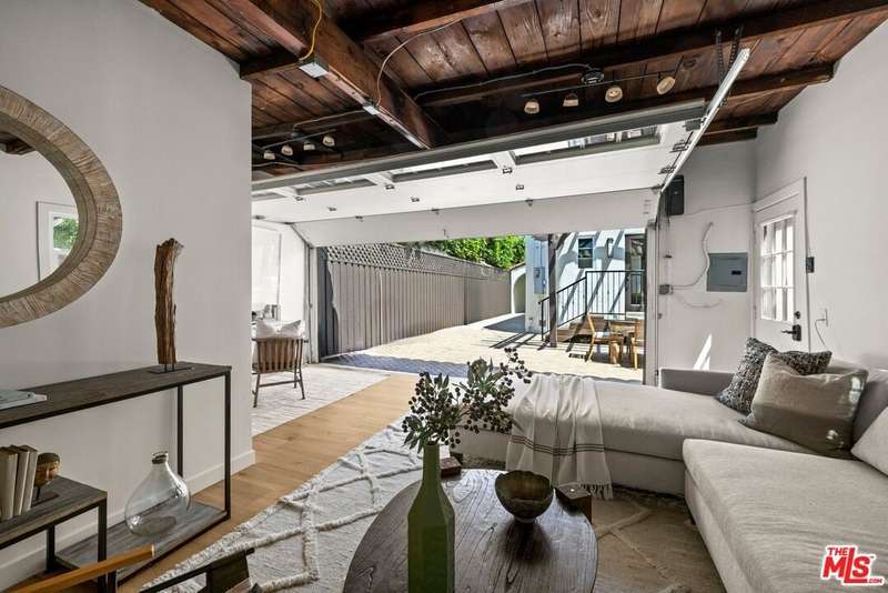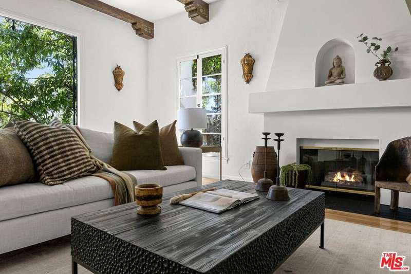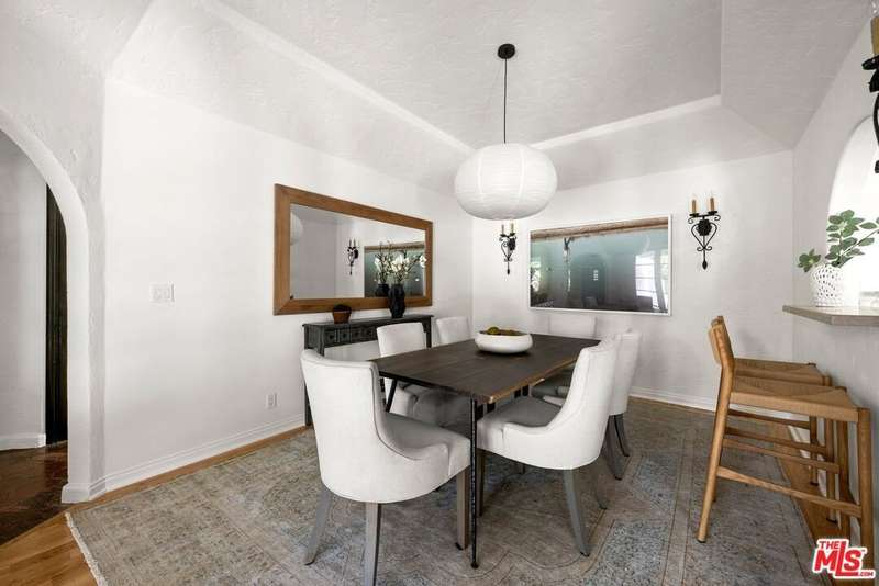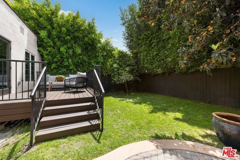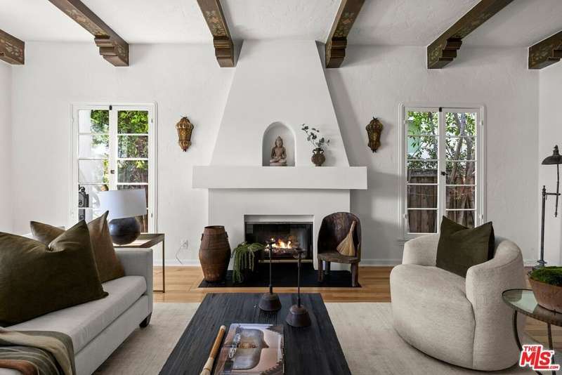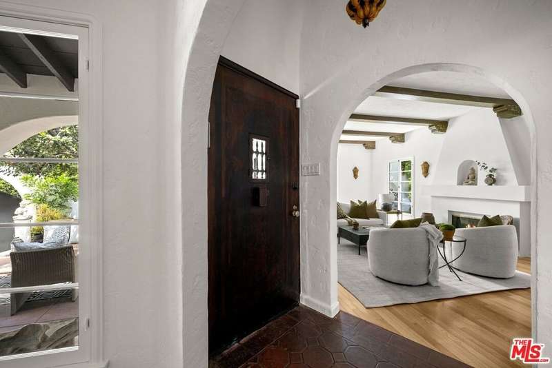 Lovely private Spanish oasis in the heart of Beverly Grove, just blocks from the Grove, fine dining, LACMA and the Beverly Center. Nestled in a quiet residential pocket, this 1930's romantic Spanish offers original details with modern amenities. Enter your new home through a gated courtyard into the entry with high circular turret and soak in the sunken living room that features soaring ceilings with exposed beams, a huge picture window and a magnificent fireplace. Separate dining room with original coved ceilings, bar counter/pass through to the kitchen and magnificent arched wood and glass doors that lead to the kitchen. The remodeled kitchen offers quartz counters, custom white cabinets and lovely eat-in area with built-in bench seating. The primary bedroom features new French doors that lead to a newly built deck that overlooks the grassy back yard and rear patio with pergola, perfect for entertaining and el-fresco dining. This residence includes 2 Additional oversized bedrooms, charming writing area, mostly brand-new windows and doors, 1 year old HVAC and wood flooring. The Tranquil backyard includes fruit trees, lush landscaping, a generous patio and a newly remodeled converted garage with bathroom, perfect for a studio, home office or guest suite.. With great charm and privacy, this is a home that rarely comes on the market and should not be missed.
