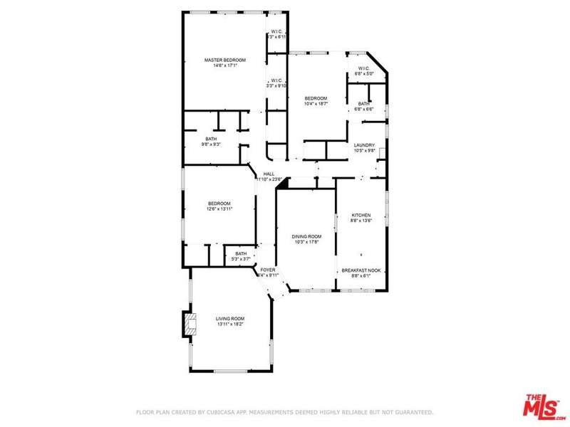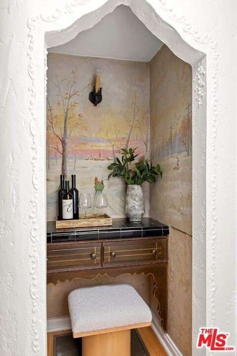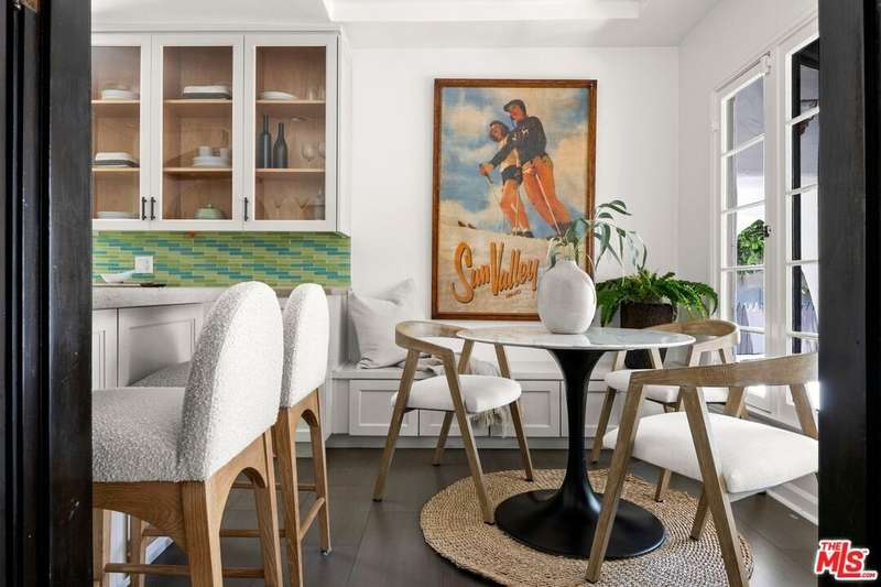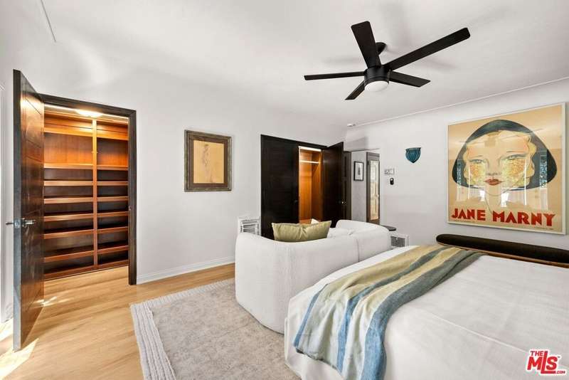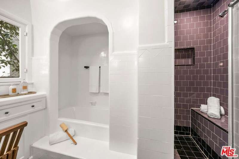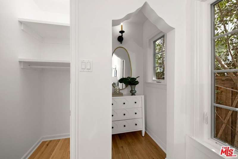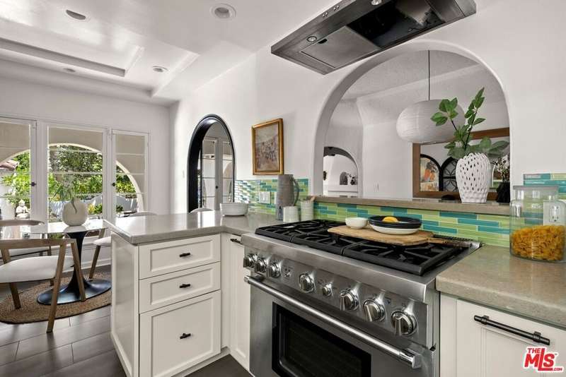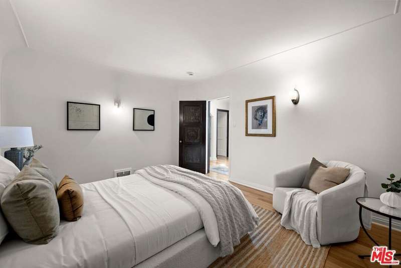Lovely private Spanish oasis in the heart of Beverly Grove, just blocks from the Grove, fine dining, LACMA and the Beverly Center. Nestled in a quiet residential pocket, this 1930's romantic Spanish offers original details with modern amenities. Enter your new home through a gated courtyard into the entry with high circular turret and soak in the sunken living room that features soaring ceilings with exposed beams, a huge picture window and a magnificent fireplace. Separate dining room with original coved ceilings, bar counter/pass through to the kitchen and magnificent arched wood and glass doors that lead to the kitchen. The remodeled kitchen offers quartz counters, custom white cabinets and lovely eat-in area with built-in bench seating. The primary bedroom features new French doors that lead to a newly built deck that overlooks the grassy back yard and rear patio with pergola, perfect for entertaining and el-fresco dining. This residence includes 2 Additional oversized bedrooms, charming writing area, mostly brand-new windows and doors, 1 year old HVAC and wood flooring. The Tranquil backyard includes fruit trees, lush landscaping, a generous patio and a newly remodeled converted garage with bathroom, perfect for a studio, home office or guest suite.. With great charm and privacy, this is a home that rarely comes on the market and should not be missed.
