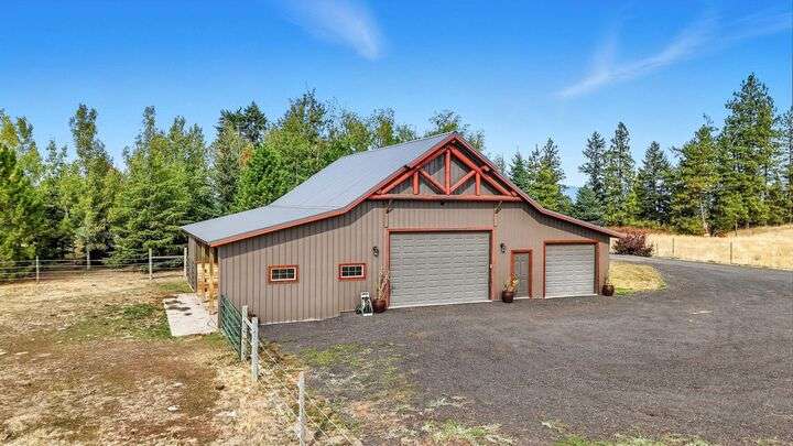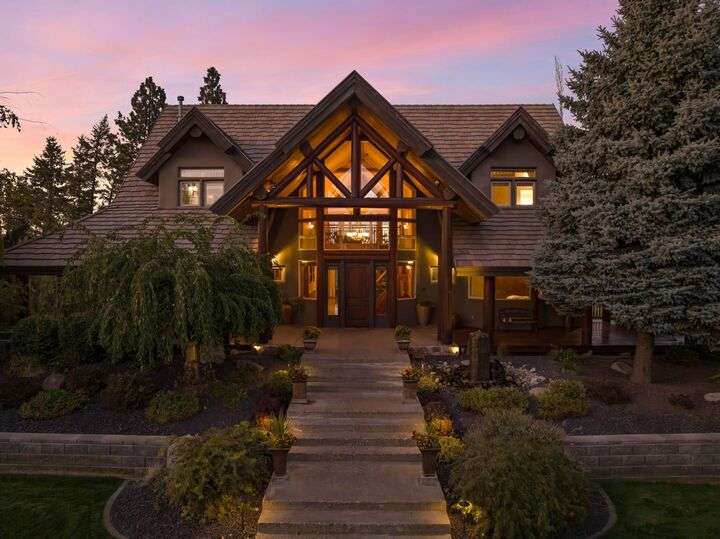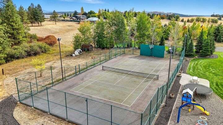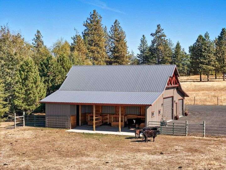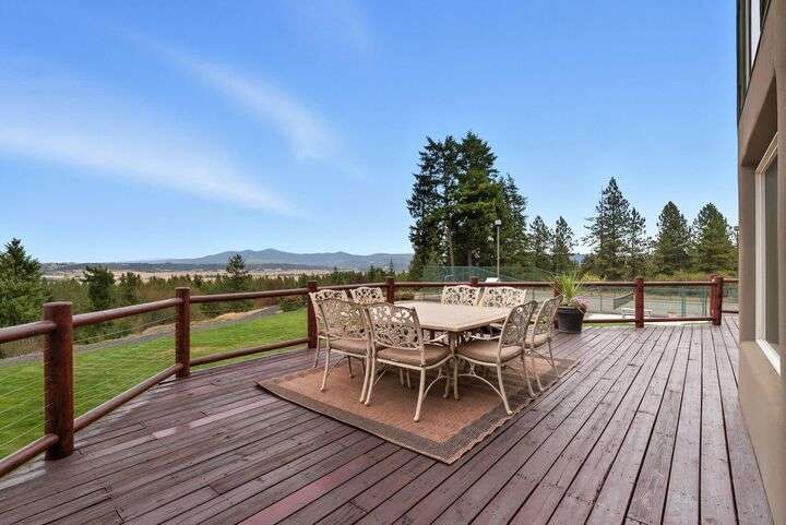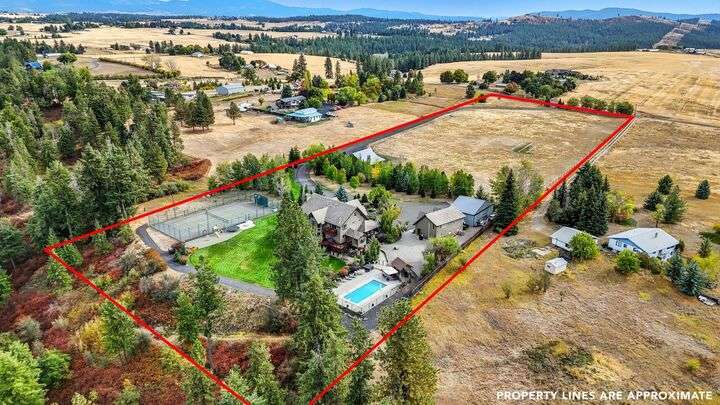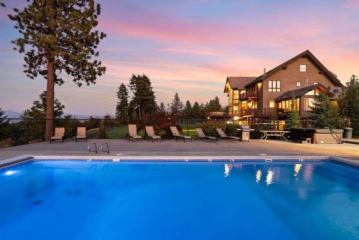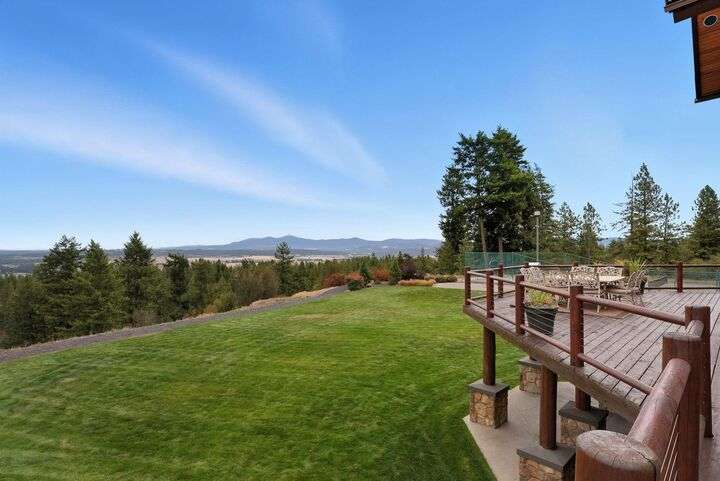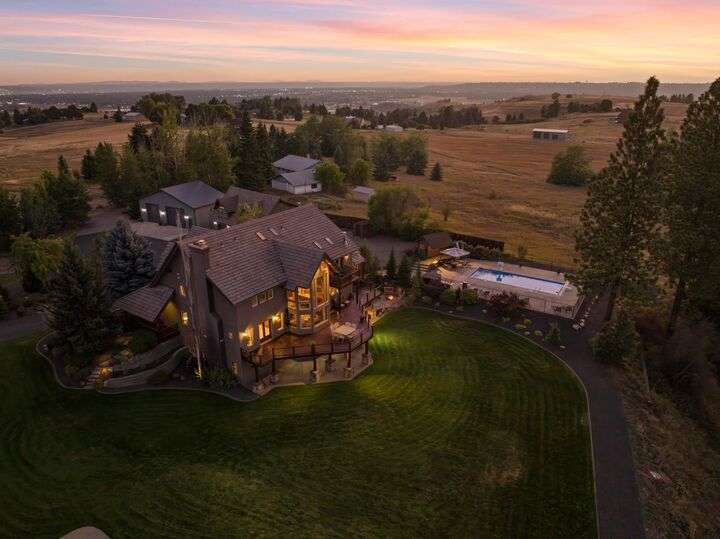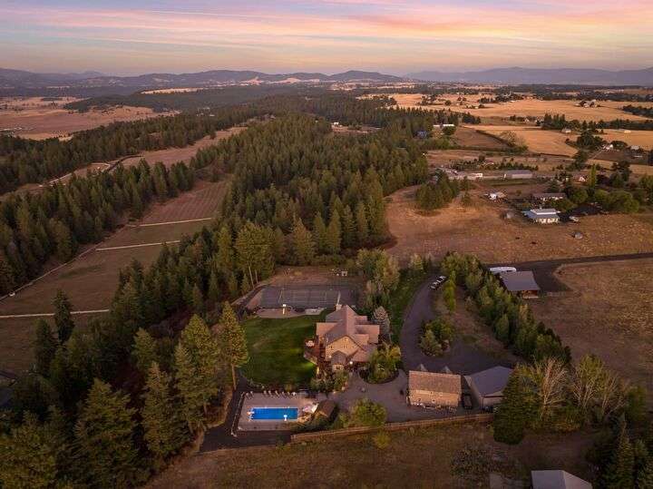 Perched majestically on Mt. Saint Michael, this Yellowstone-inspired luxury estate offers a breathtaking 180-degree view, with architectural and log elements that evoke the spirit of Montana ranches. Featuring grand 35-foot vaulted ceilings and expansive floor-to-ceiling windows, the residence spans 6,685 square feet and includes 5 bedrooms and 5 bathrooms. The master retreat boasts a spacious loft, two walk-in closets, and a fully remodeled ensuite. Complementing the main house are several additional structures: a 28x40 workshop, a 58x40 barn, and a horse setup. Expansive decks provide thousands of square feet for leisurely enjoyment and stunning views, while a fully equipped Accessory Dwelling Unit (ADU) offers 2 bedrooms and a 3-car garage. The estate also features a full-sized fenced regulation tennis court and an exquisite pool, combining luxury with practicality, making it perfect for relaxation and entertaining. Experience rural tranquility with convenient access to Spokane’s vibrant cultural scene.