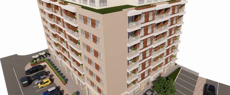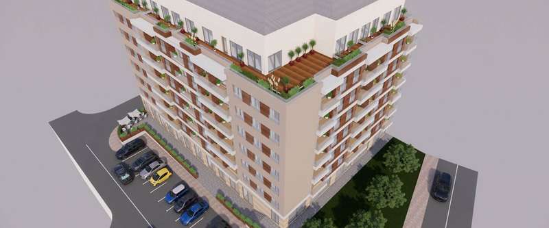 This mixed-use building consists of 96 residential apartments across six floors and commercial premises on the ground floor. The underground garage features hydraulic parking platforms for up to 100 cars and an additional 23 open parking spaces.