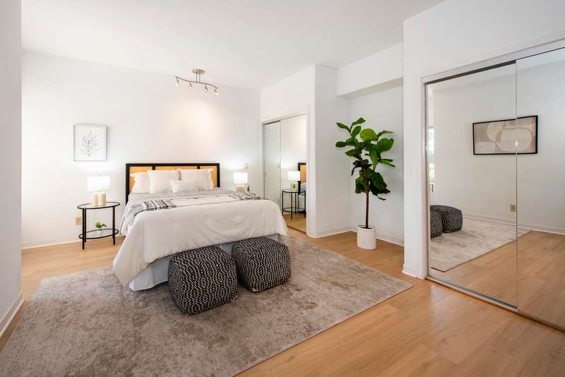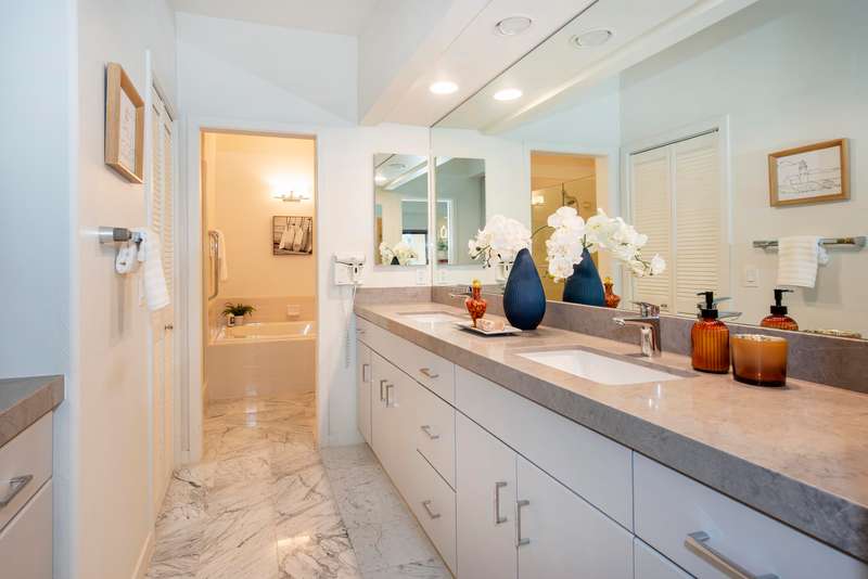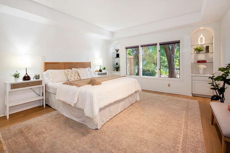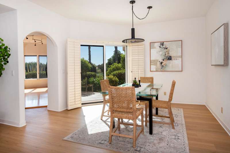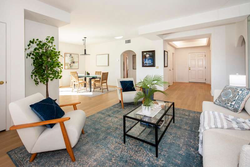 a kitchen, a well-equipped exercise room, and a heated pool and spa. Owned and loved for 22 years, this desirable ground-floor, two-bedroom, two-bath unit was carefully chosen for its seamless indoor-outdoor feel, featuring two patios and abundant natural light. The remodeled