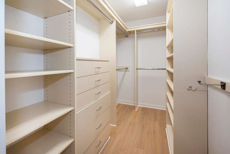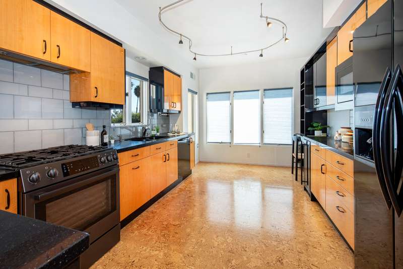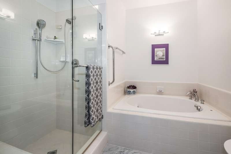 kitchen, designed with expert guidance, boasts cork floors, Downsview cabinetry, modern appliances and generous storage. Both bathrooms and laundry room have been updated with marble counters and custom cabinetry.