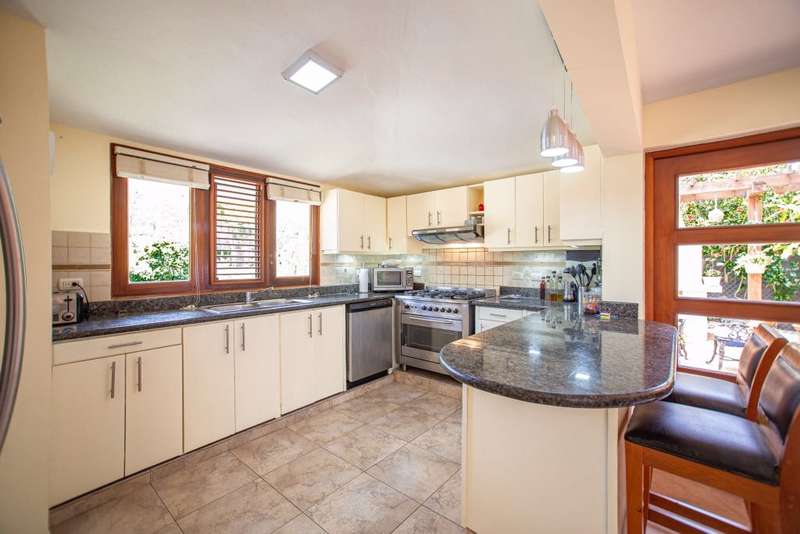 The villa has a wonderful landscaped garden and a two-level pool area with a guest cottage at the bottom of the grounds. With 4 bedrooms and 5 bathrooms, the villa is quite spacious and can entertain a nice amount of friends and visitors. One bedroom is designed as a large fully equipped gymnasium and the other one is in the guest cottage in the garden.