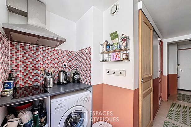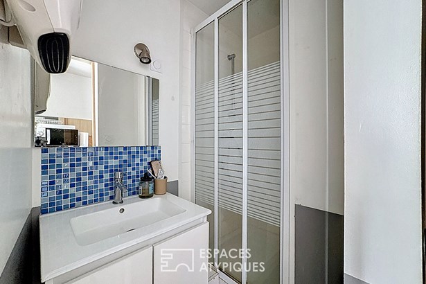 The living room opens onto a lounge area and a sleeping alcove with storage that optimizes every corner. Beyond the entrance, a bar and a fully equipped kitchen offer views over the rooftops. A shower room and separate WC complete the apartment. The whole enjoys exceptional tranquility, while being at the heart of the vibrant city life.