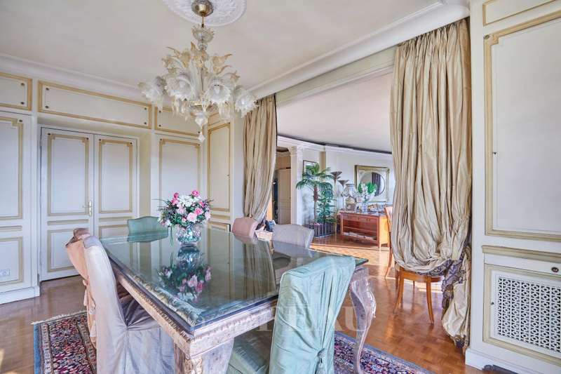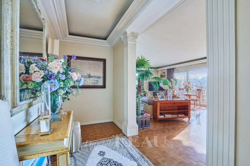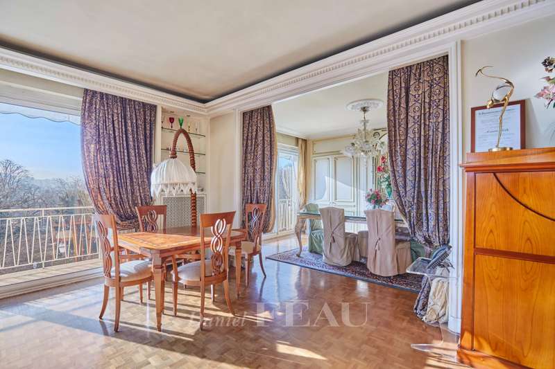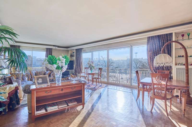 Porte Maillot. This 150 sqm dual-aspect apartment on the 3rd floor of a luxurious relatively recent building benefits from a south-facing exterior area commanding an open view of the Bois de Boulogne and the Eiffel Tower. It includes a corner double living/reception room, a dining room, a spacious kitchen, two bedrooms opening onto a balcony, and two bathrooms. With a cellar, and a parking space (60000€)