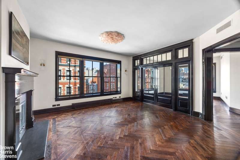 A gracious gallery entrance leads to the sunlit living room, where grand double-hung windows frame sweeping views of Elizabeth and Prince Street, one of NoLiTa's most picturesque corners. The inviting ambiance is further enhanced by a wood-burning fireplace with an oversized mantle, French doors opening to the dining room, and an open-concept kitchen designed for both beauty and function.
