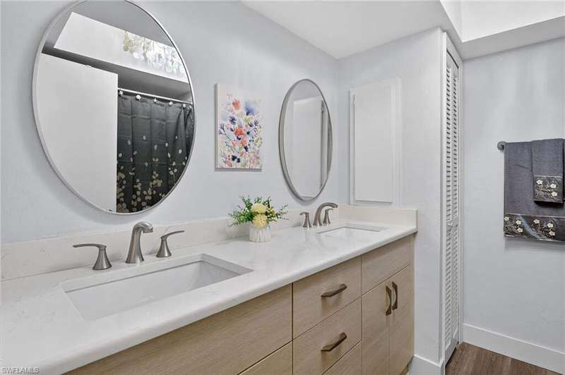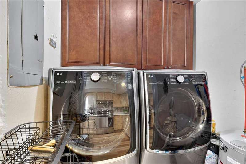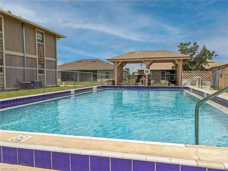 Chic & Stylish First Floor Condo in the Heart of Cape Coral. Welcome to this beautifully updated 2-bedroom, 2-bath home, ideally located near restaurants, shopping, schools, hospitals, Cape Harbour and Beaches. No Flooding--Flood Zone X--High & Dry. This first floor residence offers comfort and convenience, featuring spacious, freshly painted bedrooms and designer touches throughout. Recent upgrades include: New luxury waterproof flooring, new stove, new dishwasher, new washer/dryer, new water heater and newer A/C and plumbing (2022). The kitchen is equipped with stainless steel appliances, oscillating ceiling fan, quarts countertops and a pass through space that opens to a flexible dining area--perfect for entertaining or easily converted into a cozy den or office space. The bathrooms are unique with their elegant chandeliers, solid wood cabinets, soft close technology and quarts countertops. Modern ceiling fans or distinctive lighting elevate each room, adding a touch of sophistication. Imagine movie nights with family or friends in the large living room. The back patio is an ideal spot for your morning coffee or evening gatherings. Just steps away, the community POOL invites you to relax and unwind in a serene setting. Golf to your hearts content at the nearby, public Palmetto Pines Country Club. Boating enthusiasts can rent a space for your boat at one of the harbors or consider joining the Freedom Boat Club. Don't miss the opportunity to make this refined condo your own.--schedule a private showing today before it is gone! Veteran friendly.