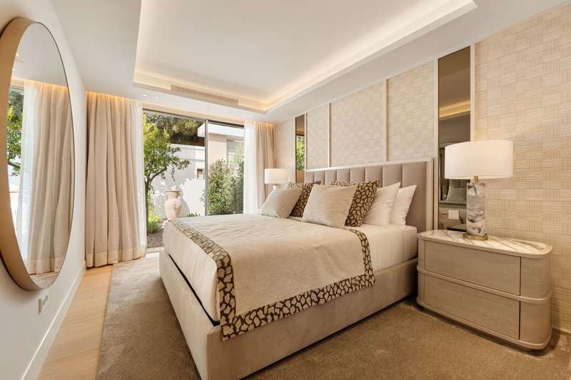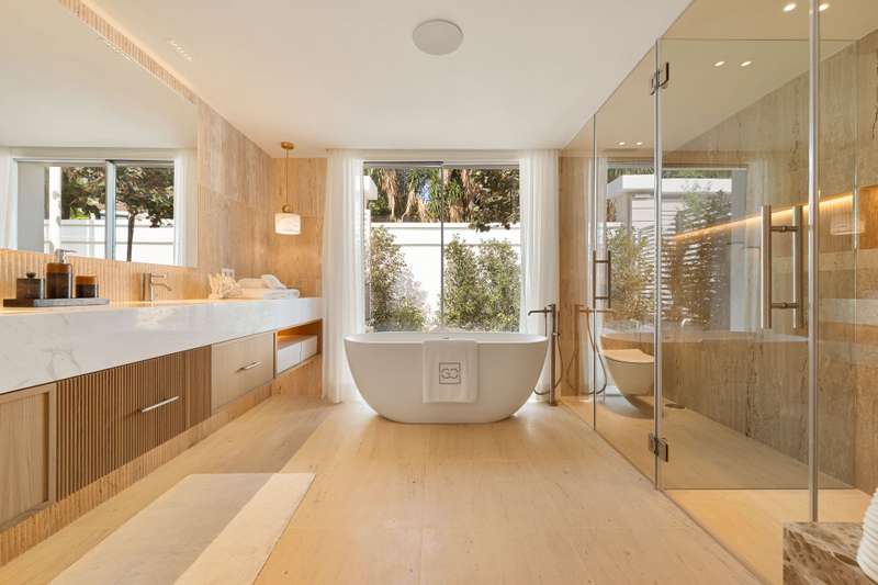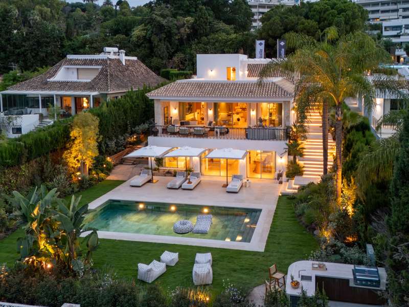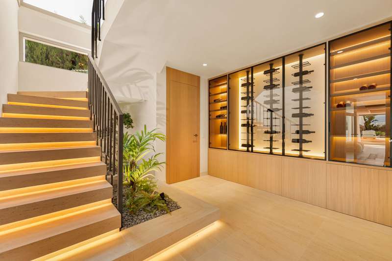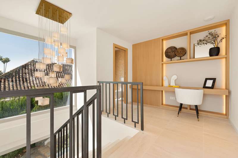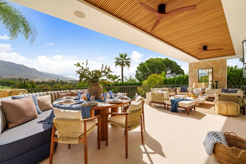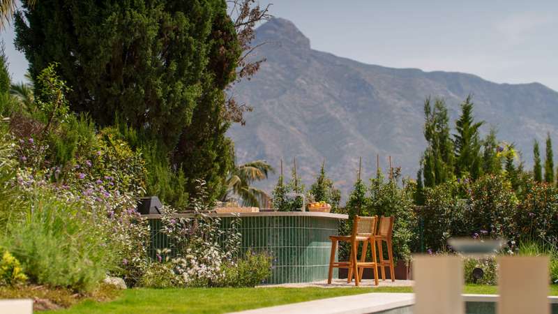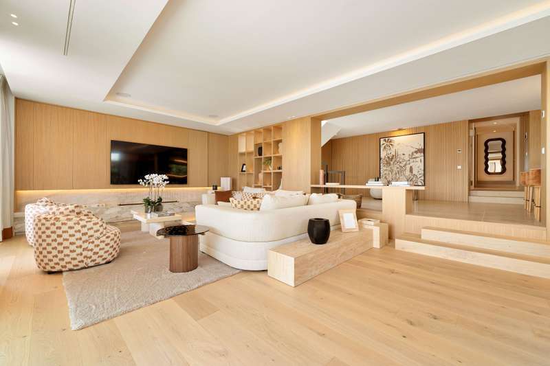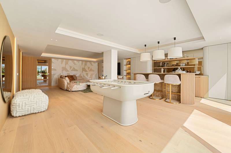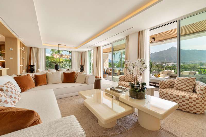 Villa Salina, located in the prestigious enclave of Nueva Andalucía, is a striking five-bedroom residence meticulously designed by the acclaimed GC Studio. Set on a beautifully landscaped 1,048 m² plot, this villa embodies refined Mediterranean living with a modern, organic twist. Its prime location offers proximity to top-tier golf courses, providing both tranquility and convenience for golf enthusiasts and luxury seekers alike. Inside, Villa Salina reveals a flawless interplay of light-toned wood, natural stone, and bespoke furnishings that create a serene, contemporary ambiance. The open-plan layout seamlessly connects the gourmet kitchen, stylish dining space, and inviting living areas, all crafted with an exceptional eye for detail. Expansive sliding glass doors lead to a breathtaking terrace lounge, perfect for entertaining or relaxing while taking in panoramic views of the surrounding mountains and lush greenery. Outdoors, the villa offers a resort-style ambiance with a prist