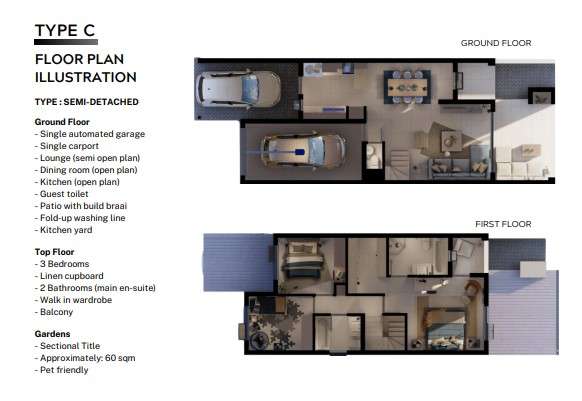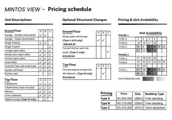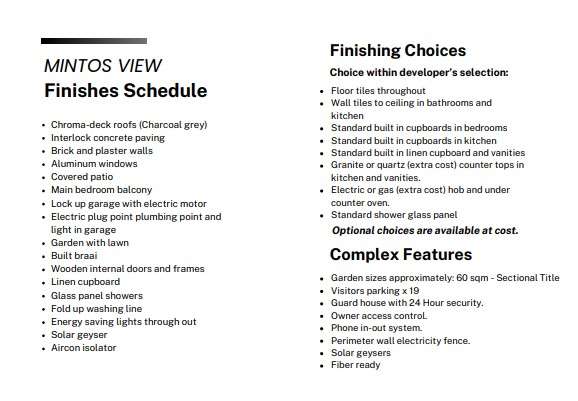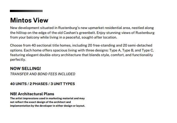 Welcome to Mintos View, a new development in Cashan. Type C, phase 1. The Property has 3 Bedrooms, 2 Bathrooms. Main Bedroom has an En-Suite Bathroom and walk-in Closet. Enjoy your coffee on the balcony with stunning views There is a semi open plan Lounge, Open plan Kitchen and Dining area. Guest Toilet downstairs. The property also has a Linen Cupboard. The house is fitted with Energy-saving lights and solar geysers The property has a single Garage and single Carport. On the outside there is a covered Patio with Built-in Braai. You also have your own Pet-friendly private garden with a fold-up washing line. The property has Fibre connectivity. Optional upgrades are available! Security is top notch with a 24/7 security access control. Phone-in/out system for visitors Don’t miss out; buy your home today in Mintos View. Call us today for this prime property
