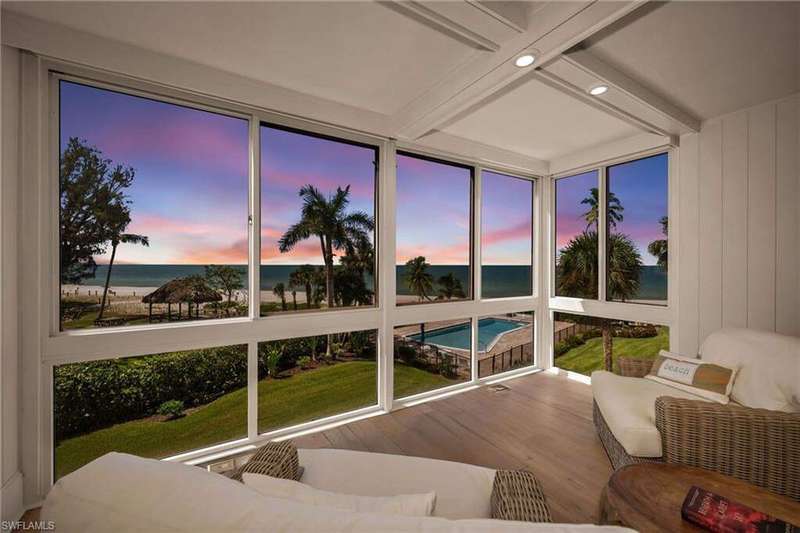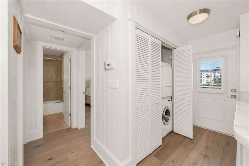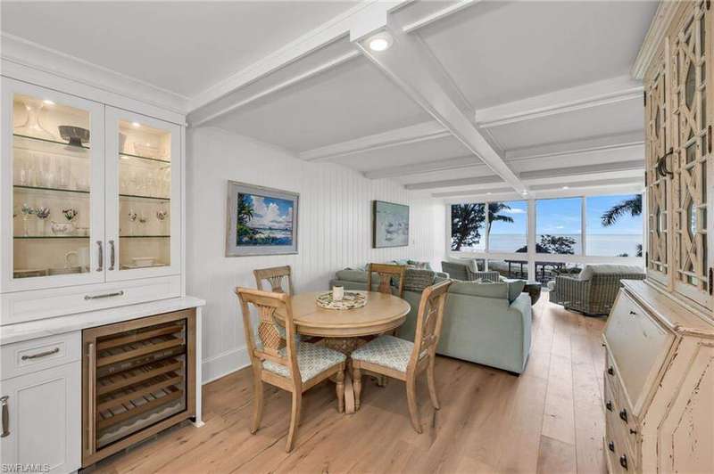 Step into this impeccably renovated 2-bedroom, 2-bath residence in the coveted Royal Palm Club. Spanning 1,143 sq ft, the home has been thoughtfully transformed to blend luxury with coastal ease. A. Vernon Allen Builders led the restoration, installing European white oak wide-plank flooring and custom whitewashed beams that articulate a vaulted ceiling, diffuse natural light, and feature integrated LED uplighting. Shiplap-accented walls and a designer kitchen clad in marble countertops set the stage for Sub-Zero and Bosch appliances, complemented by a wine captain for effortless entertaining. Each bathroom has been reimagined as a private spa retreat, featuring granite-topped vanities, rich wood cabinetry, and stone-tiled showers that resonate with relaxed seaside sophistication. Residents enjoy direct access to private Moorings Beach Park, alongside community amenities including a beachfront pool, bike storage, and a library. Within minutes, discover the boutiques of 3rd St and 5th Ave S, the cafes of Venetian Village, and the dining and retail at Waterside Shops.