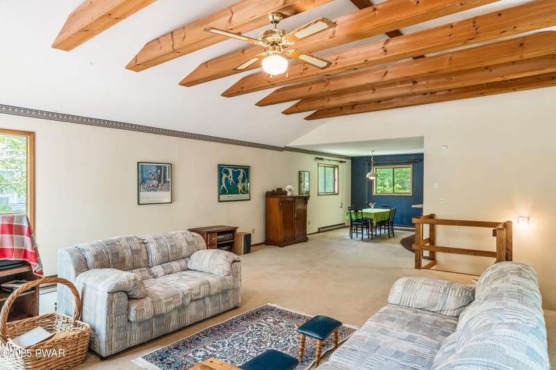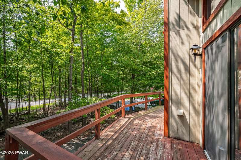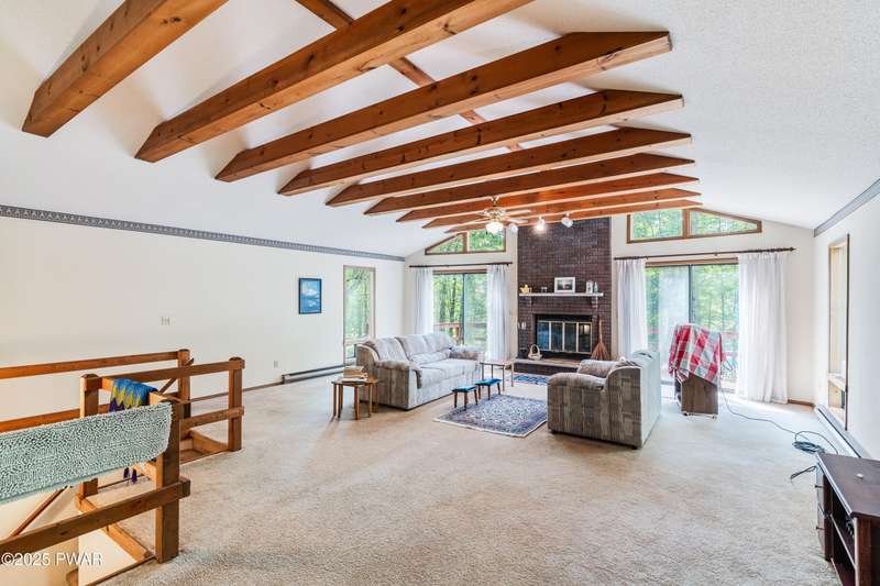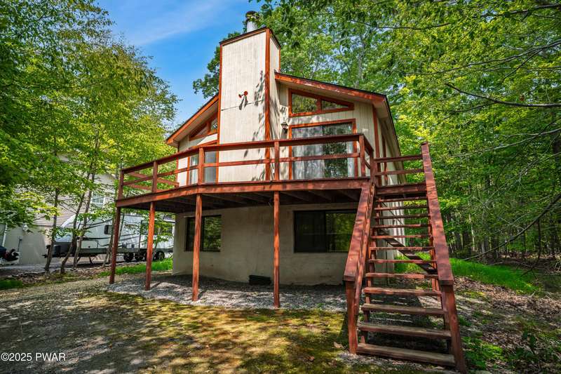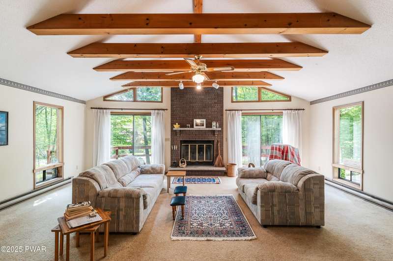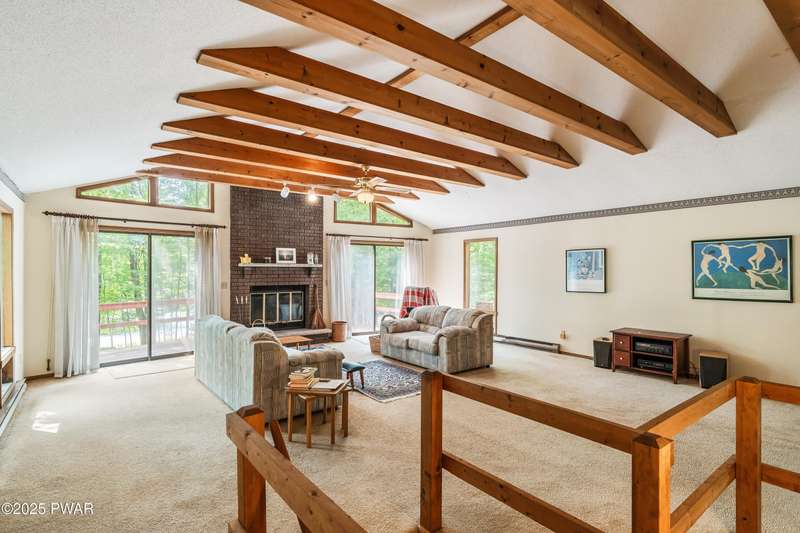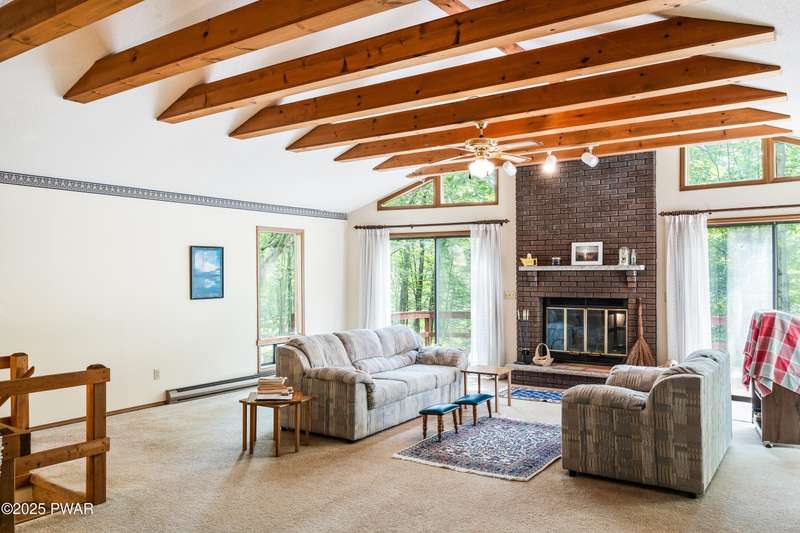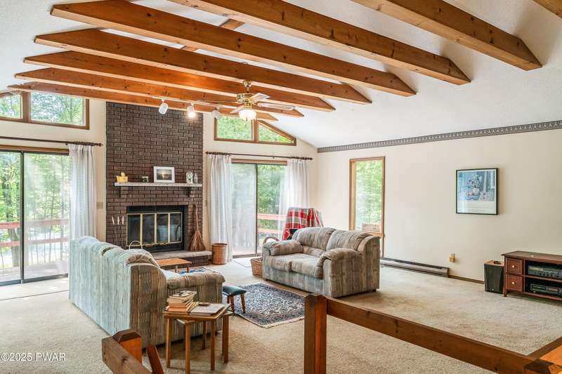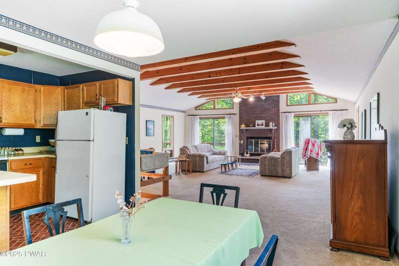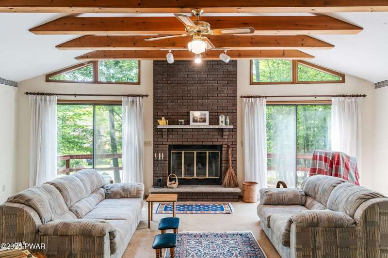 Discover your retreat in the amenity-filled community of The Hideout! This charming home offers a warm and inviting layout with vaulted ceilings, exposed beams, and a brick fireplace as the centerpiece of the spacious living room. Large windows and sliding doors flood the home with natural light and open to an expansive deck, perfect for entertaining or relaxing among the trees.The kitchen features ample cabinet space, a breakfast bar, and flows into the dining area for easy gatherings. With 2 bedrooms and 2.5 bathrooms, this home has plenty of room for family and guests. Bedrooms are generously sized, and the bathrooms carry a touch of vintage charm, offering the opportunity to update to your taste.Set back on a wooded lot, this property provides privacy while still being part of a community with endless amenities, lakes, pools, golf, skiing, tennis, fitness center, and more. Whether you're looking for a full-time residence, vacation home, or investment property, this home delivers the perfect blend of comfort, character, and potential.