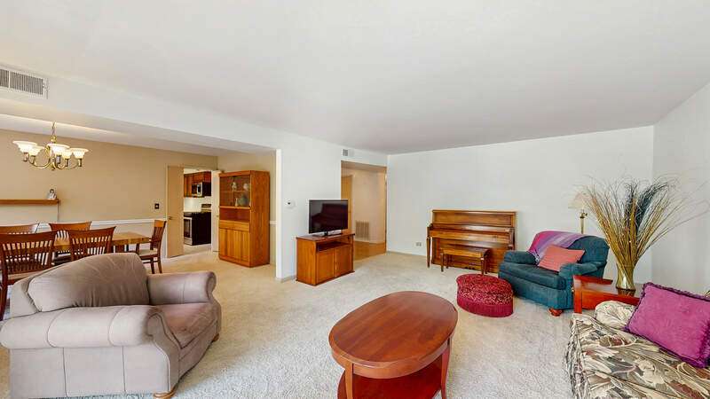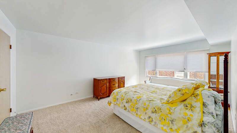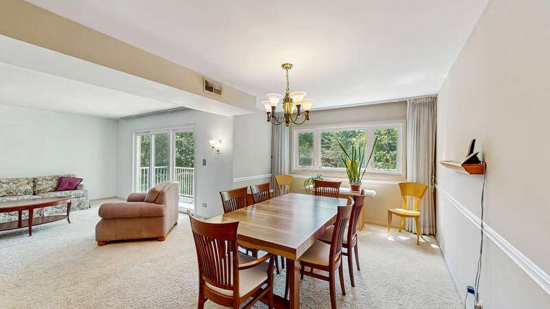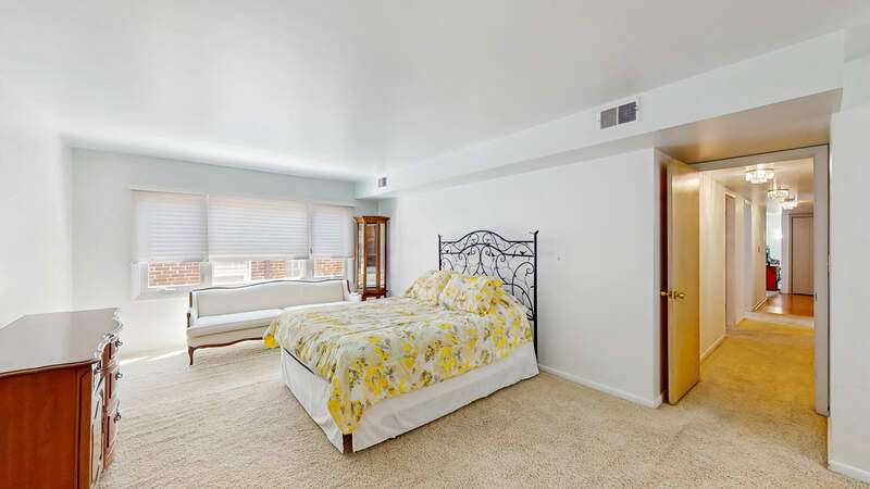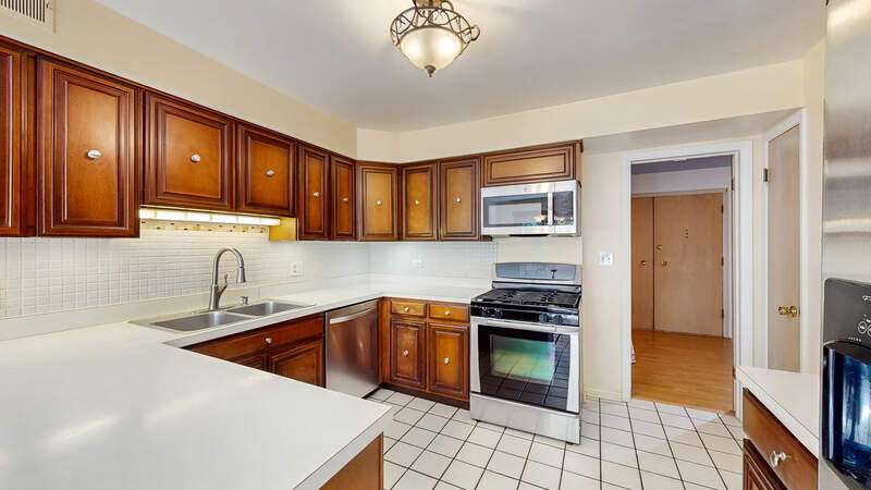 Bright and spacious 3 bedroom 2 bath condo in River Forest elevator building! Double door entry to large foyer. Generous living room with west facing balcony. Separate dining room. Large wood cabinet kitchen with plenty of storage and an eating area/table space. The primary suite boasts a spacious bedroom, good closet space and dressing area, and full bathroom. 2nd full bathroom in hallway with additional 2 bedrooms. This unit lives like a ranch home. First floor laundry room and storage room. Exercise room. Two parking spaces - 1 garage space (#30) and 1 outside under cover(#23)! Convenient location near restaurants, grocery stores, and public transportation.