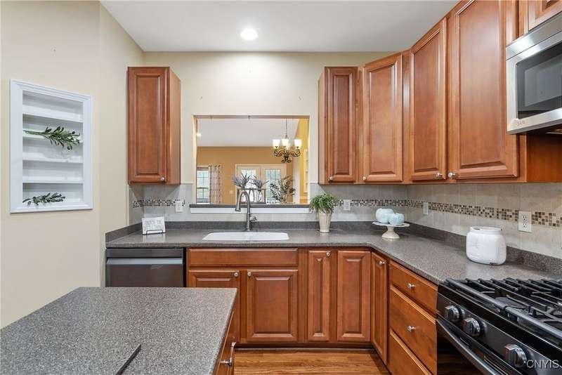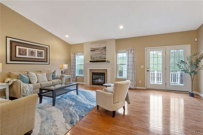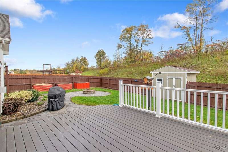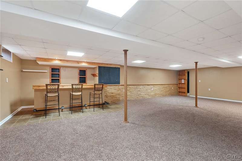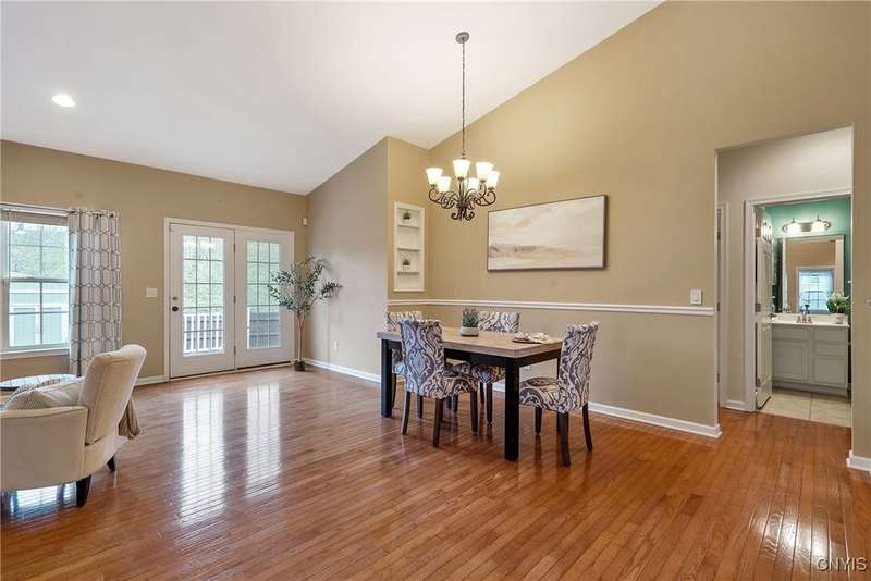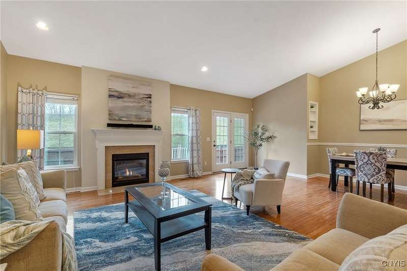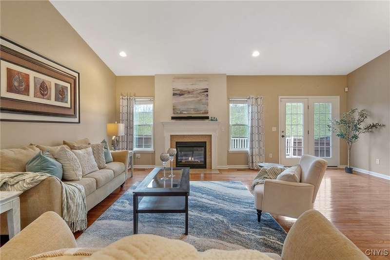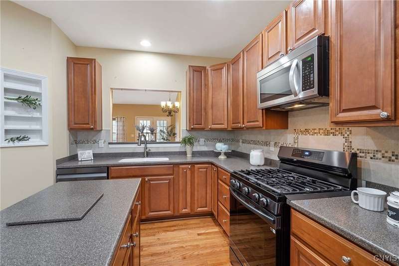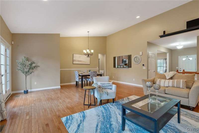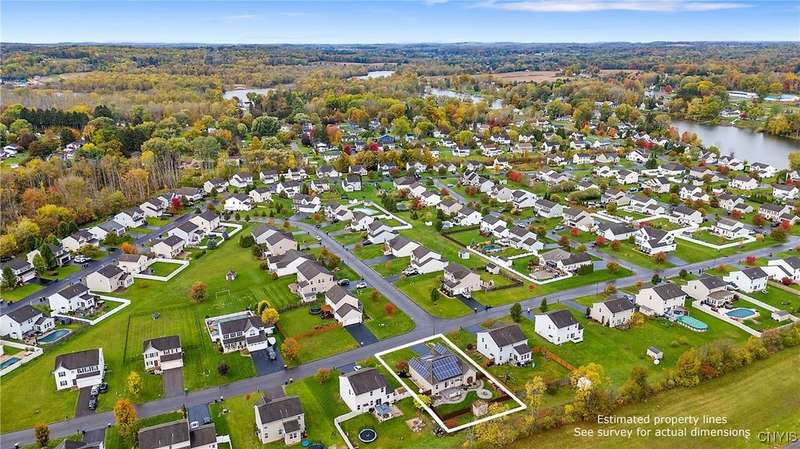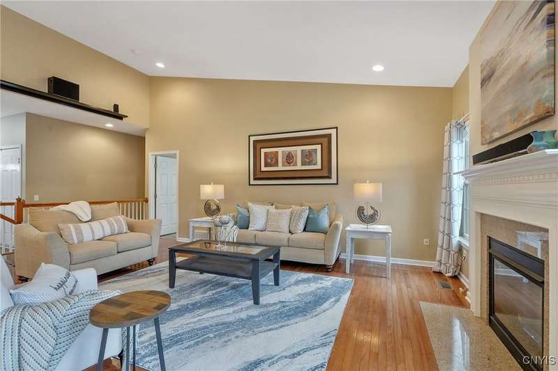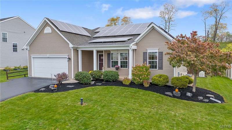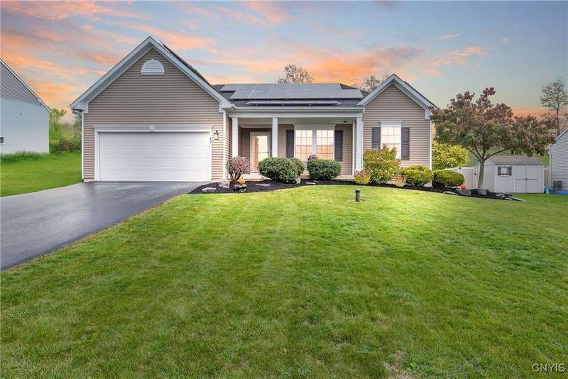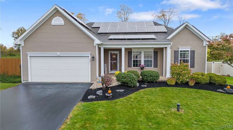 Discover this beautiful 4-bedroom, 3-bath ranch home in Harbor Heights?a perfect blend of comfort, efficiency, and style. With owned solar panels, providing low utility costs and tax incentives, plus a whole-house natural gas generator for year-round peace of mind, this home offers exceptional single-level living with plenty of space to relax and entertain.The double-wide driveway with an extra sparking space welcomes you. Pull into your attached two car garage with an epoxy coated floor! A charming front porch and standout curb appeal welcome you inside to a warm, inviting foyer. The well-designed kitchen features updated appliances, generous counter and cabinet space, convenient pull-out cabinet trays and a convenient pass-through to the great room?ideal for hosting or everyday convenience. Notice the built in curios that add charm and interest to this modern home! The spacious great room impresses with cathedral ceilings, genuine hardwood floors, a gas fireplace and seamless flow into the formal dining area.Step through the French door to enjoy the low-maintenance deck and beautifully hardscaped patio with a built-in fire pit, all within a fully fenced backyard with no homes behind!?perfect for outdoor gatherings or quiet evenings at home.The primary suite offers a peaceful retreat with its en-suite bath featuring a jetted tub. Two additional bedrooms, convenient first floor laundry and a full bath complete the main level.The fully finished basement adds exceptional living space, including a bar area, a "hidden" bedroom with egress window (behind the bookcase Murphy door!), an additional full bath, a workshop and abundant storage. (Total 2,634 sq ft includes finished basement.)Set on a fantastic lot in a prime location, this home is close to all amenities and just moments from the community park with a pavilion/BBQ area, basketball court, and playground?all within the award-winning Baldwinsville School District.A one-year home warranty is included for added peace of mind. Energy-efficient, meticulously maintained, and truly move-in ready?this Harbor Heights gem has it all!