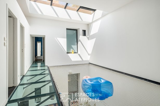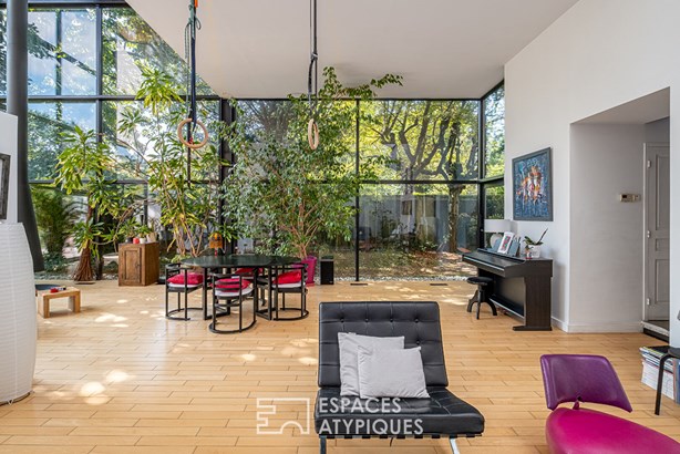 The living room, the true beating heart of the house, impresses with its 8-meter ceiling and its vast glass walls, giving a unique feeling of living outside while being inside. This space bathed in natural light offers a harmonious continuity with the surrounding garden, inviting a total immersion in nature without leaving the comfort of your home.