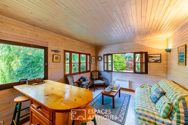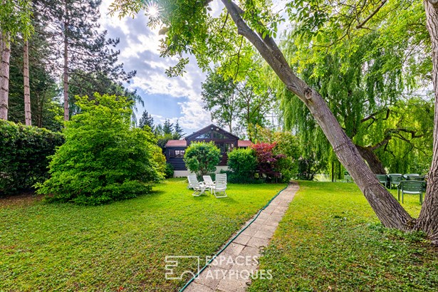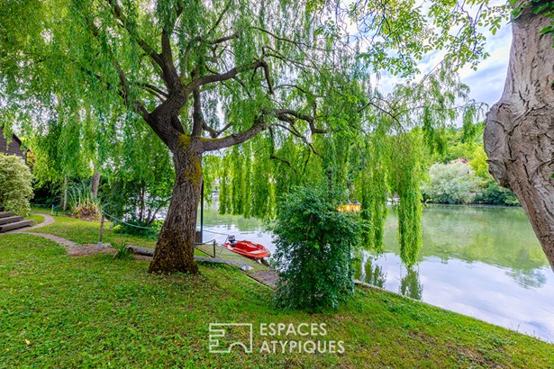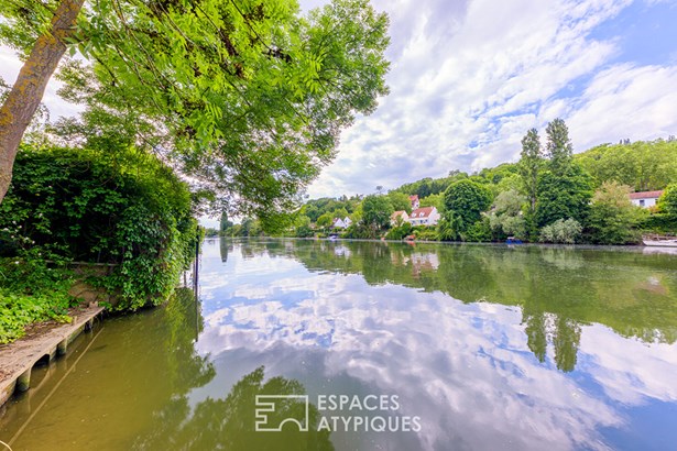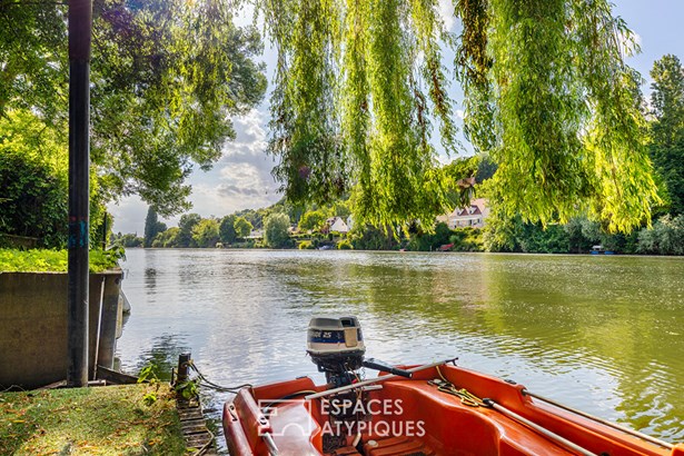 The exterior is not to be outdone with a beautiful terrace that will allow you to fully enjoy the view of the Seine. This chalet is associated with shares in a civil company, so it is possible to move in very quickly and no notary fees are required. Mortgages are not available for this type of investment. Access: A13, A14 or A15. Juziers train station for Paris Saint-Lazare (50 minutes via line J) is a 15-minute walk from the pier.