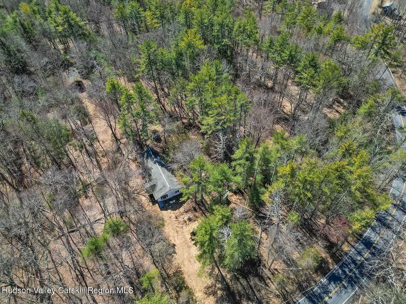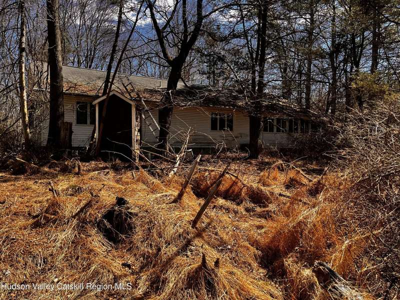 Stone walls line the beautiful wooded lot, featuring rock outcroppings and glacial boulders. Walk through the woods to truly feel the magic of this land. The home, built in 1979, has electric, well, and septic system; however, the condition of all systems is unknown, as the house has been vacant for years. A driveway is already in place. The house is set back from Glasco Turnpike, with the garage situated further back. The lot is being sold as-is and significant clean up is required. The lot offers a serene and private atmosphere while remaining close to shopping and dining. The location is convenient: just an 8-minute drive to Woodstock town center, a 12-minute drive to Saugerties town center, and a 15-minute drive to shopping in Kingston. Opus 40, The Woodstock Day School, and Zena Recreation Park Swim and Tennis Club are all just minutes away.