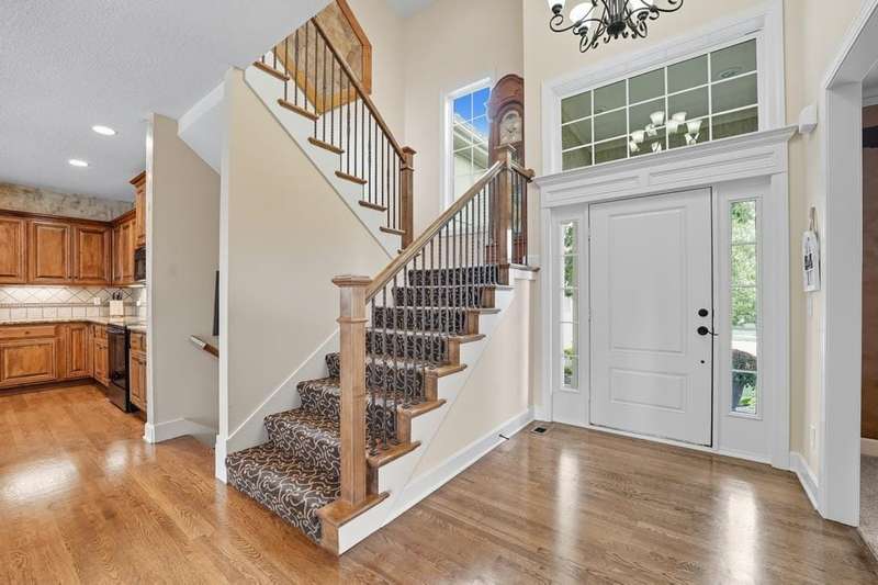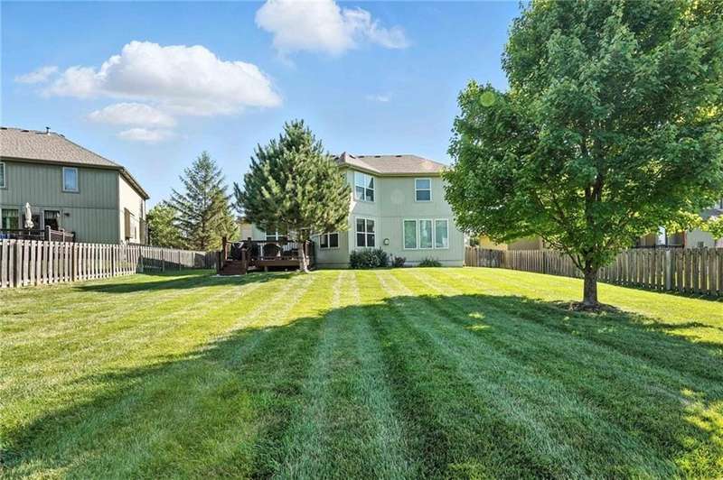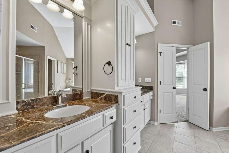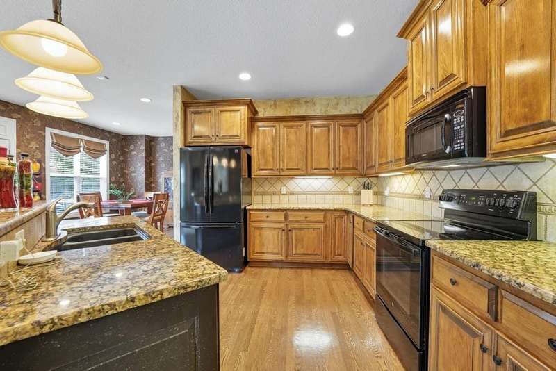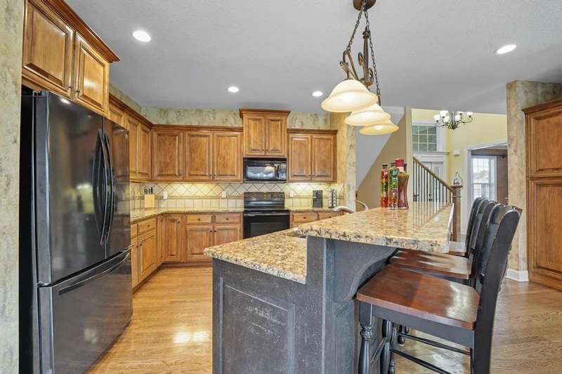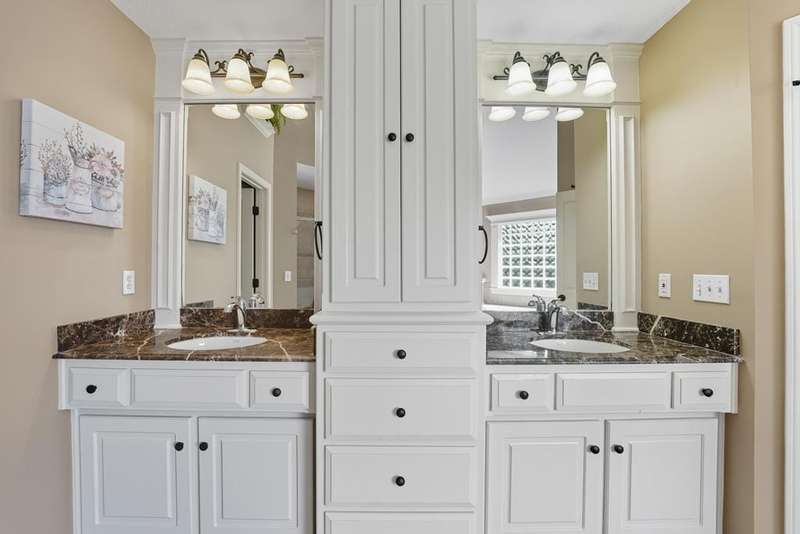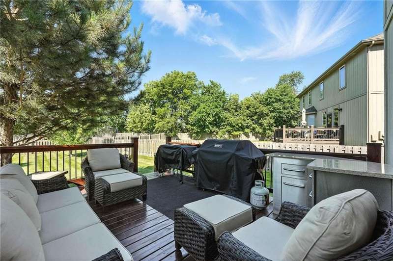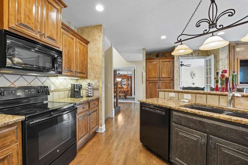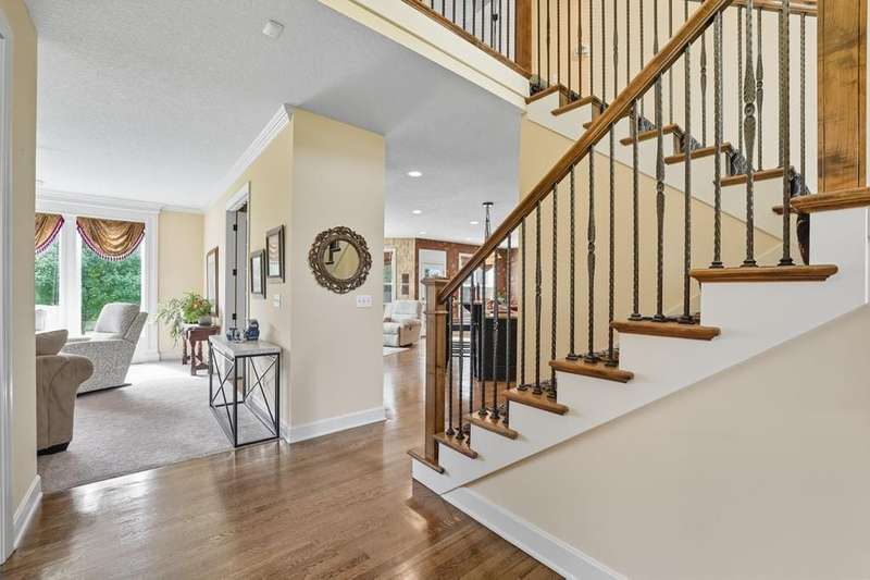 Exceptional home on gorgeous lot with mature trees, established landscape. Lovely front porch leads to 2 story entry with wood floor, through to hearth room, kitchen & breakfast room. Open floor plan offers formal dining off entry, living room with fireplace & wall of windows providing views of lush backyard. The hearth room has 2nd gas fireplace, large windows extending through the breakfast room bringing beautiful natural light. Kitchen has large center islands, granite counters, updated appliances. Full glass door leads to large deck & only couple steps down to backyard. Wide staircase with large window at landing, leads to 2nd level. Primary suite has space for sitting room & private, luxury bath-tiled floor, jetted tub, double vanity w/granite top, large tiled shower & fantastic walk-in closet! Guest suite offers privacy with large bedroom, walk-in closet & private bath. 2 additional bedrooms at opposite end of home are spacious, 1 having large walk-in closet, other offering 2 closets. These bedrooms share a bathroom with double vanity & tub/shower. Large laundry room on the 2nd level has great built ins with large sink, storage cabinets & long folding table. Lower level is finished with very large family room with stone accent wall, egress window, parallel wet bar with granite countertops and raised bar seating, plenty of room for media, game table. 5th bedroom is very spacious with large walk-in closet. 4th full bath has granite topped vanity, large tiled shower & tile floor. 2 large storage spaces are unfinished in the lower level. Garage (29'W x 21'D) has plenty of room for full size truck/SUV, storage/workbench space, tall ceilings provide opportunity for additional storage. Updated HVAC/humidifier & hot water heater. Unfinished storage in LL 11x14. 4th full bath in LL has granite topped vanity, tiled shower.