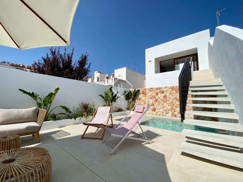 Beautiful duplex apartment on the first floor of 113 m², plus 28 m² of annex and 50 m² of patio with pool in the centre of Ciutadella. The property, which has been recently renovated, has high-quality finishes and presents a modern yet warm style. Once inside we find an entrance with lots of natural light, two double bedrooms with built-in wardrobes (one of them with a private bathroom), a bathroom, a kitchen open to the living-dining room and access to a covered terrace with two storage rooms on both sides. From the terrace there is access to a large 50 m² patio with private pool and chill out area, ideal for spending long evenings with friends and family or simply relaxing on one of the sun loungers. At the end of the patio there is a 28 m² annex with a single room with a kitchen-dining room and a bathroom. The renovation has been done with great taste, thinking about every detail. The duplex has heating and air conditioning through ducts, an aerothermal, home automation and double-glazed Climalit windows. An ideal property to live in all year round or spend long periods of time, within reach of all the services that the city offers.