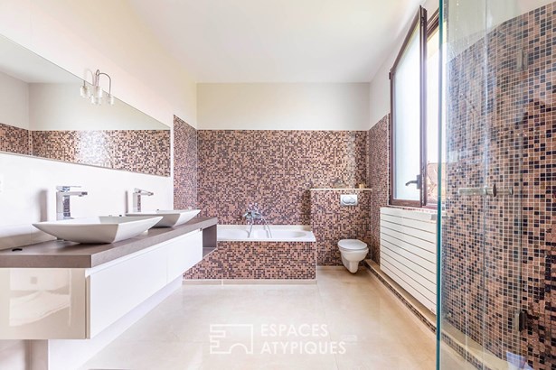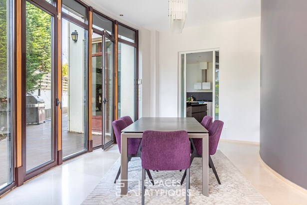 The kitchen, resolutely contemporary and equipped with a spacious scullery, integrates fluidly into the dining room with rounded lines, creating a living space that is both convivial and refined.