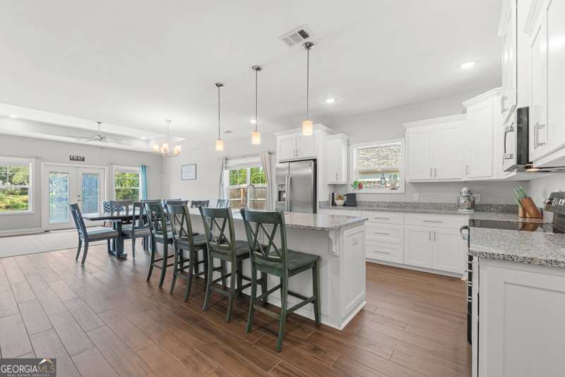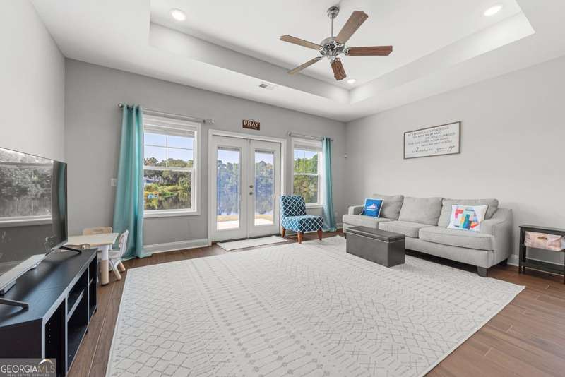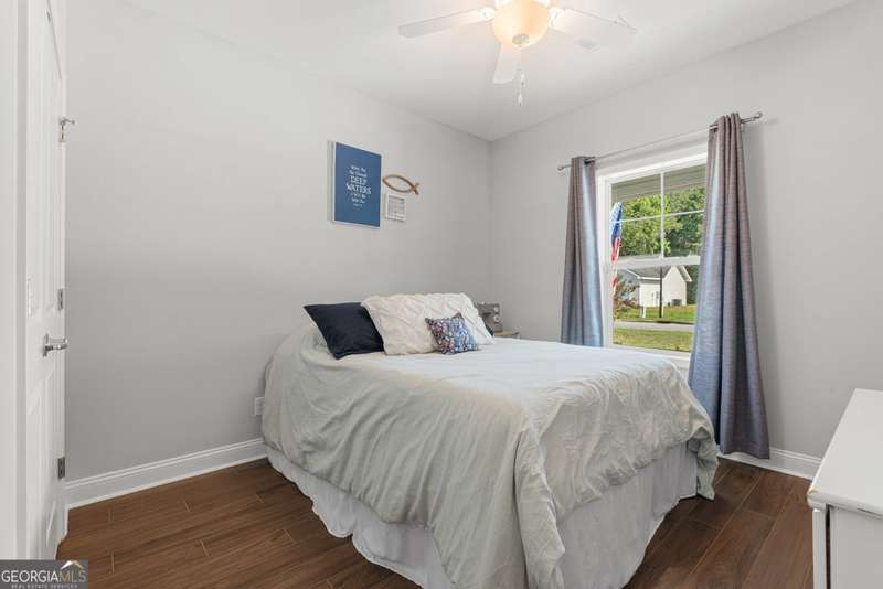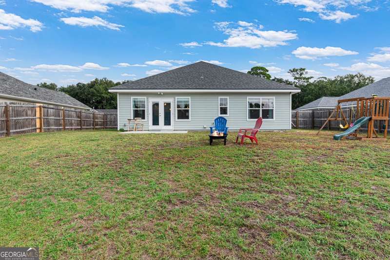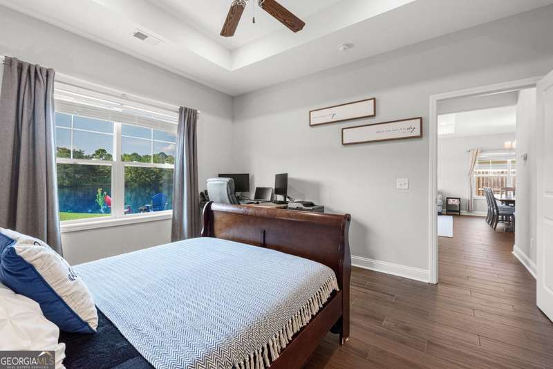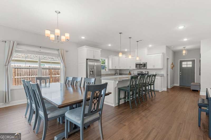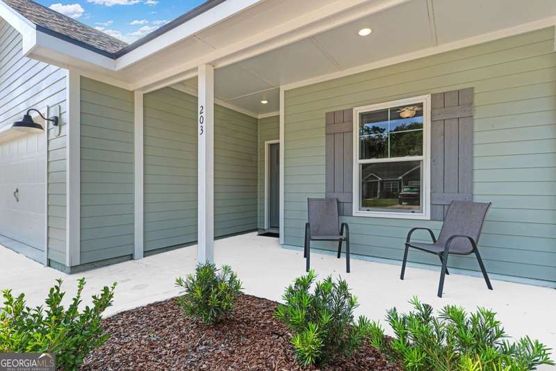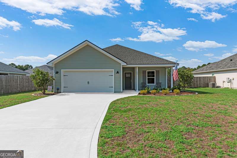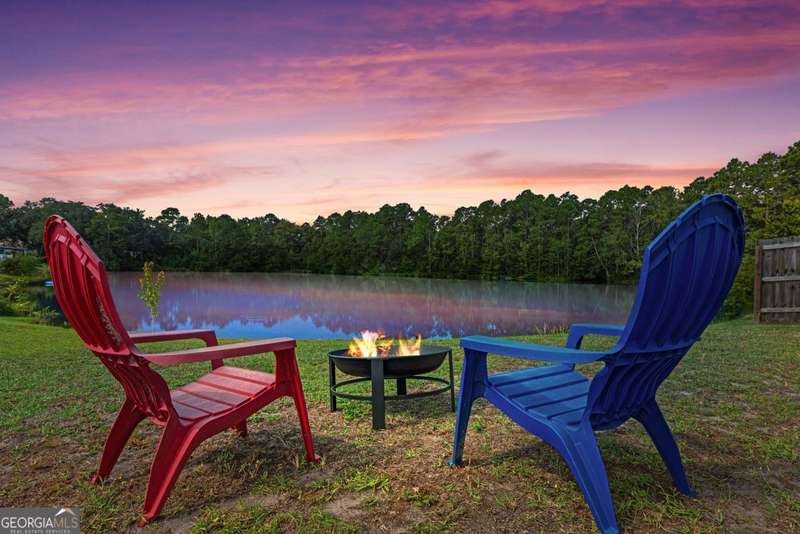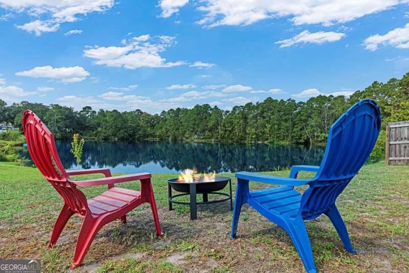 Wake up to peaceful water views every day in this immaculate lakefront home! Overlooking a 2.3-acre pond in St. Marys, this 3 bedroom, 2 bath home offers no HOA, Flood Zone X (no flood insurance required), and a convenient location just minutes from Kings Bay Naval Base, downtown waterfront, shopping, and dining. Inside, the open floor plan features wood-grain plank tile throughout, foyer entry, recessed lighting, smooth ceilings, wide baseboards, and ceiling fans in all bedrooms and the living room. The fully equipped kitchen shines stainless steel appliances, white shaker cabinets with crown molding and soft close hinges, granite countertops and a central island with breakfast bar (lots of counter space). The large laundry room adds convenience with built-in cabinets, a window for natural light, and extra space for shelving or baskets. The primary suite includes a tray ceiling, spacious walk-in closet, linen closet, and a private bath with raised double vanities, granite counters and water closet with a cabinet. Additional recessed lighting in the laundry and guest bath provide a bright, modern feel throughout. Built with 26 exterior walls, concrete composite lap siding, and an architectural shingle roof, this home is designed for durability and easy maintenance. Outdoor living spaces include a welcoming front porch and an open back patio overlooking the lake. A Hydro 5 water system is also included. This home has been lovingly maintained and is move-in ready for its next owner!