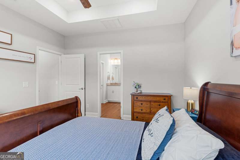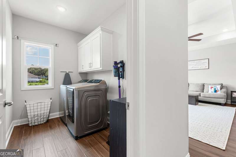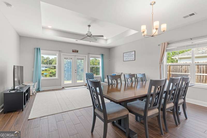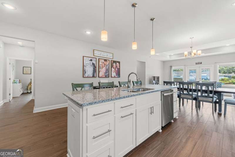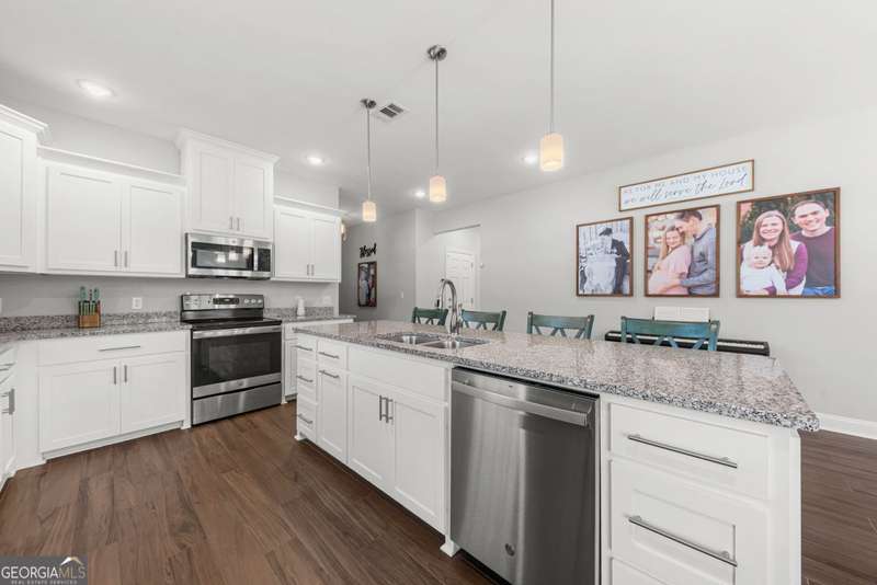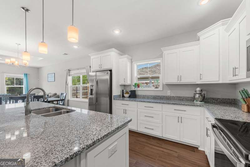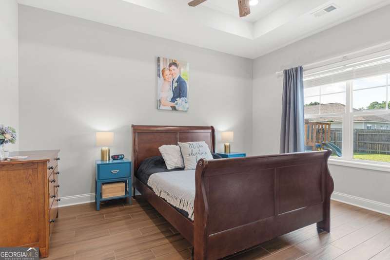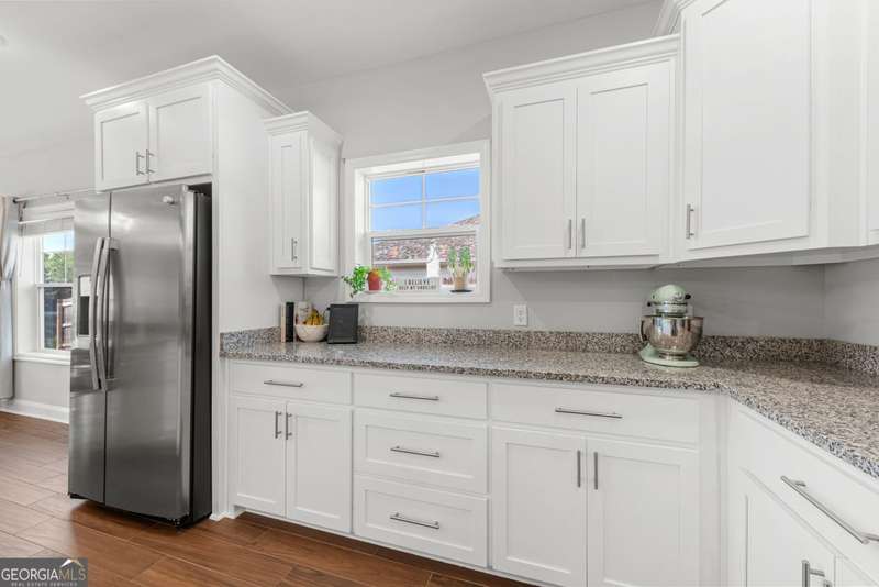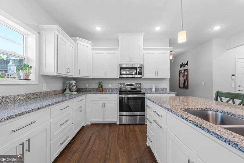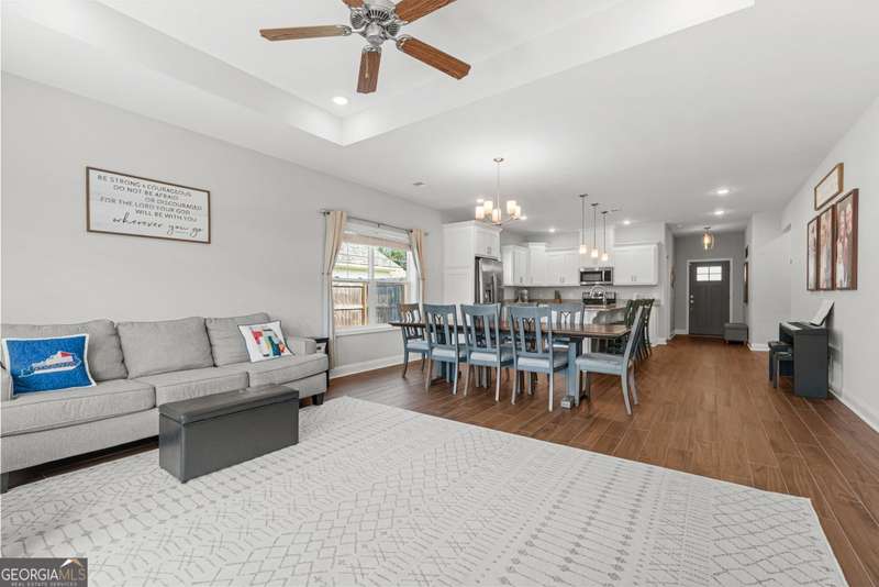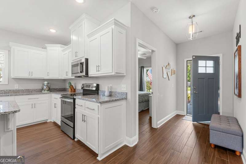 Wake up to peaceful water views every day in this immaculate lakefront home! Overlooking a 2.3-acre pond in St. Marys, this 3 bedroom, 2 bath home offers no HOA, Flood Zone X (no flood insurance required), and a convenient location just minutes from Kings Bay Naval Base, downtown waterfront, shopping, and dining. Inside, the open floor plan features wood-grain plank tile throughout, foyer entry, recessed lighting, smooth ceilings, wide baseboards, and ceiling fans in all bedrooms and the living room. The fully equipped kitchen shines stainless steel appliances, white shaker cabinets with crown molding and soft close hinges, granite countertops and a central island with breakfast bar (lots of counter space). The large laundry room adds convenience with built-in cabinets, a window for natural light, and extra space for shelving or baskets. The primary suite includes a tray ceiling, spacious walk-in closet, linen closet, and a private bath with raised double vanities, granite counters and water closet with a cabinet. Additional recessed lighting in the laundry and guest bath provide a bright, modern feel throughout. Built with 26 exterior walls, concrete composite lap siding, and an architectural shingle roof, this home is designed for durability and easy maintenance. Outdoor living spaces include a welcoming front porch and an open back patio overlooking the lake. A Hydro 5 water system is also included. This home has been lovingly maintained and is move-in ready for its next owner!