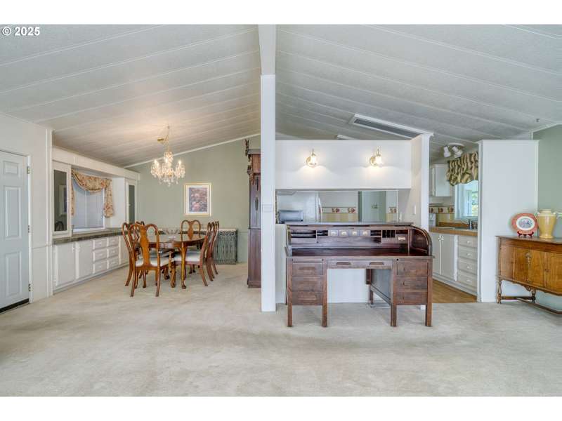 We're back on the market due to buyer not able to sell their home. PRICE INCLUDES $16,000 park buy-in membership! Vaulted ceilings, wall of windows and stunning landscaping - A true Indoor-Outdoor Retreat! This 1344SF home offers three bedrooms/2 full baths. The spacious living room with vaulted ceilings and electric fireplace opens to a formal dining room with built-ins. Perfect for entertaining. The backyard backs to a green space and is fully fenced with blueberry bushes, wisteria, a raised garden bed. Sit on your adorable covered deck with your morning coffee or choose to sit in your backyard area. A/C, carport and neighbors only on one side. Washer/dryer and refrigerator included.