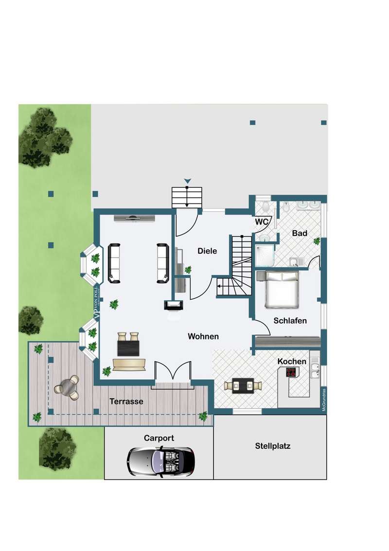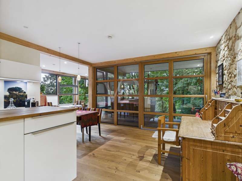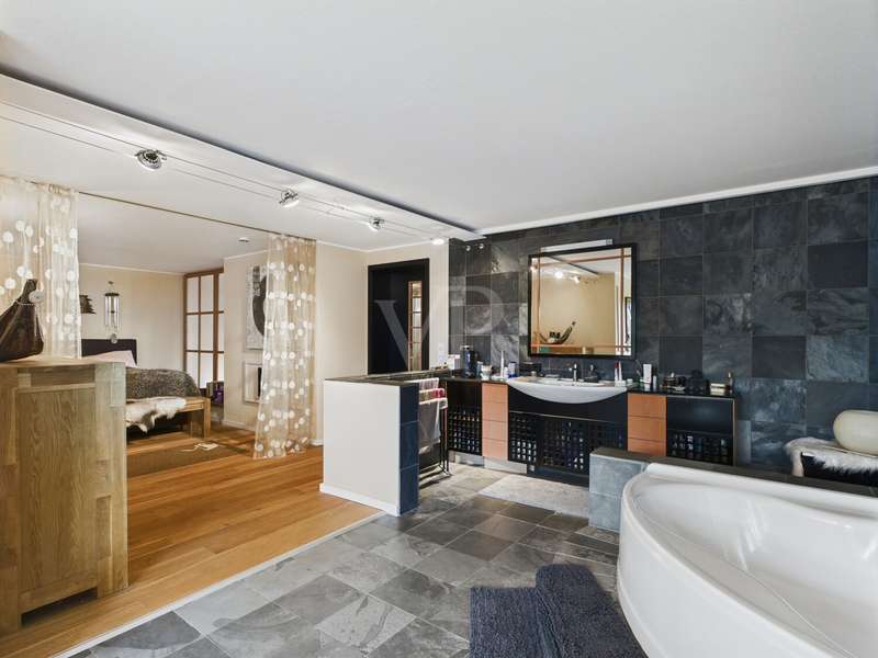 An exceptional property awaits you here: - a paradise for a family that wants to feel completely at home - for those seeking peace and quiet who appreciate privacy - for artists who want to work in their own studio - for the self-employed who need office or practice space. An oasis that allows for many different living and usage concepts. Here, modern, energy-efficient technology is combined with Mediterranean influences in the architecture, furnishings and interior. The first floor of the main house is dominated by a whitewashed wood-burning stove, which provides the ground and upper floors with a cozy warmth and a pleasant indoor climate during the cold months. This keeps additional energy costs to a minimum. A cozy living area with brick seating and lounging elements awaits you next to the wood-burning stove. Here you can spend relaxed, cozy evenings. The living/dining area and kitchen flow seamlessly into one another and you have access to the inviting, partly covered wooden terrace and the beautifully landscaped, secluded garden. On the first floor there is a spacious bedroom with cozy oak floorboards and an adjoining Mediterranean bathroom with a walk-in shower. The WC is separate and can also be reached from the hallway. An open staircase leads from the hallway to the gallery on the upper floor. This spacious, light-flooded, gable-height loft with floor-to-ceiling windows currently serves as a bedroom. The loft can easily be divided into two separate bright rooms if required. There is another room on this floor that could be used as an office or children's room. The converted basement can also be reached from the first floor via an open staircase. Here you will find a separate living/sleeping area with an integrated bathroom and access to the garden. This spacious feel-good space would be ideal as a living area for older children, a guest room, hobby room or study. The apartment building is a dream home for 1 or 2 people with a modern kitchen, bright bathroom with walk-in shower and a loggia for daydreaming and relaxing. A living space for older children or grandparents would also be conceivable here. Thanks to the pleasant and light-flooded atmosphere, these rooms are suitable as a practice or therapy room. This gives you the opportunity to combine living and working on one property. The varied and lovingly landscaped garden offers you sunny and shady spots to celebrate with guests or relax and read a book in the pavilion. Children have plenty of space to play and discover. The properties are located in a mature residential area in a quiet, central location. You can run everyday errands on foot. You will love living here, close to the city but with privacy that cannot be seen. The two exceptional properties are located on one plot and can only be sold together. Are you interested in this energy-efficient property? Then send an inquiry by email or call 0179-2274038.