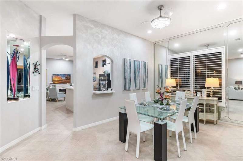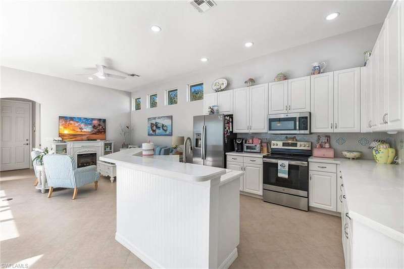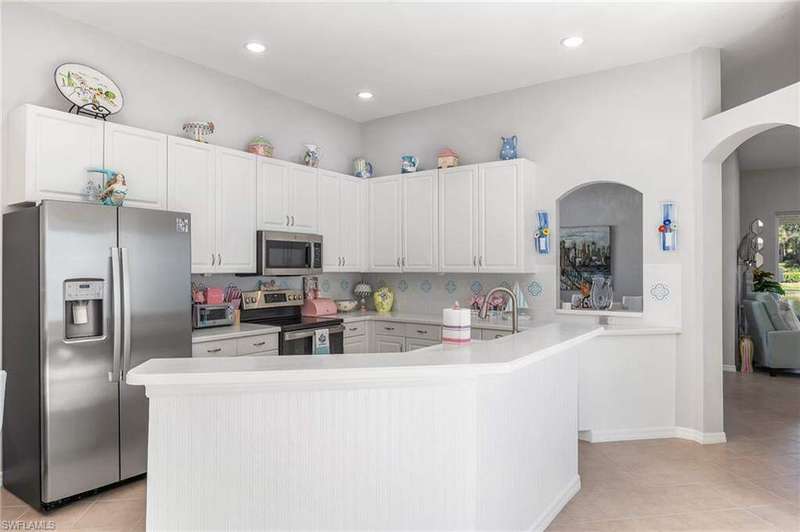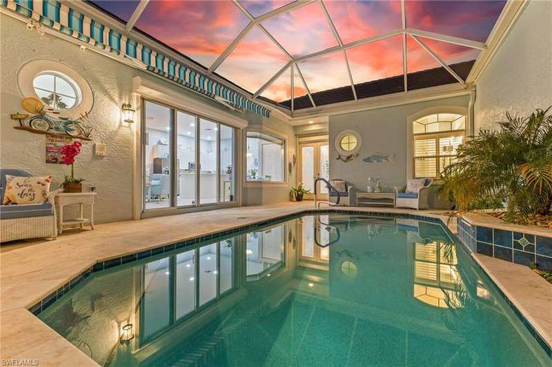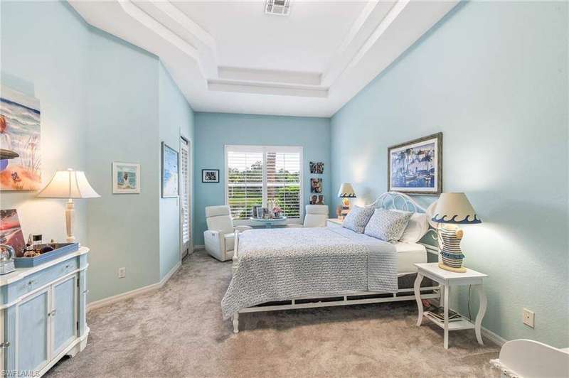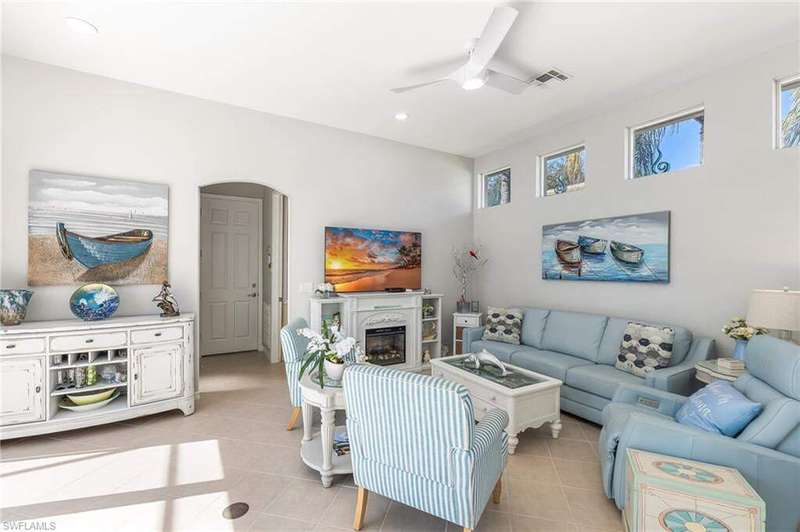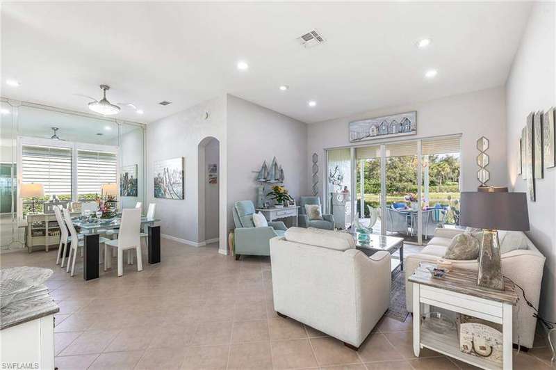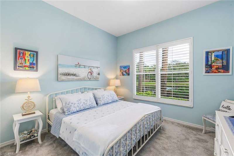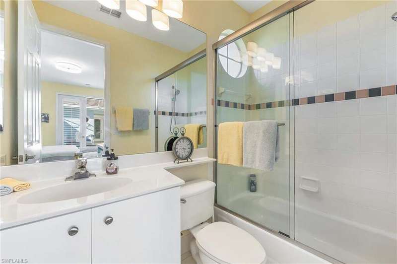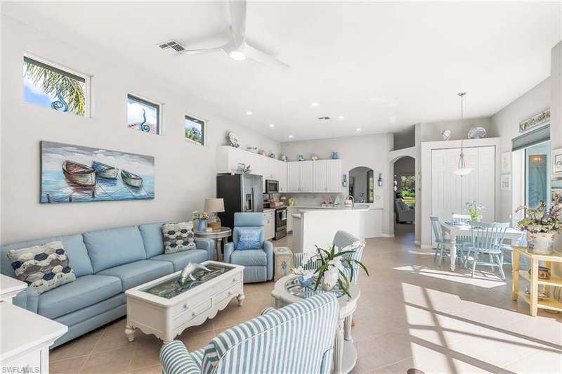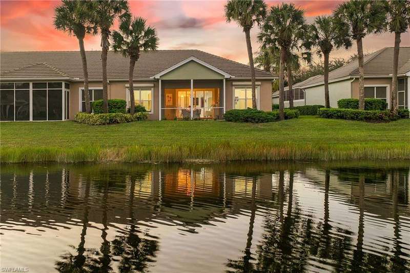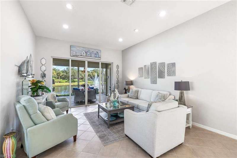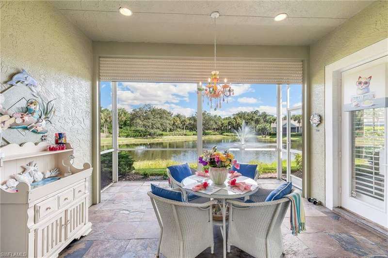 WELCOME TO YOUR HAPPY PLACE.........Rarely available, attached one-story villa, with 2-car garage, lives like a single family home, but has condo ownership w/ insurance, roof replacement, exterior painting, landscaping and major repairs covered by the Association. The light and airy open floor plan features a coastal, island-style design with soothing shades of blues & gray + whimsical tropical hues throughout. Kitchen boasts clean white cabinets w/ rollout drawers, beautiful decorative tile backsplash, newer stainless steel appliances + optional breakfast bar seating. This bright and sunny end unit features lots of windows providing natural light; plantation shutters; recently replaced roof, water heater and AC; a courtyard w/ newer pool + deck partially shaded by a cheerful sunbrella rollout canopy; and electric hurricane shutters w/ storm protection throughout. The living room and extended rear lanai capture a beautifully landscaped lake setting and water feature - perfect for entertaining guests. A secluded casita off the courtyard pool serves as the third guest bedroom with private ensuite. Truly a coastal get-a-way you and your guests will love coming home to.