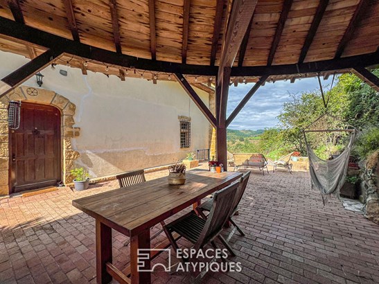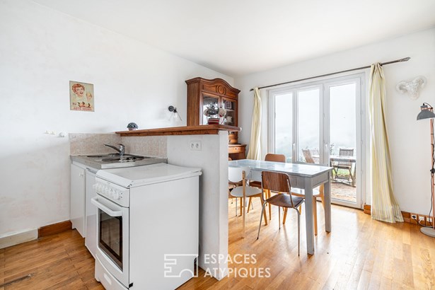 The main house opens onto a vast, bright living room, giving direct access to a large terrace overlooking the landscape. The semi-open kitchen ensures smooth circulation between the spaces. Upstairs, three bedrooms and a bathroom complete the property.
