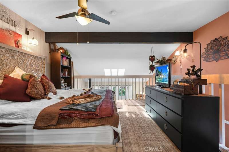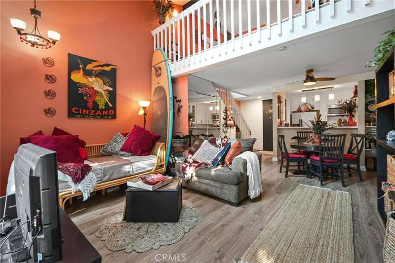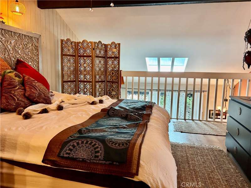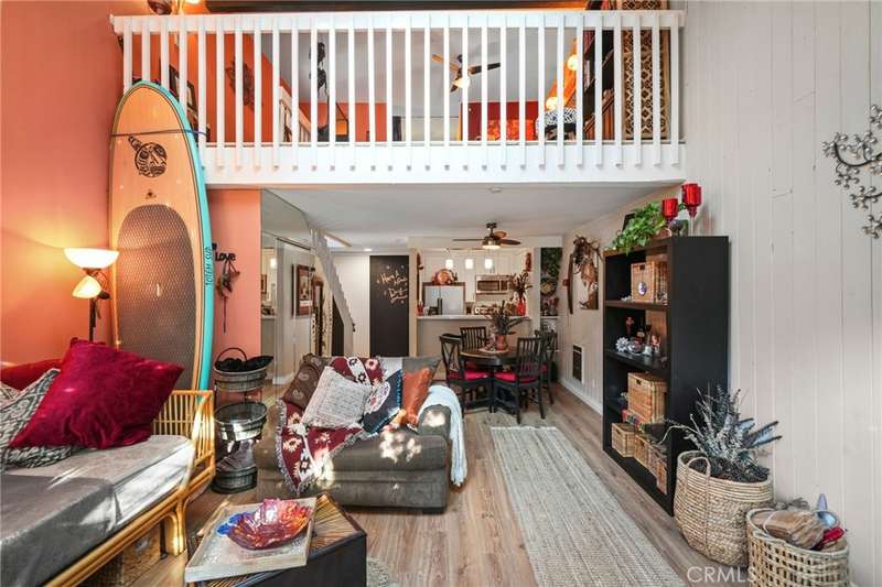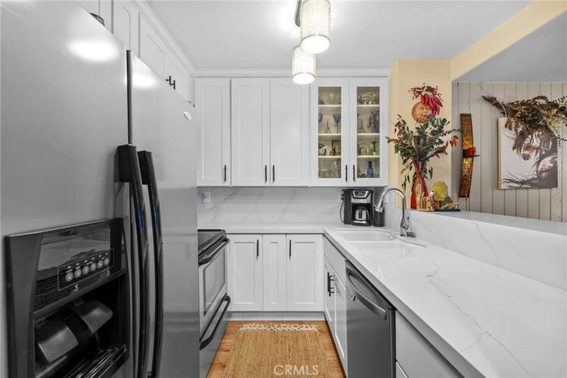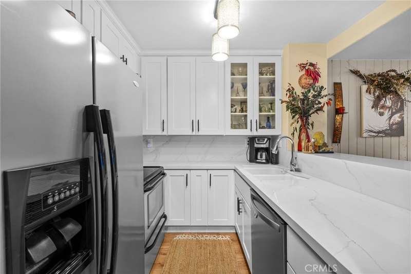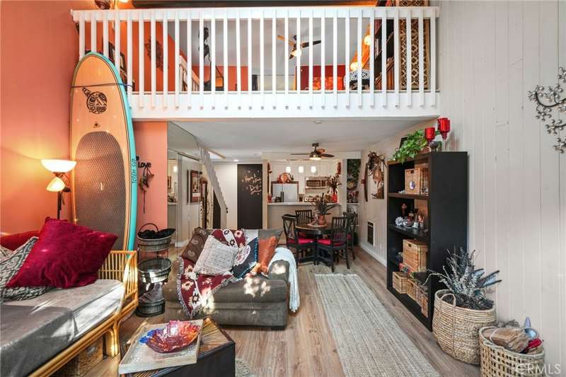 Step into this beautiful and peaceful end-unit 1-bedroom, 1-bath loft-style condo that blends modern upgrades with timeless charm. The first floor boasts a fully remodeled kitchen featuring sleek quartz countertops, new white cabinetry with soft-closing drawers, a stainless steel appliance package that includes a new dishwasher and counter-depth refrigerator and a convenient breakfast bar that flows seamlessly into the dining area. The spacious living room is enhanced by soaring vaulted ceilings and a Mid-Century Modern wood-burning fireplace, creating both warmth and character.
