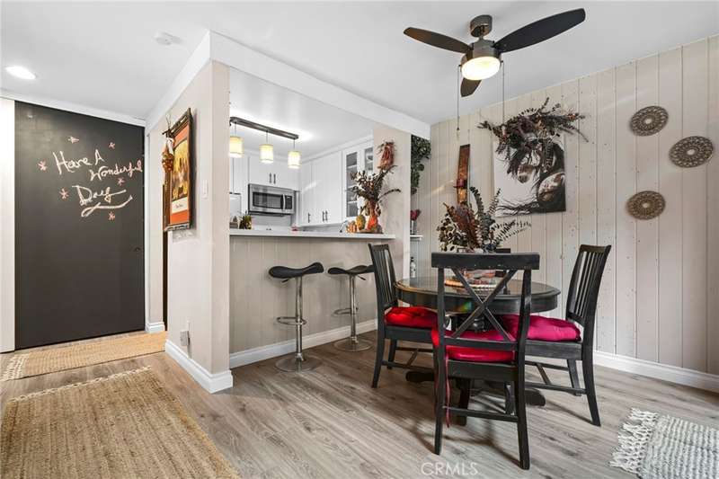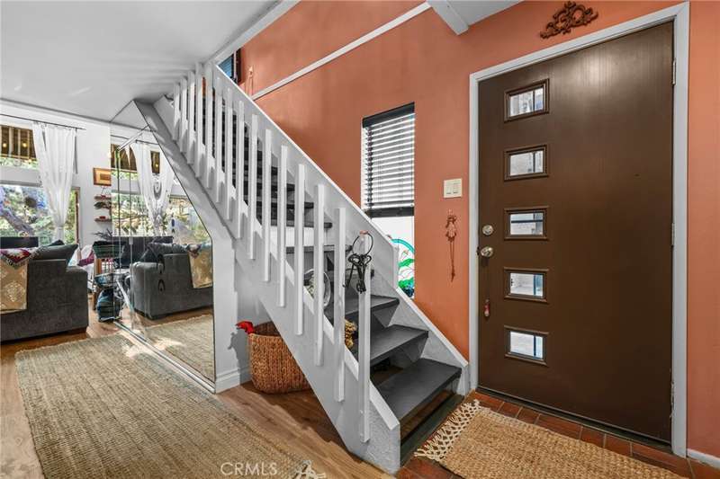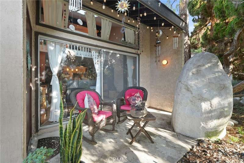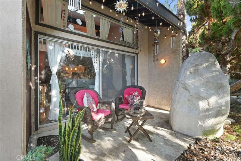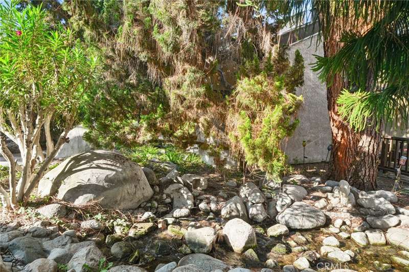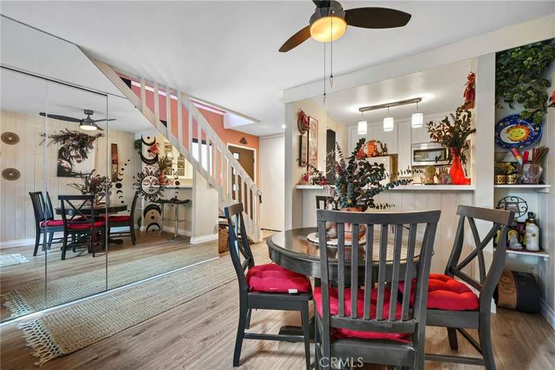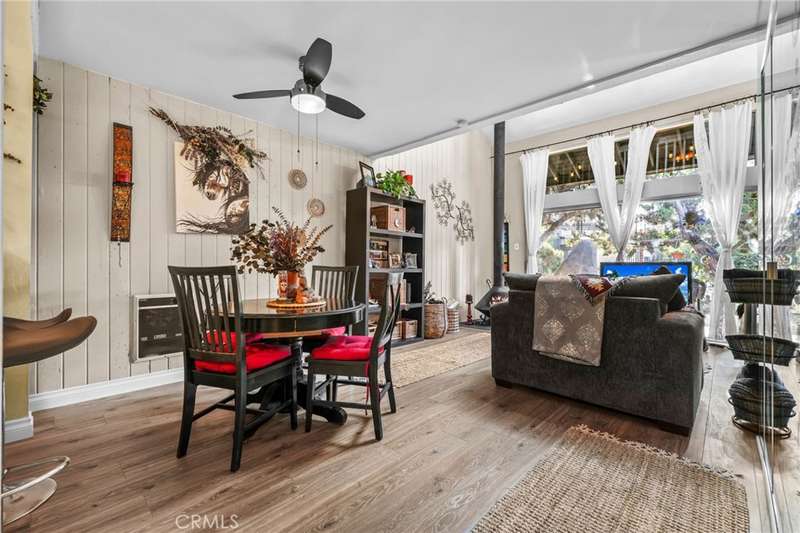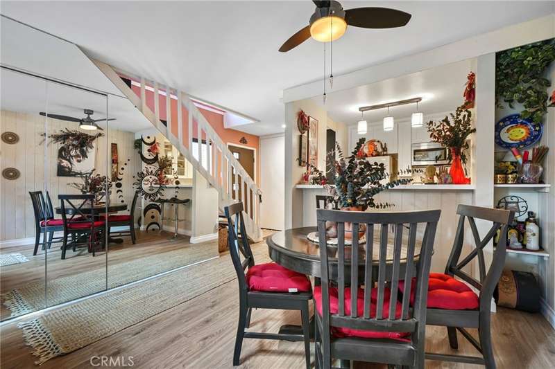 New wood-like laminate plank flooring runs throughout the main level, complementing the open layout. Additional conveniences include a skylight, pantry at the entry and a generous storage closet tucked beneath the staircase. Sliding doors invite natural light into the living space and open to a private patio with a babbling brook that runs nearby--perfect for outdoor dining or unwinding after a long day.