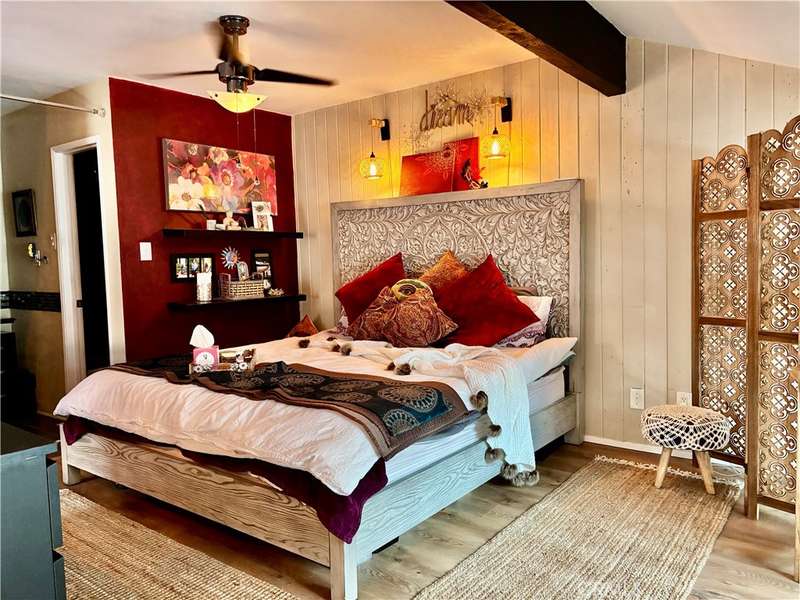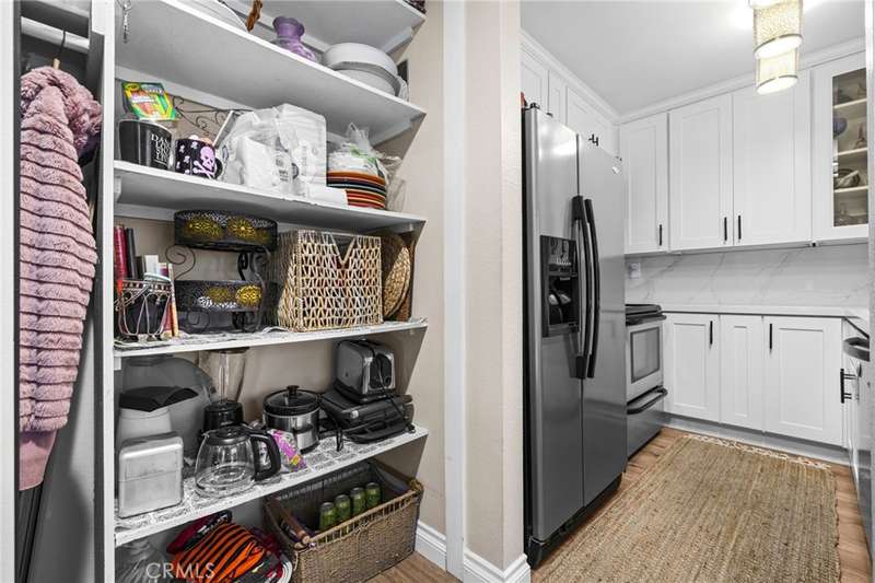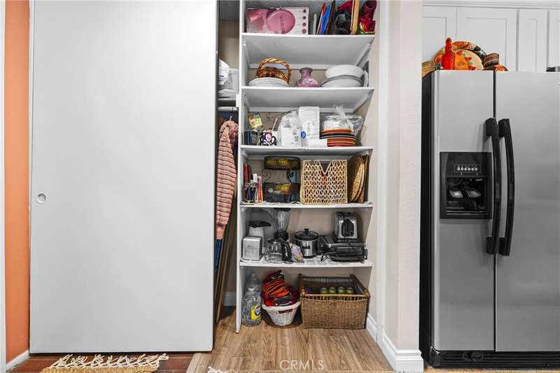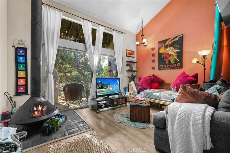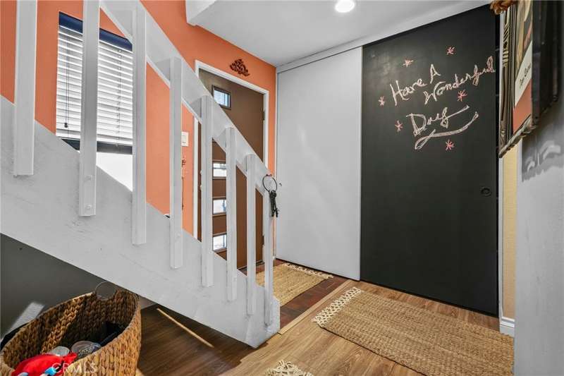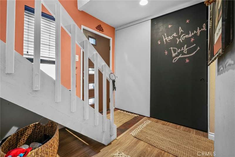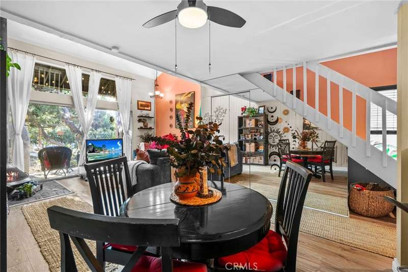 New wood-like laminate plank flooring runs throughout the main level, complementing the open layout. Additional conveniences include a skylight, pantry at the entry and a generous storage closet tucked beneath the staircase. Sliding doors invite natural light into the living space and open to a private patio with a babbling brook that runs nearby--perfect for outdoor dining or unwinding after a long day.