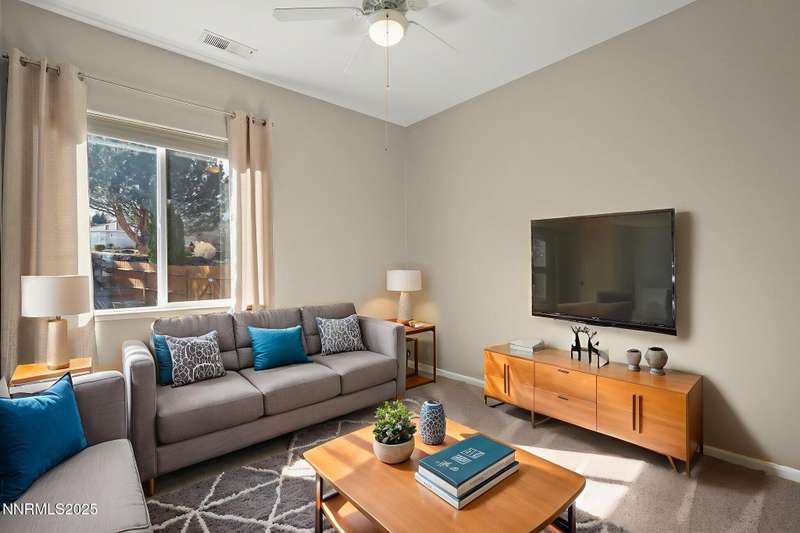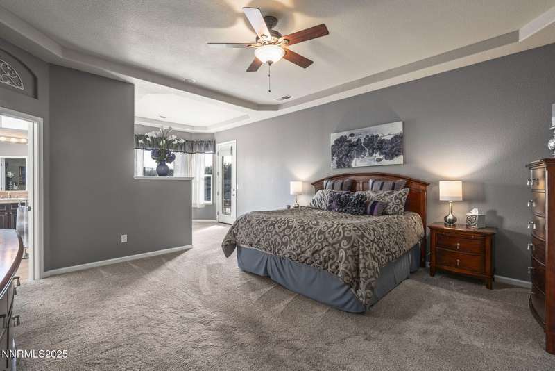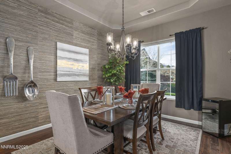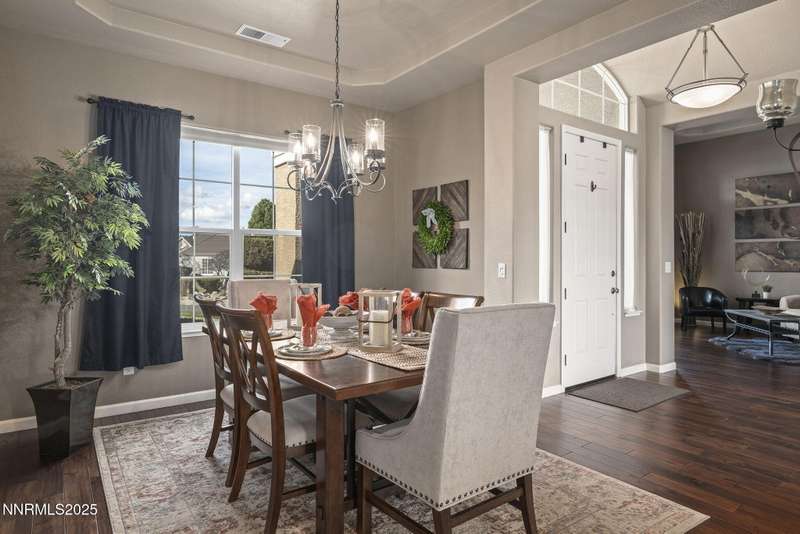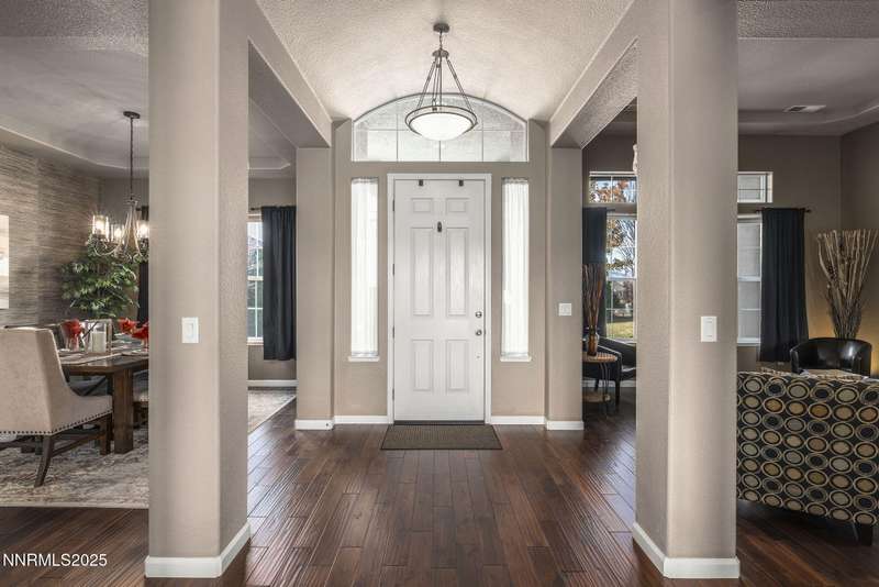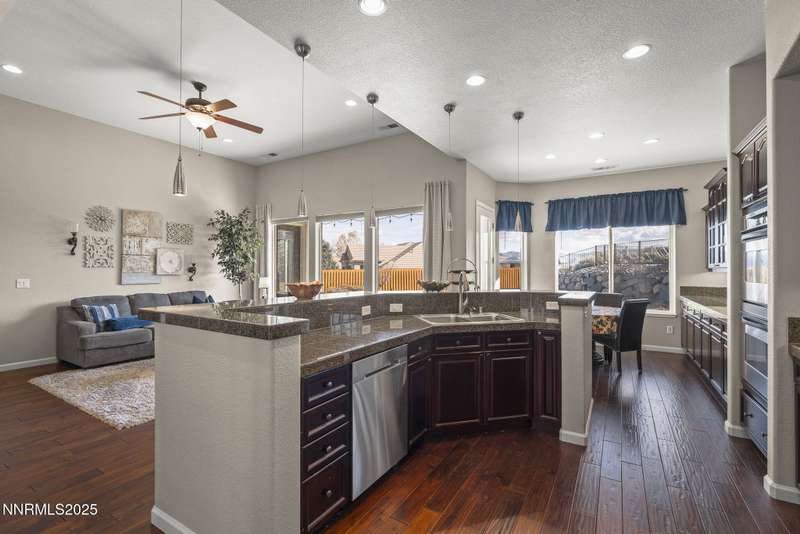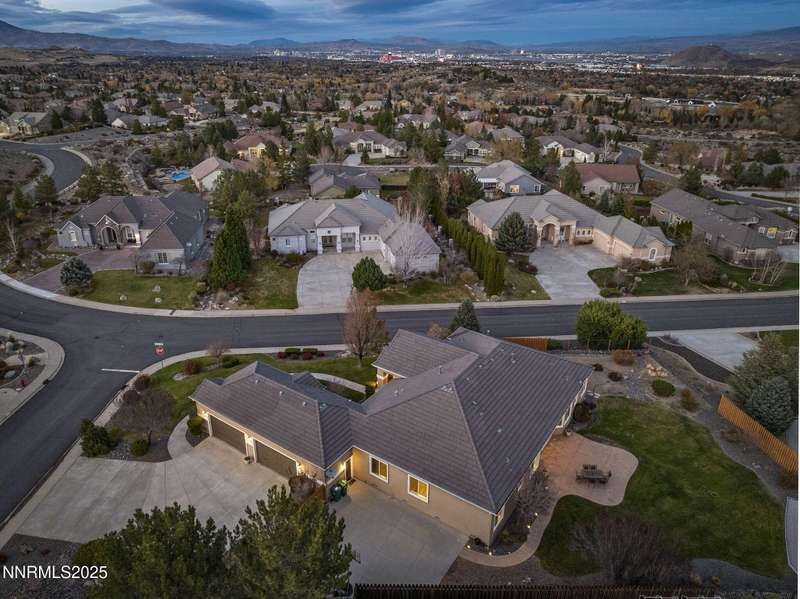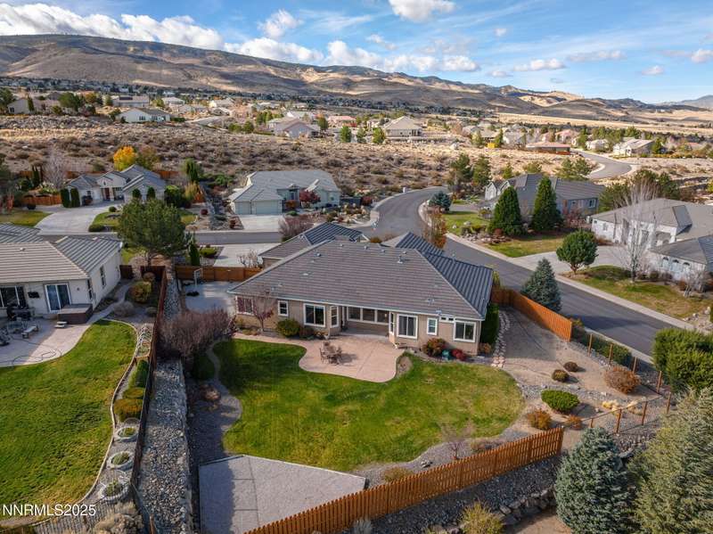 Exquisite single-owner home located in the highly sought-after Grandview community in Southwest Vistas, known for its privacy, serenity, and beautiful mountain surroundings. This meticulously maintained residence showcases exceptional upgrades, elegant finishes, and thoughtful design throughout. Enter through an impressive 12-ft barrel ceiling foyer, which leads to the formal living and family room that have matching 12 ft ceilings; 10 ft ceilings are found throughout the rest of the home, which enhances the open, airy ambiance. Stunning hand-scraped, distressed Spanish Walnut solid wood flooring throughout the main living areas. The spacious living room features a striking stacked-stone fireplace with a distressed wood mantle, creating an impressive focal point. The formal dining room is adorned with luxurious grass cloth wallpaper, adding warmth and texture. Just steps away, the kitchen includes premium GE Profile appliances, upgraded granite countertops, cherrywood cabinetry, a newer faucet, a Samsung dishwasher, and a GE Profile microwave. Down the hallway, a dedicated computer station with custom built-in cabinetry adds valuable workspace and organization. Retreat to the luxurious main suite, complete with a large soaking tub, a walk-in shower, double vanities, and an impressive 14' L x 7' W walk-in closet. All bedrooms include plush, high-quality carpet with upgraded padding for added comfort. Additional bathrooms feature custom cherrywood vanities and cabinetry paired with upgraded fixtures. Upgraded tile flooring enhances one of the baths and the laundry room. The full bath, located at the northwest wing of the home, includes newly installed plumbing hardware in the tub/shower combination. Fresh interior paint complements the home's timeless finishes, while the exterior has been professionally repainted using durable Sherwin-Williams Elastomeric paint. All exterior lighting has been replaced, and select interior fixtures have been updated, including newer fan lights in the main bedroom and family room. The home also includes a whole-home surround sound system and exterior eve outlets available for those choosing to add their own holiday lights. Outside, enjoy beautifully maintained landscaping and mountain views, along with an expansive 1,231 sq. ft. garage featuring built-in shelving and an extended driveway accommodating six to seven vehicles. Additional updates include a water heater approximately 10 years old. This home reflects true pride of ownership, luxuriously upgraded, exceptionally maintained, and completely move-in ready. A rare offering in a quiet, private community.