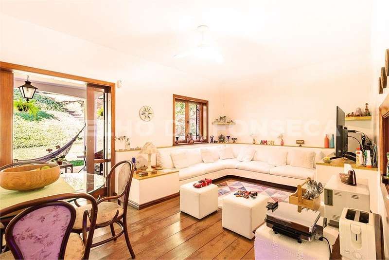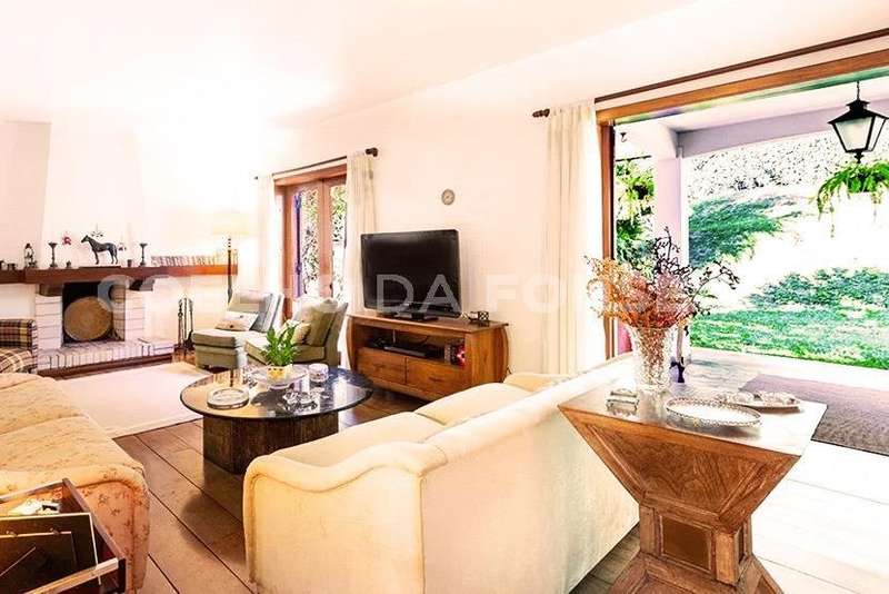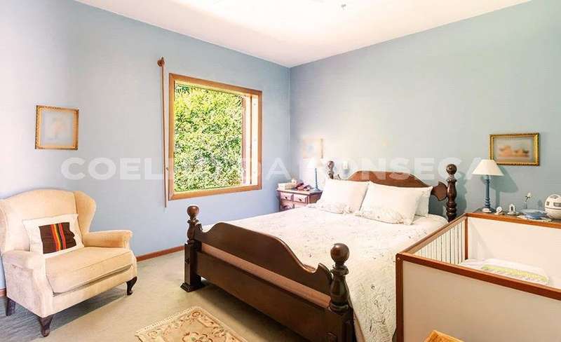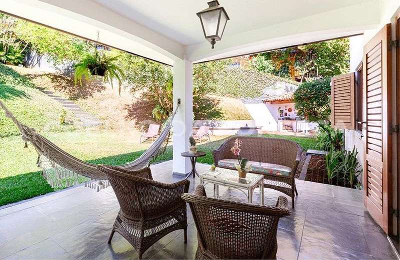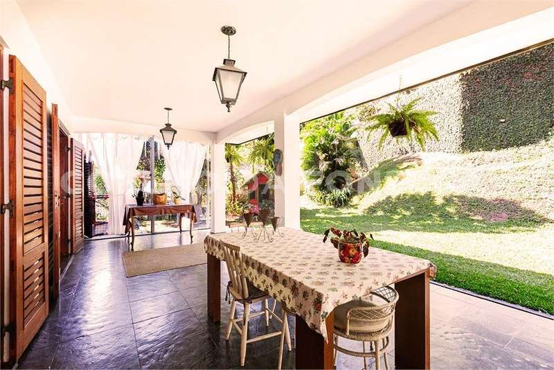 São 4 dormitórios, sendo 2 suítes, sala espaçosa com vários ambientes, em um amplo terreno verde e gramado de 860 m².